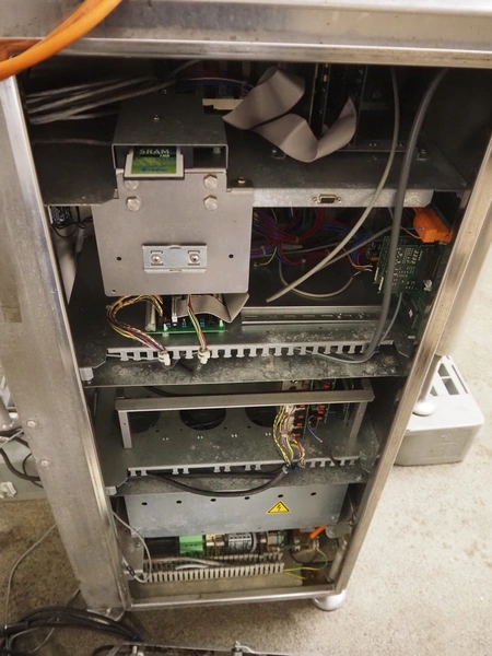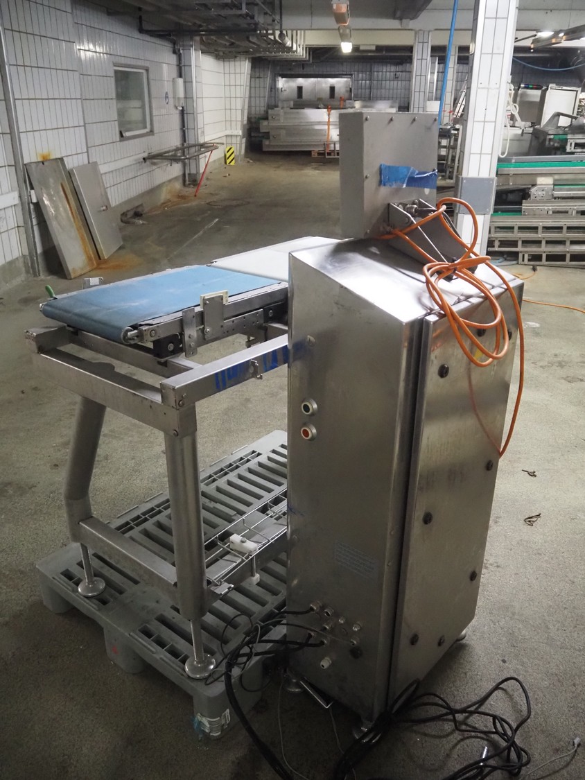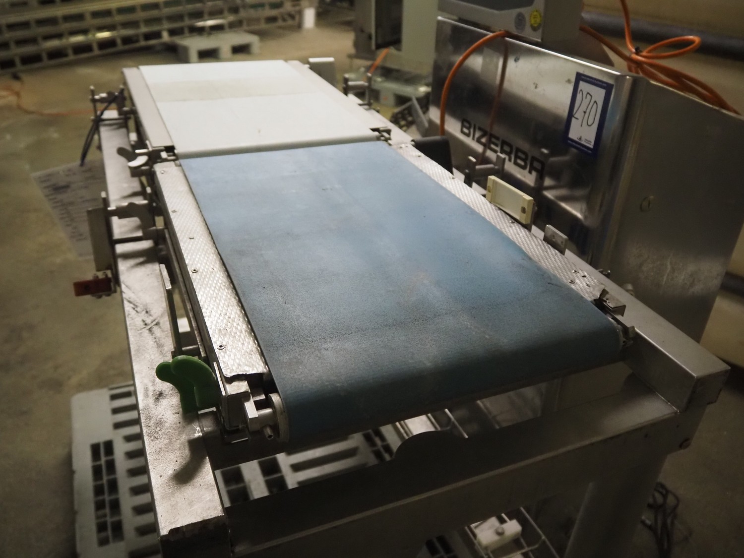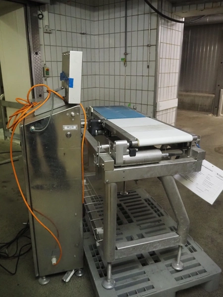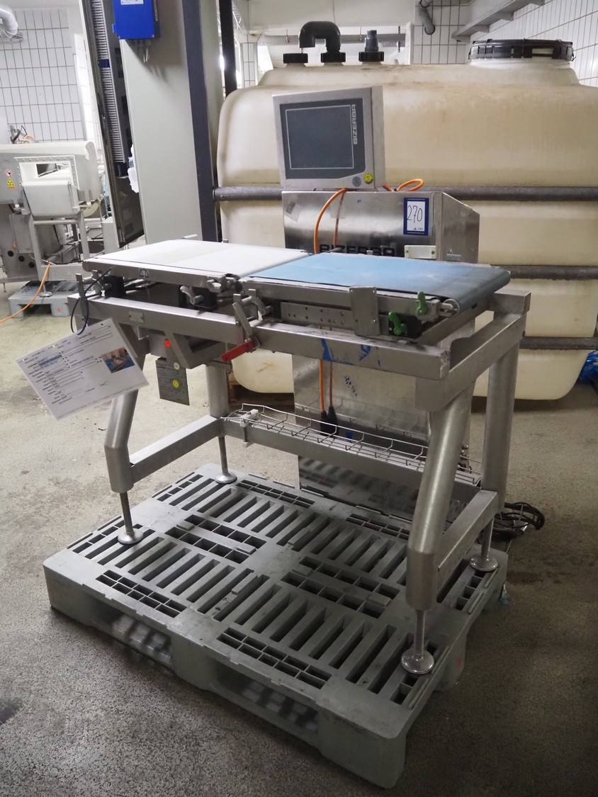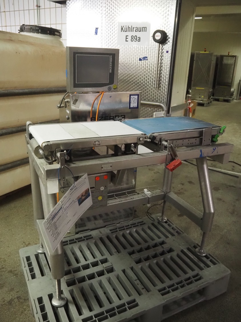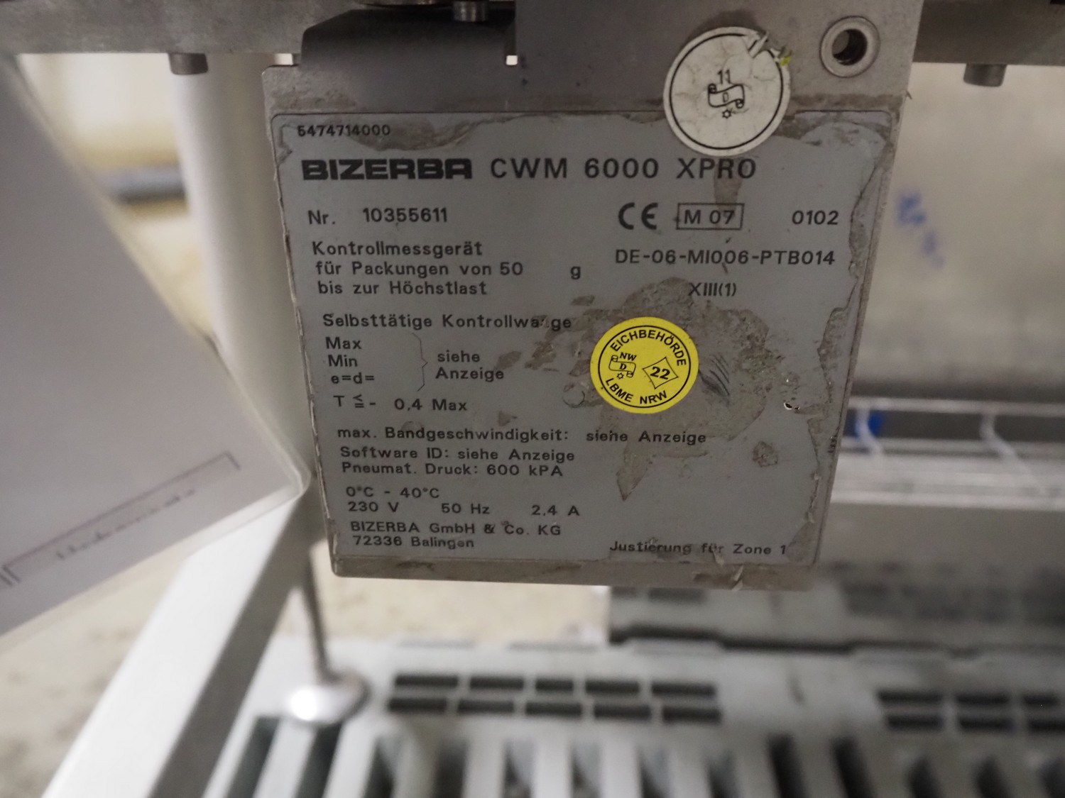 Bizerba checkweigher, type: CWM 6000 XPRO, number: 10355611, 230 V, 50 Hz, 2.4 A, plastic belt, belt width: 300 mm, total dimensions: 970 mm x 1150 mm x 1500 mm.