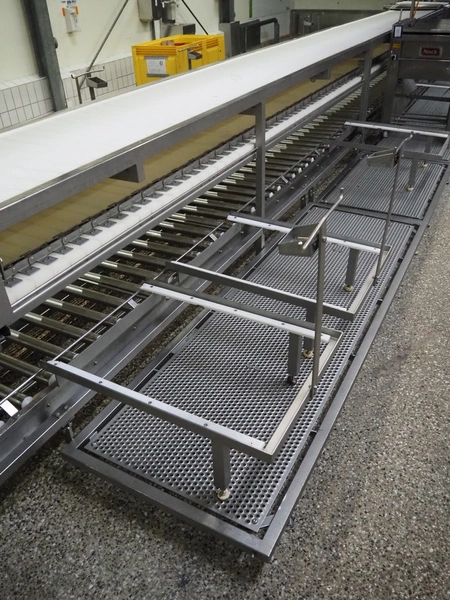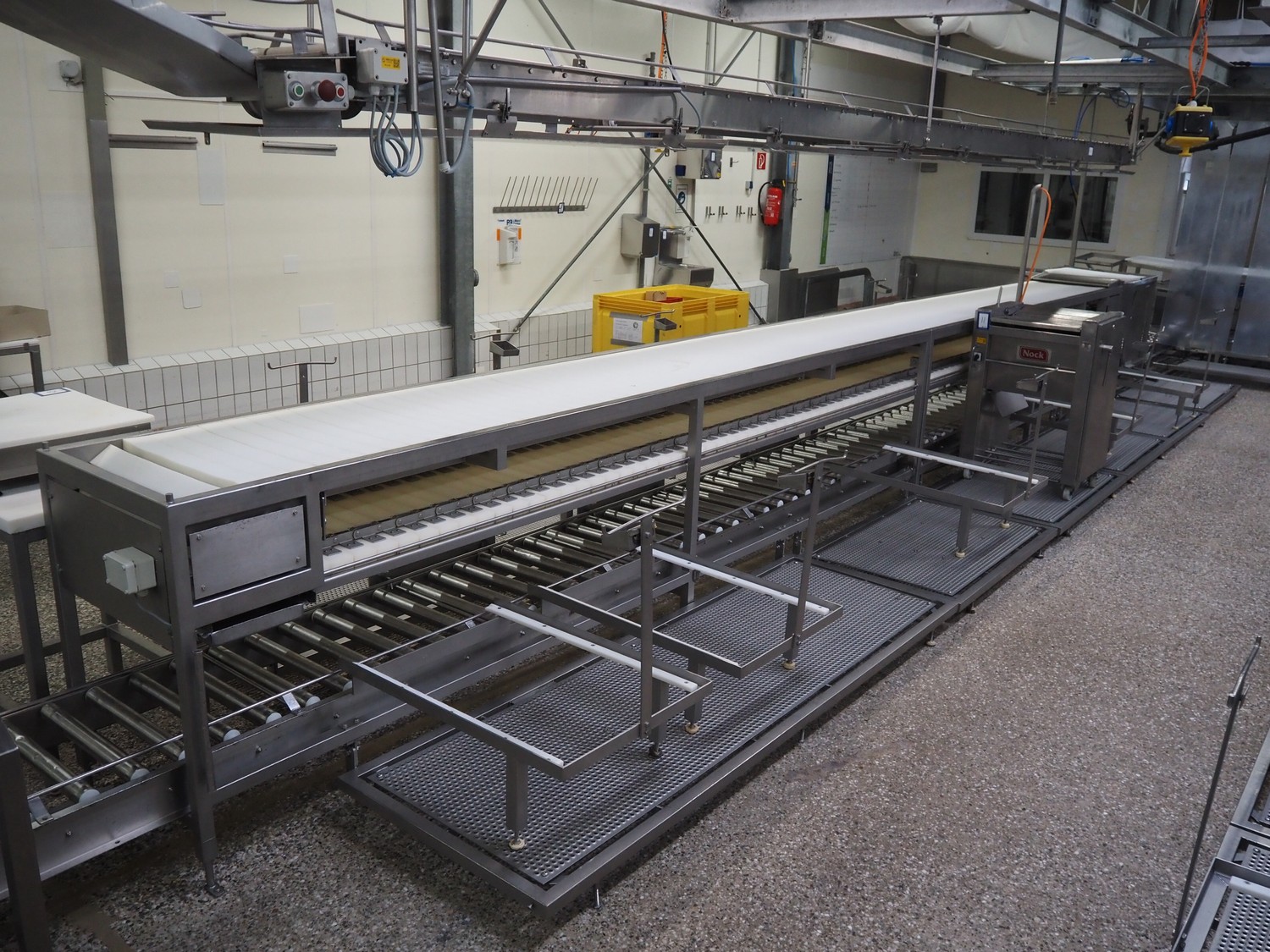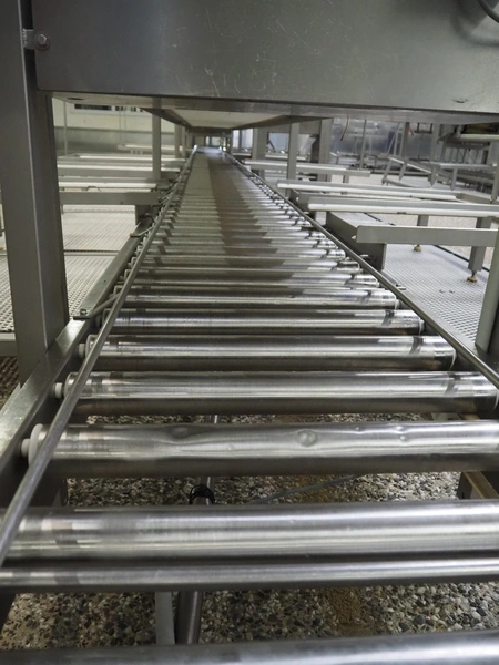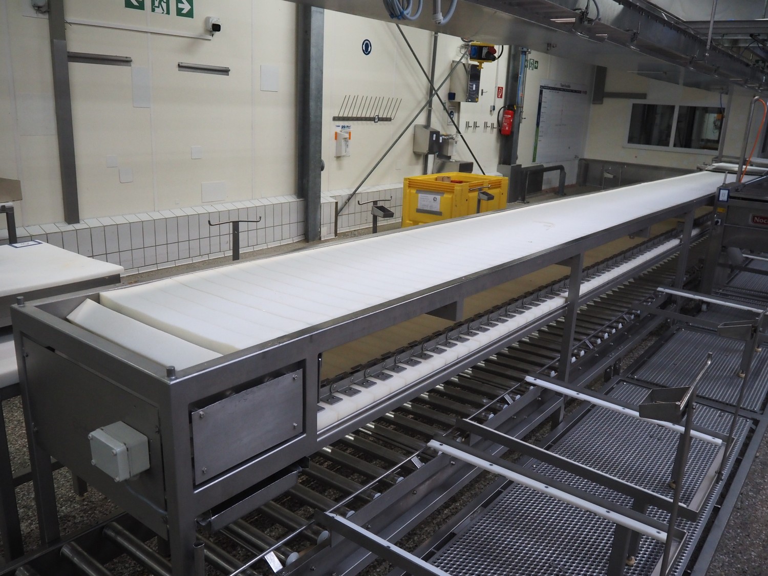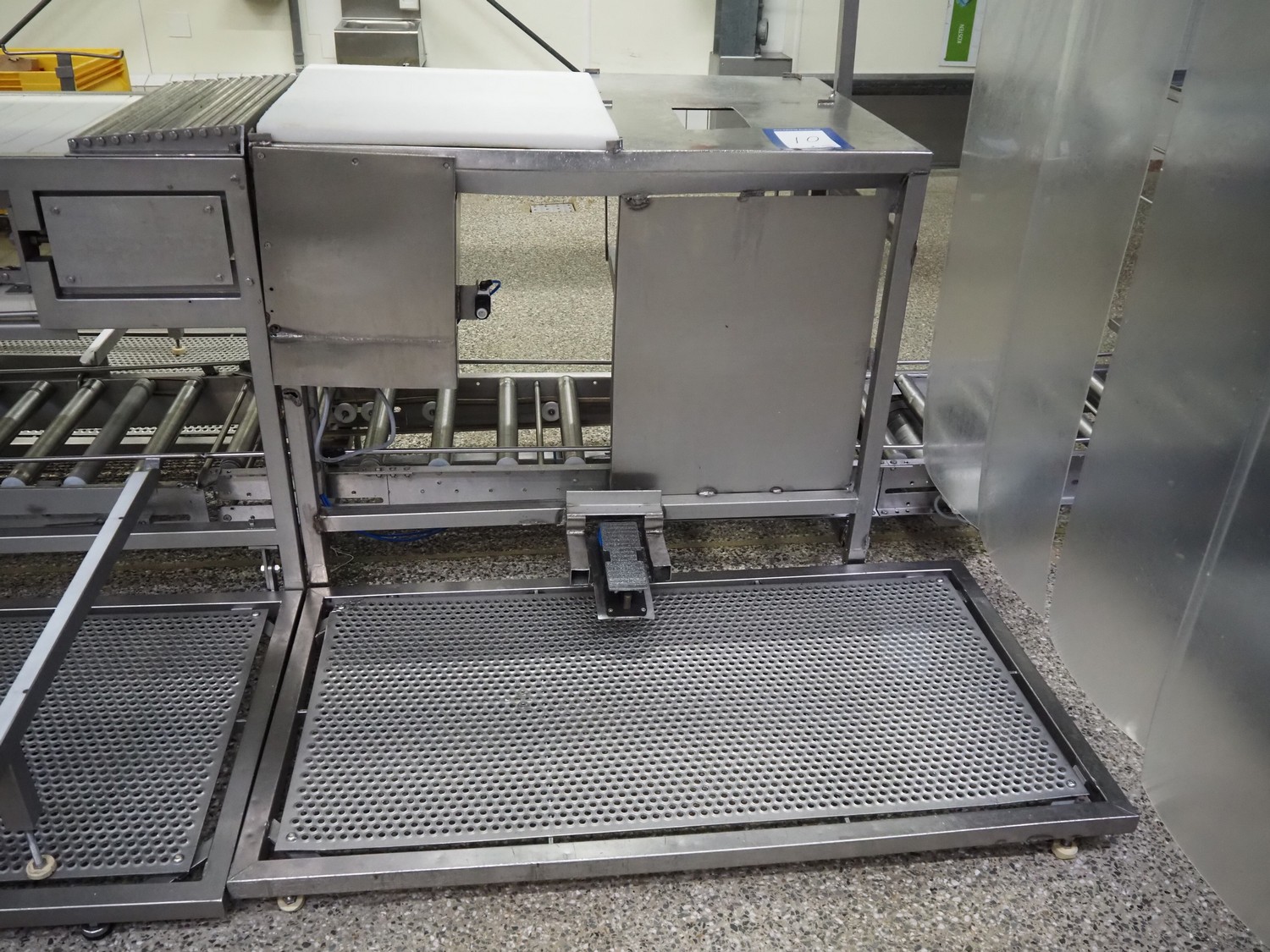 Itec / Attec deboning belt, type: DRAL, serial number: 2502, year of construction: 1994, plastic roller infeed conveyor for crates, roller width: 500 mm, plastic deboning belt, belt width: 600 mm, s/s outfeed rollers, roller width: 500 mm, total dimensions: 8800 mm x 2360 mm x 1000 mm.
