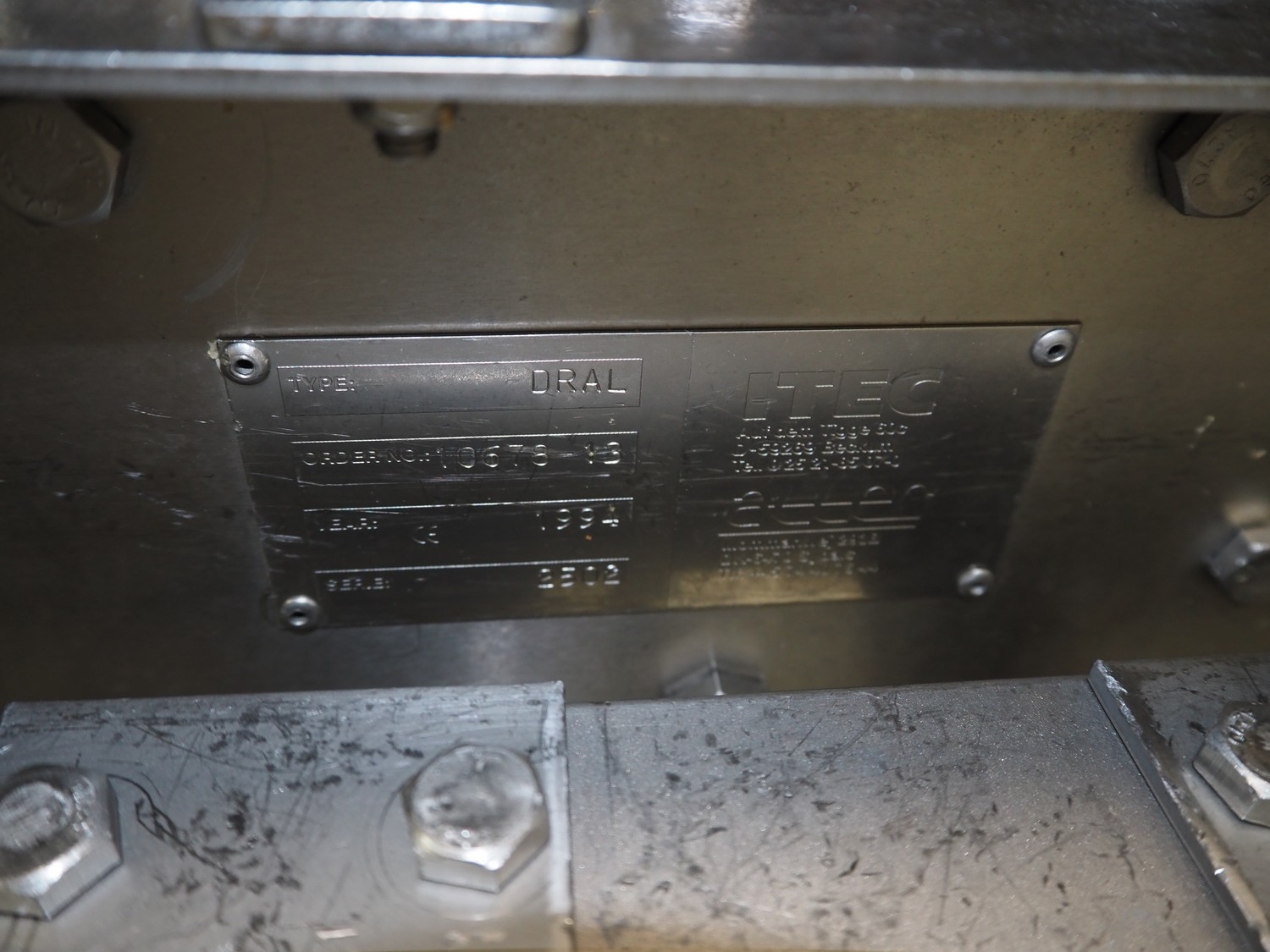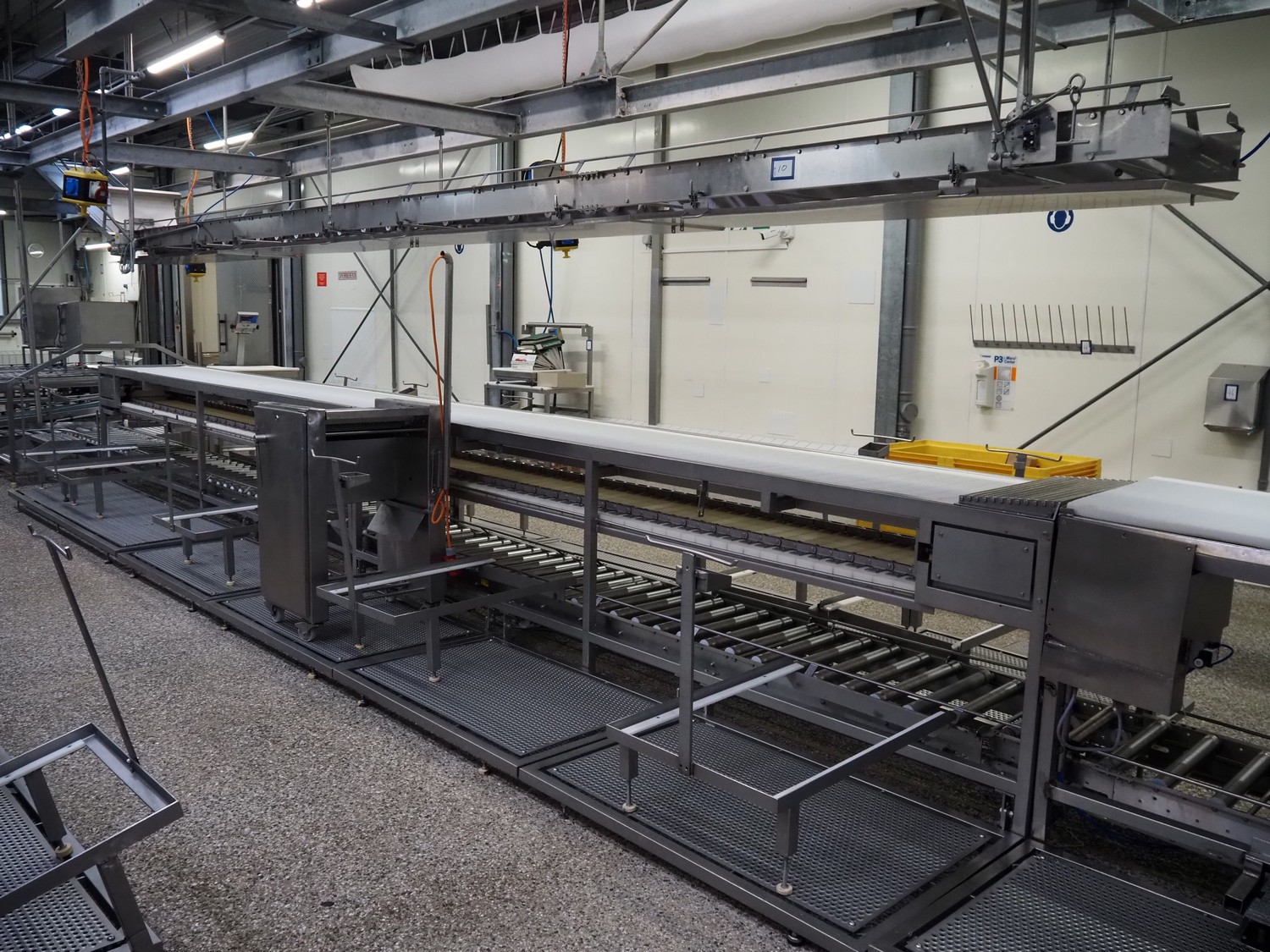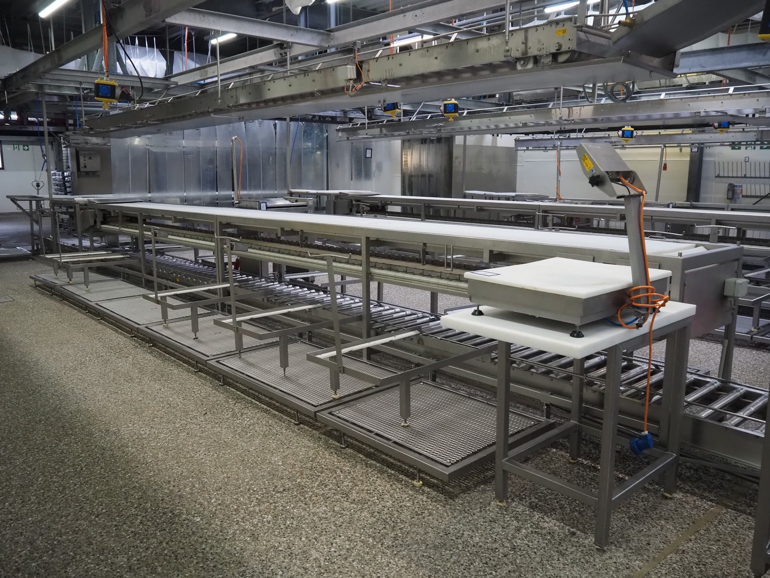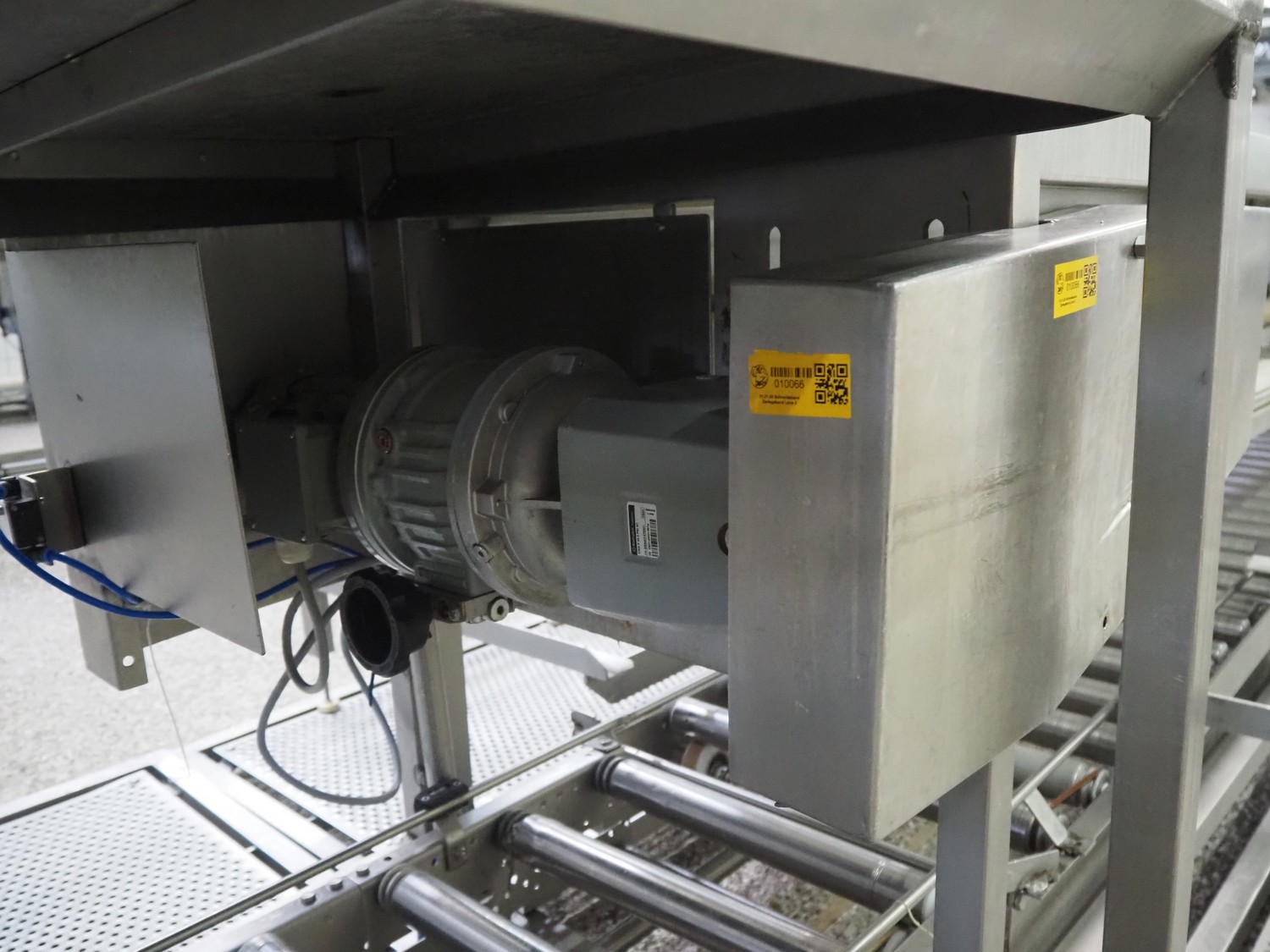 Itec / Attec deboning belt, type: DRAL, serial number: 2502, year of construction: 1994, plastic roller infeed conveyor for crates, roller width: 500 mm, plastic deboning belt, belt width: 600 mm, s/s outfeed rollers, roller width: 500 mm, total dimensions: 8800 mm x 2360 mm x 1000 mm.