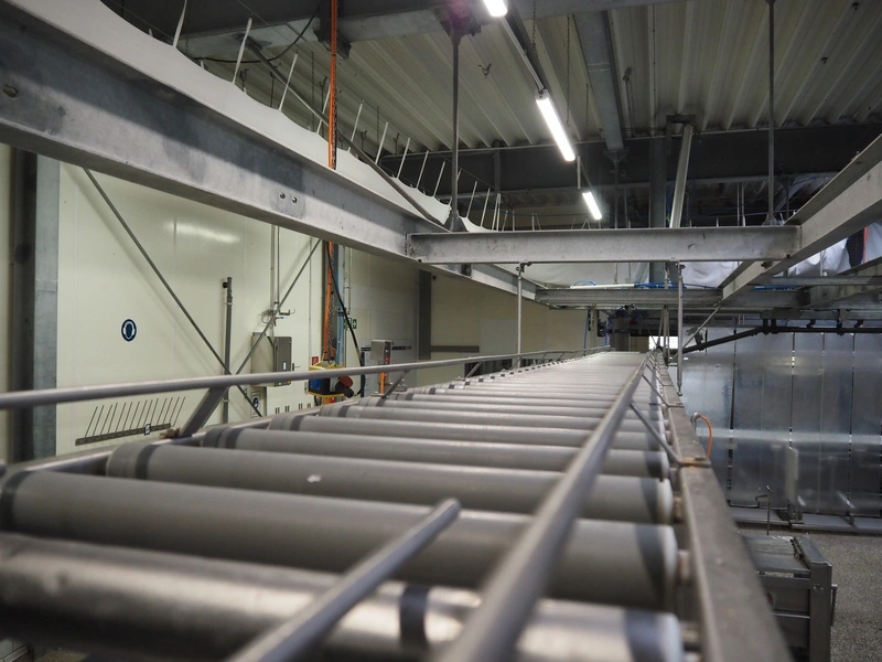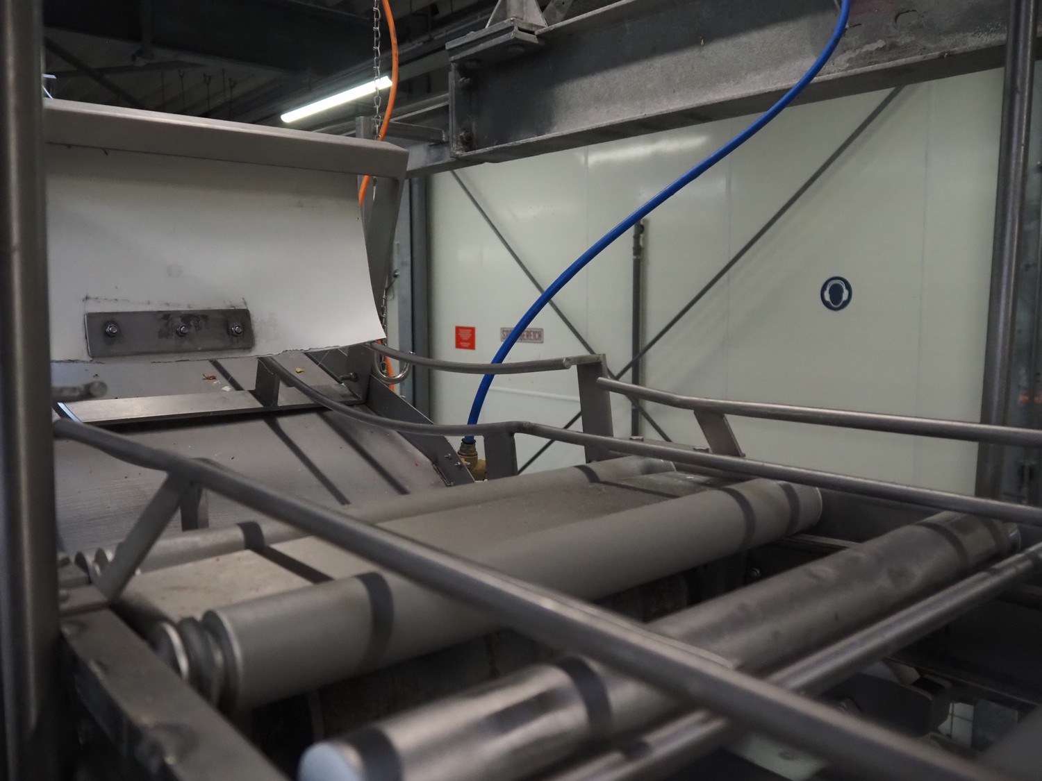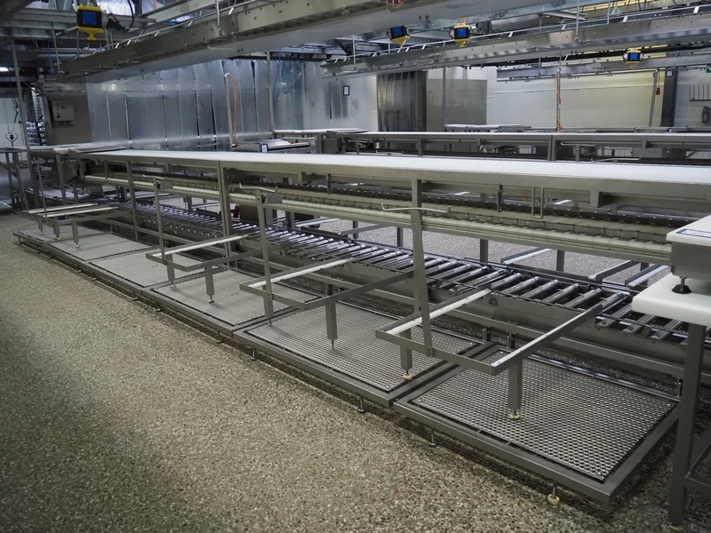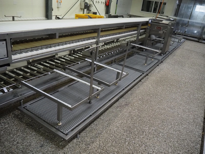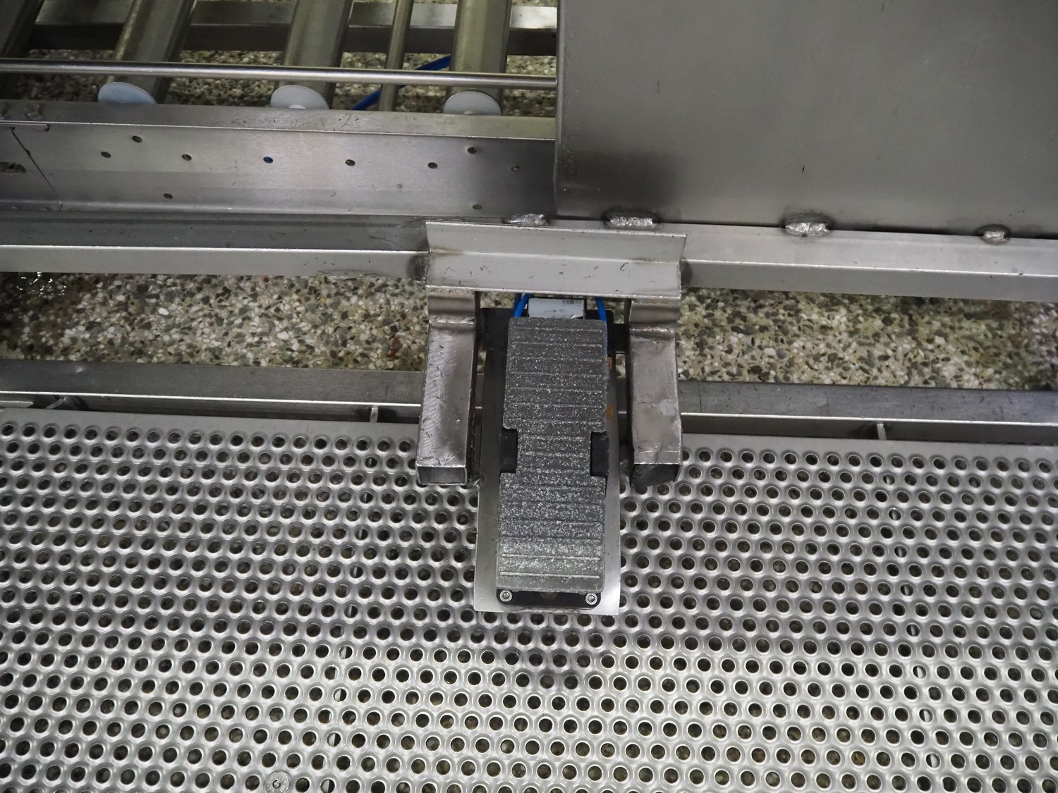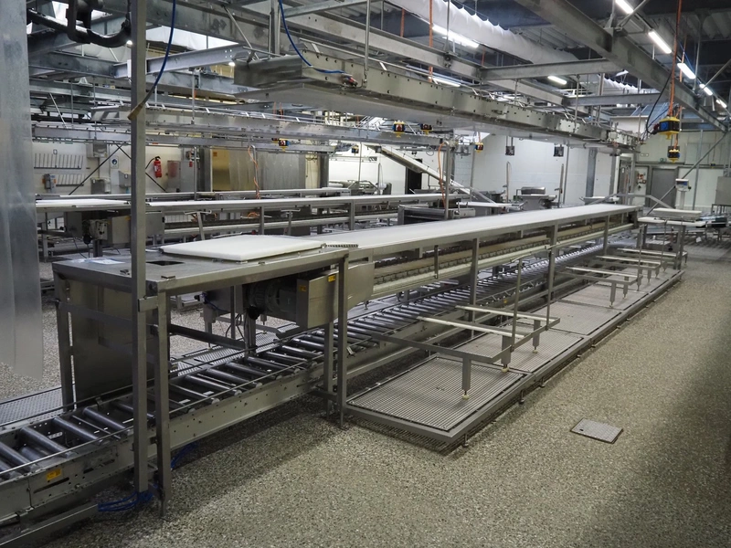 Itec / Attec deboning belt, type: DRAL, serial number: 2502, year of construction: 1994, plastic roller infeed conveyor for crates, roller width: 500 mm, plastic deboning belt, belt width: 600 mm, s/s outfeed rollers, roller width: 500 mm, total dimensions: 8800 mm x 2360 mm x 1000 mm.