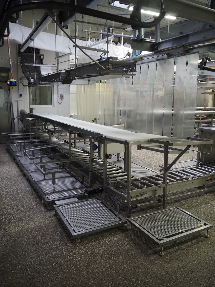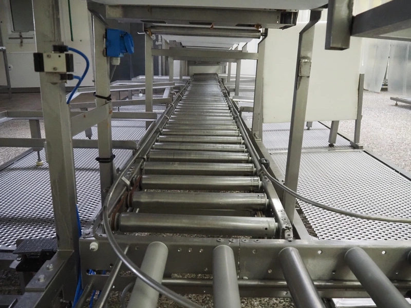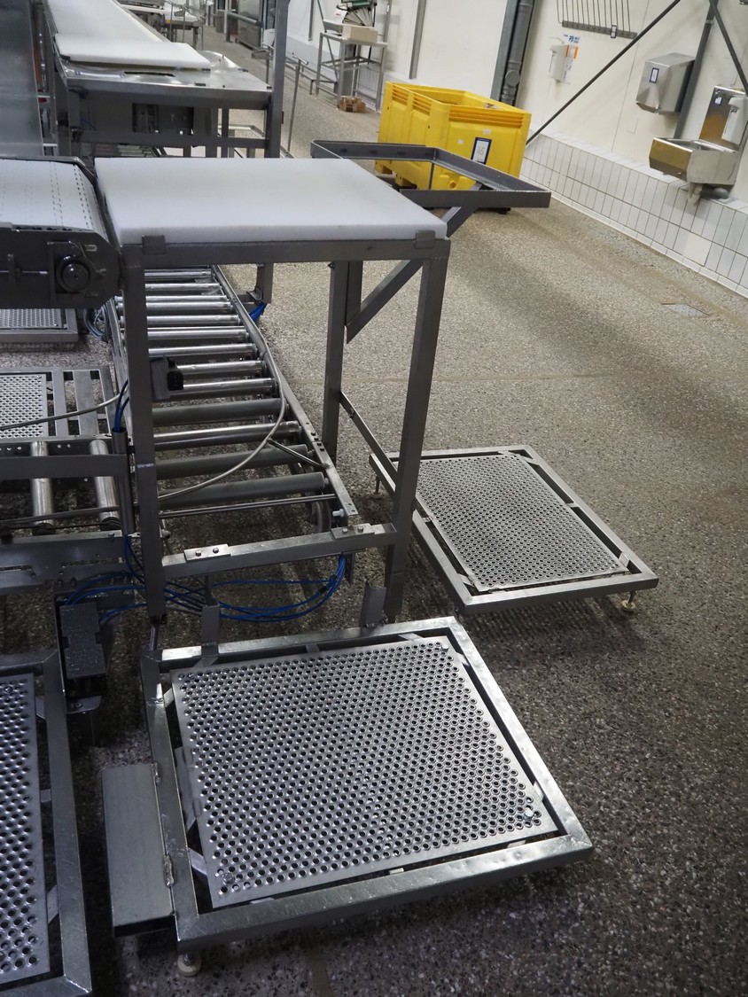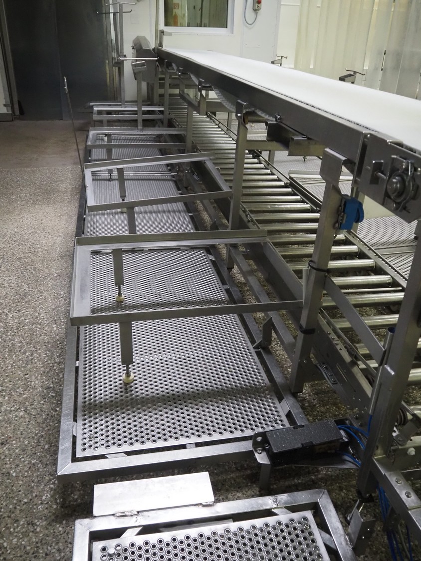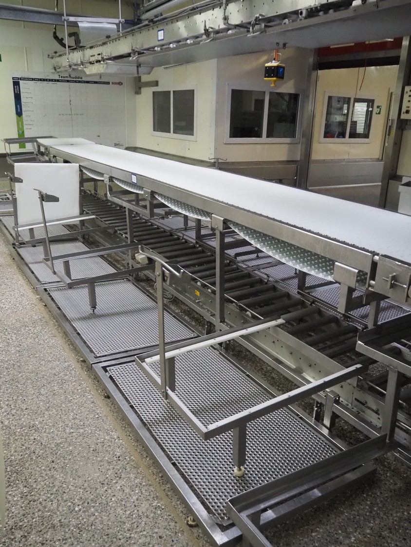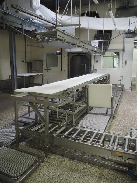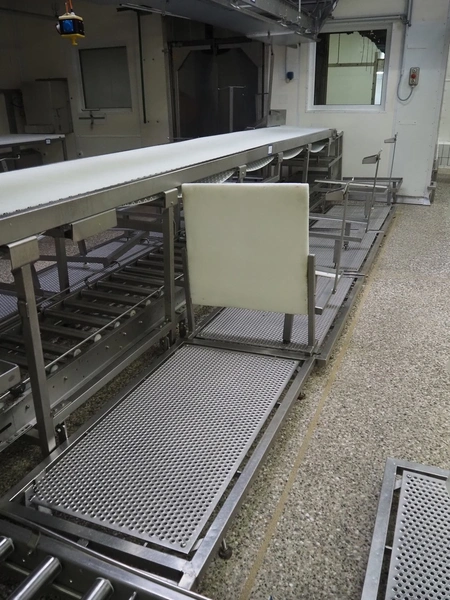 Itec / Attec deboning belt, type: MDRL, serial number: 2402, year of construction: 1996, plastic roller infeed conveyor for crates, roller width: 500 mm, plastic deboning belt, belt width: 600 mm, s/s outfeed rollers, roller width: 500 mm, total dimensions: 7600 mm x 2400 mm x 1040 mm.