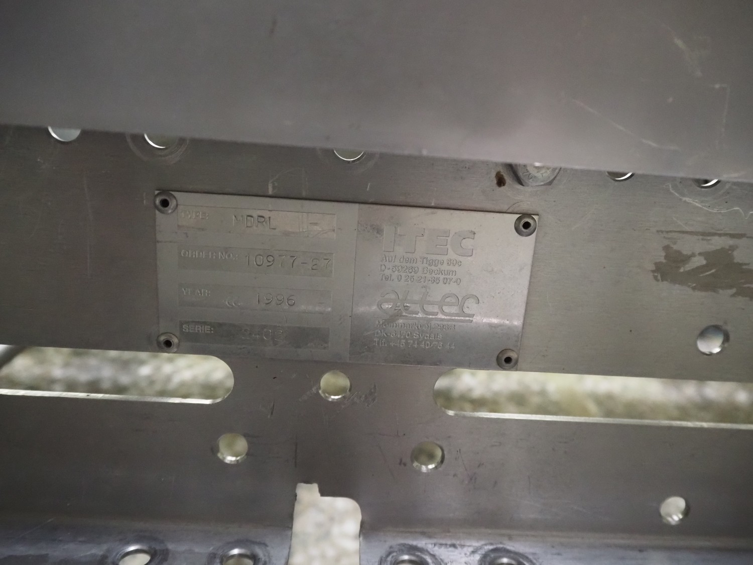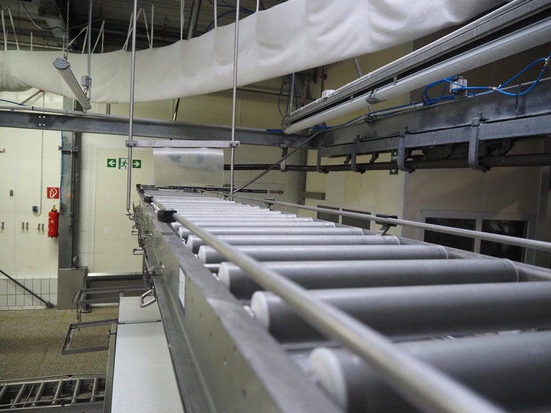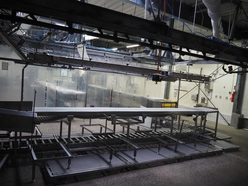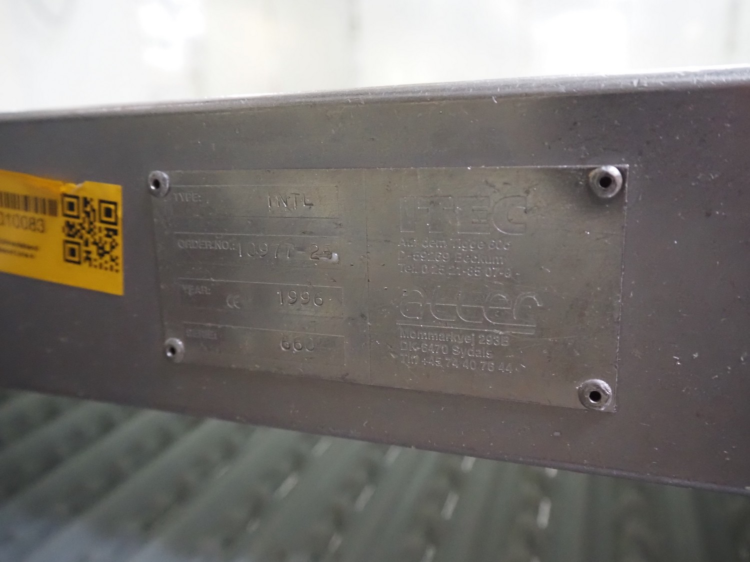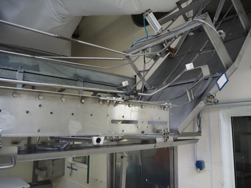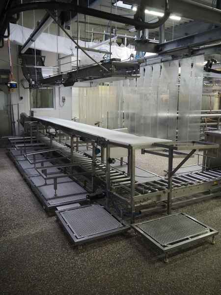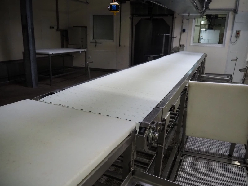 Itec / Attec deboning belt, type: MDRL, serial number: 2402, year of construction: 1996, plastic roller infeed conveyor for crates, roller width: 500 mm, plastic deboning belt, belt width: 600 mm, s/s outfeed rollers, roller width: 500 mm, total dimensions: 7600 mm x 2400 mm x 1040 mm.