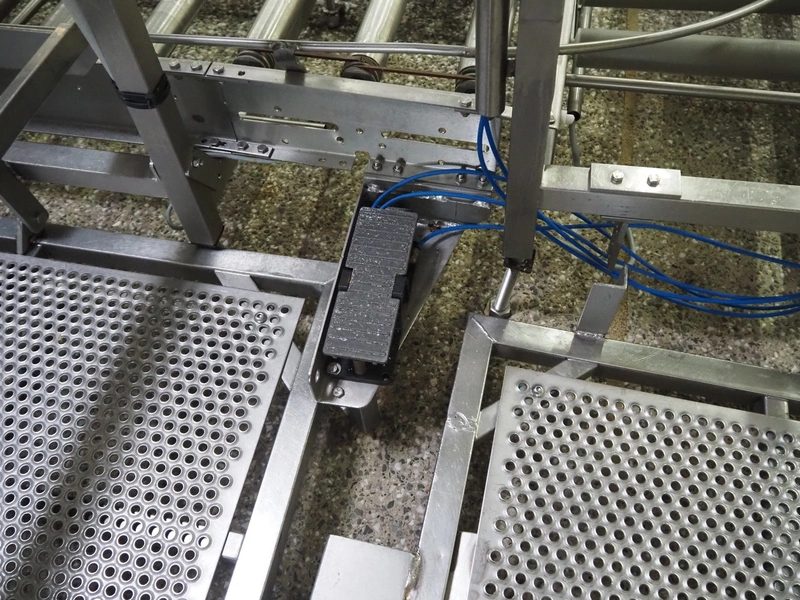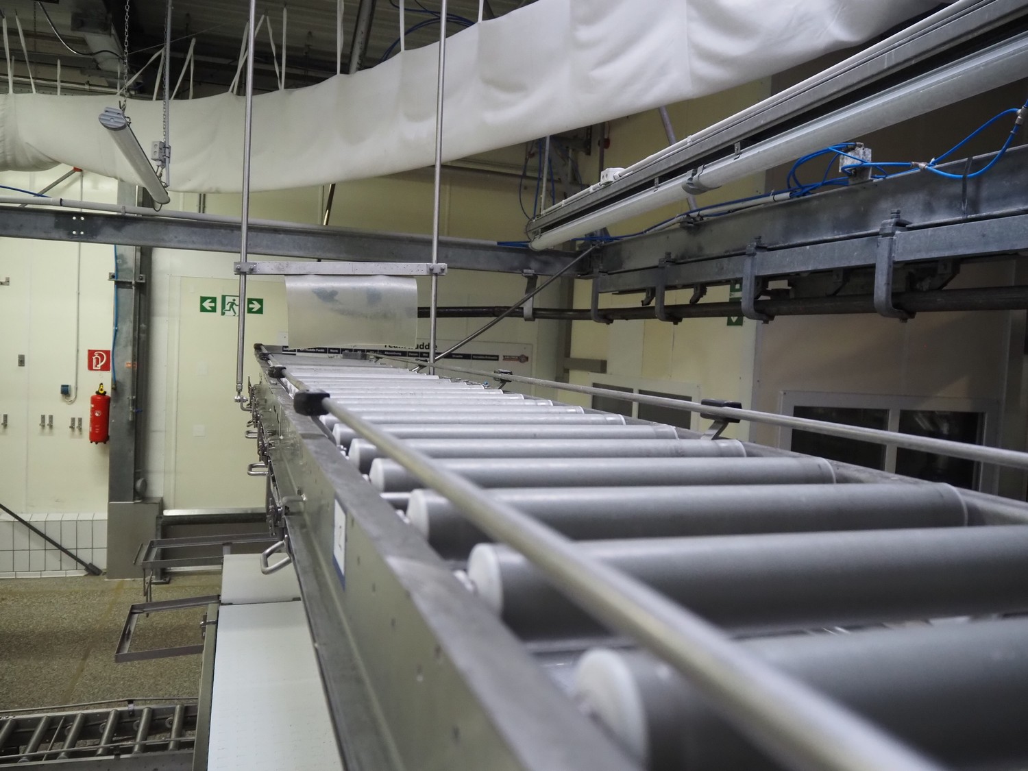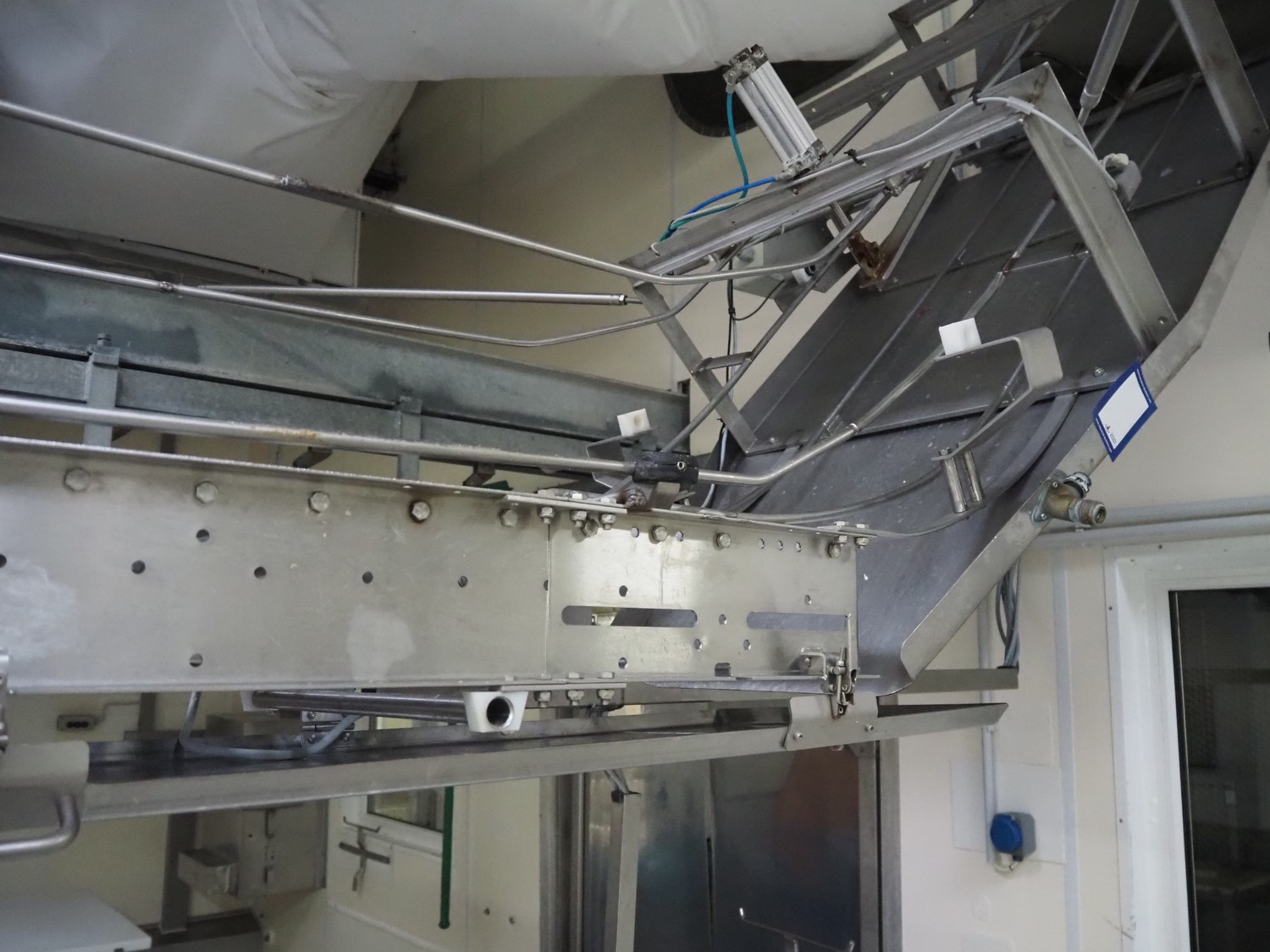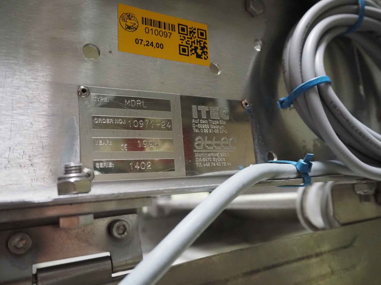 Itec / Attec deboning belt, type: MDRL, serial number: 2402, year of construction: 1996, plastic roller infeed conveyor for crates, roller width: 500 mm, plastic deboning belt, belt width: 600 mm, s/s outfeed rollers, roller width: 500 mm, total dimensions: 7600 mm x 2400 mm x 1040 mm.
