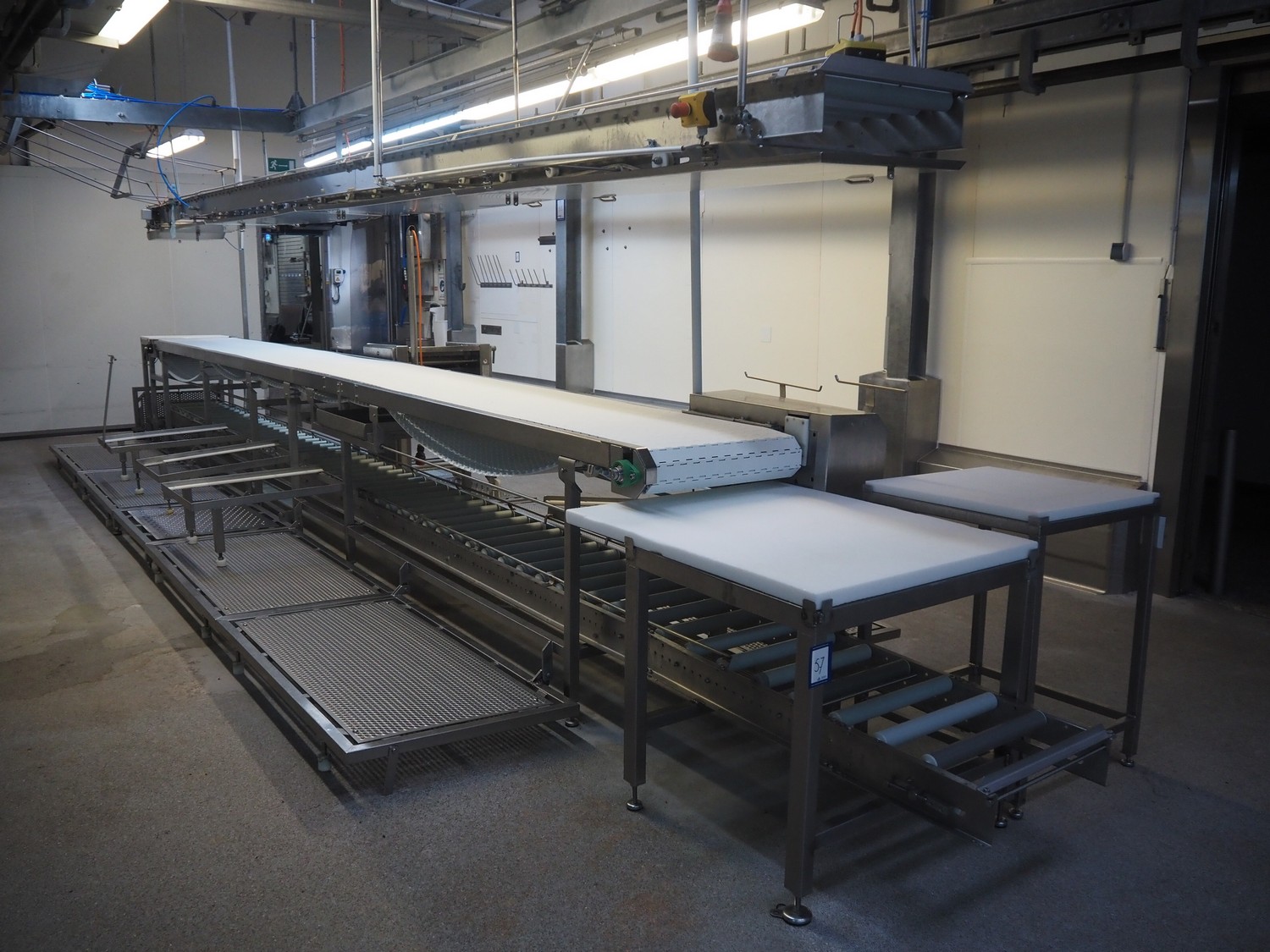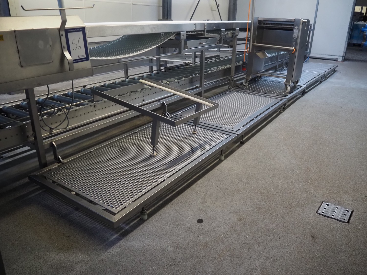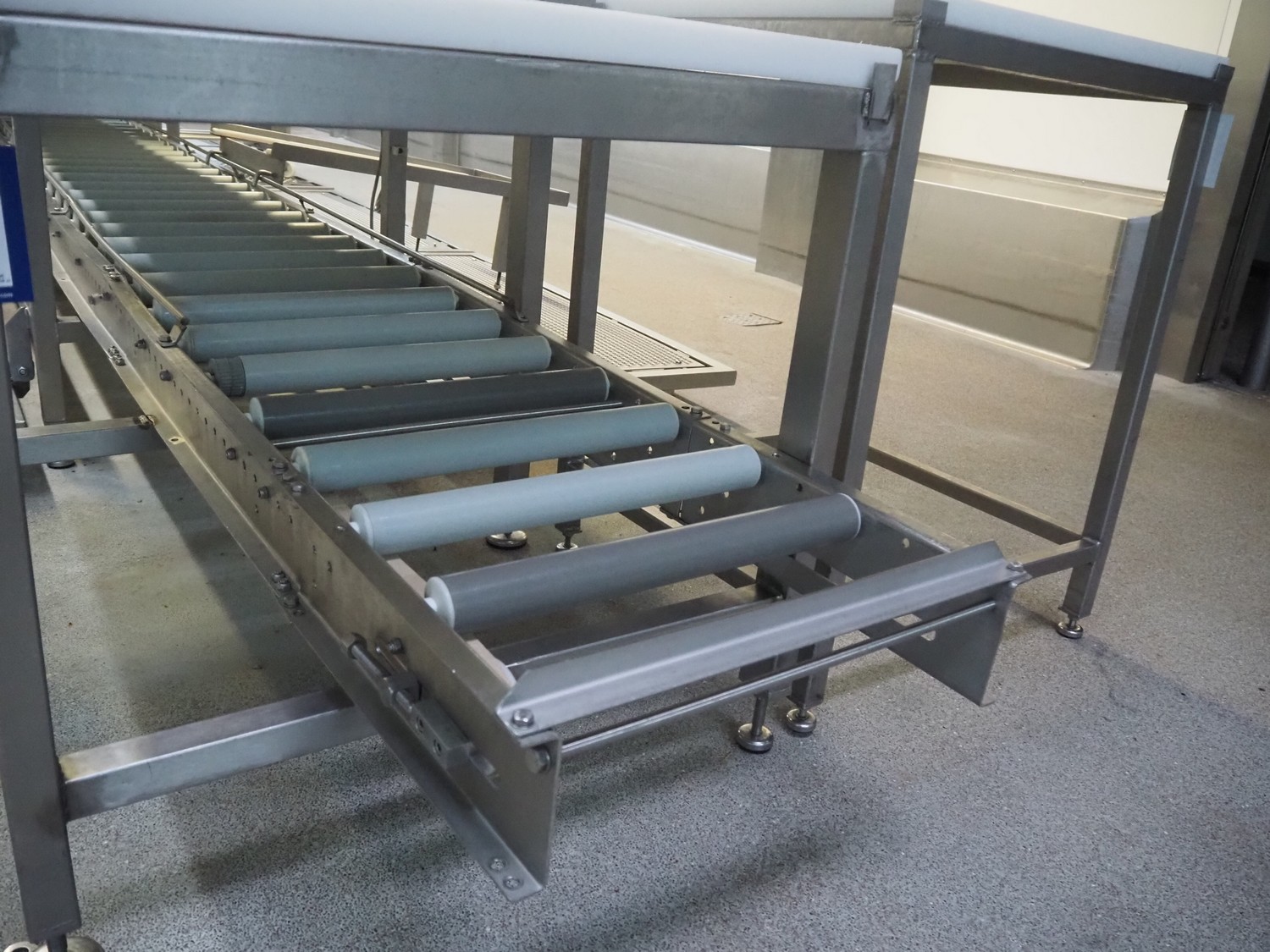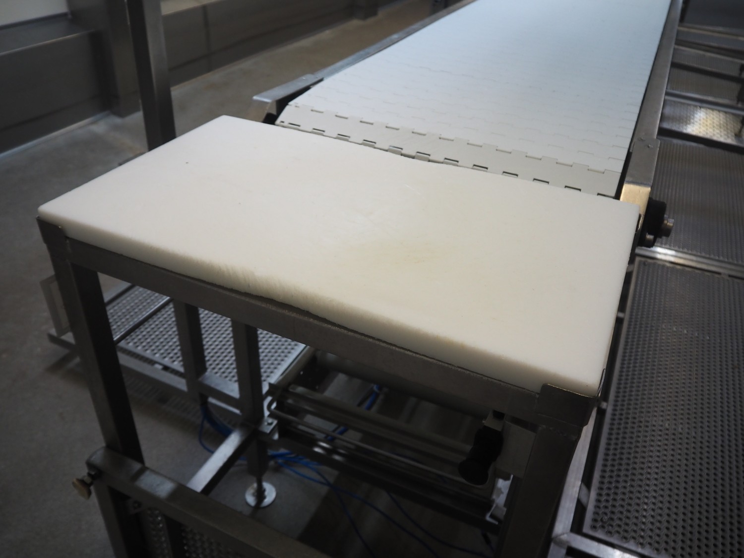 Westa deboning belt, type: W 040, number: 7109, year of construction: 1996, plastic roller infeed conveyor for crates, roller width: 460 mm, plastic deboning belt, belt width: 600 mm, plastic outfeed rollers, roller width: 460 mm, total dimensions: 7800 mm x 2400 mm x 1100 mm.