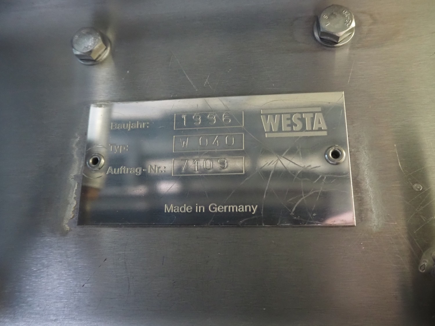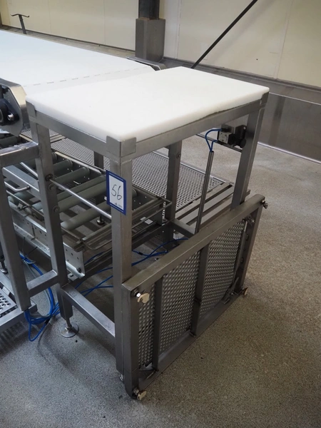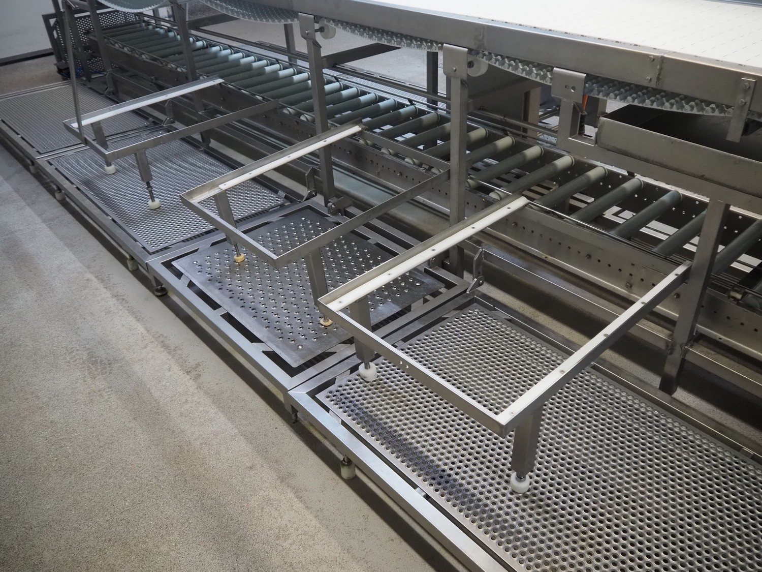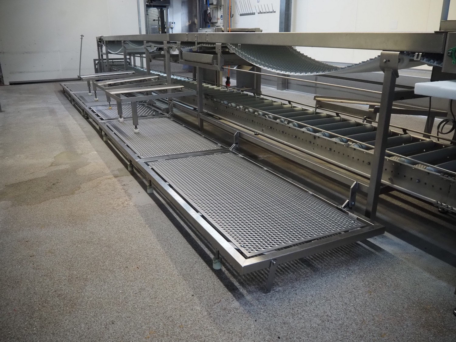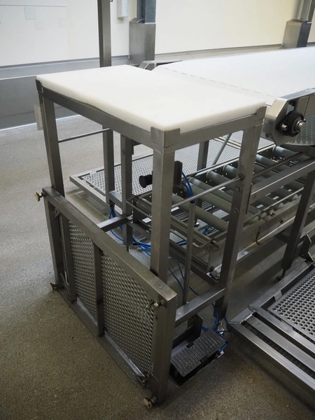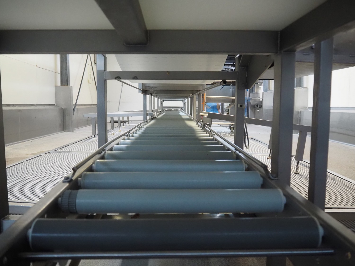 Westa deboning belt, type: W 040, number: 7109, year of construction: 1996, plastic roller infeed conveyor for crates, roller width: 460 mm, plastic deboning belt, belt width: 600 mm, plastic outfeed rollers, roller width: 460 mm, total dimensions: 7800 mm x 2400 mm x 1100 mm.