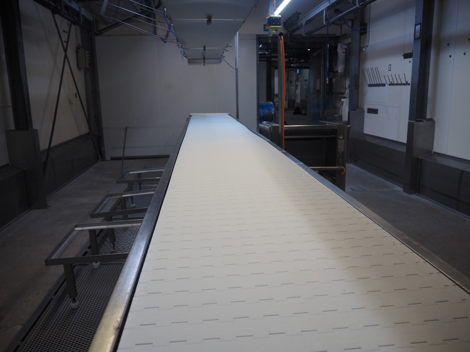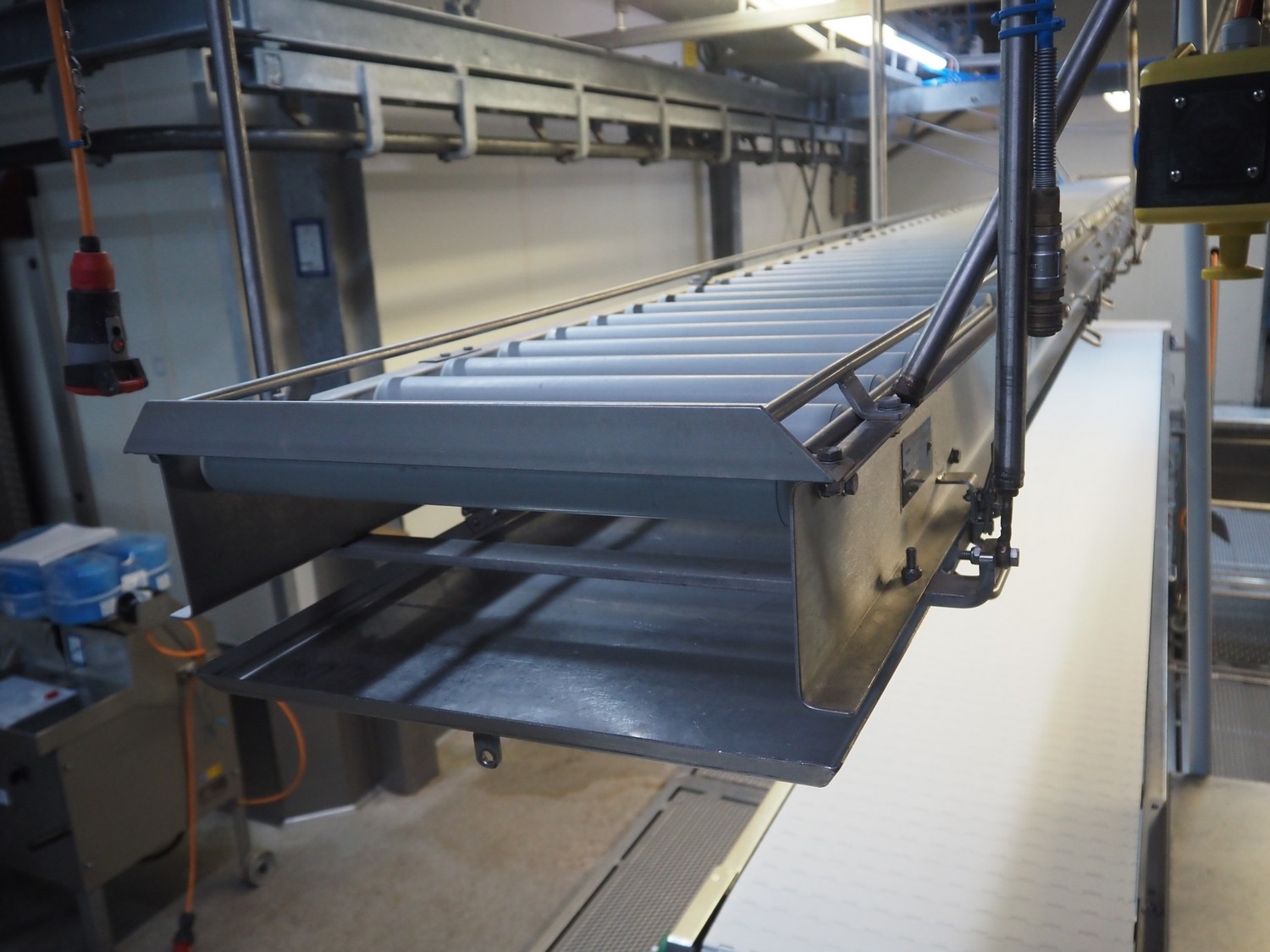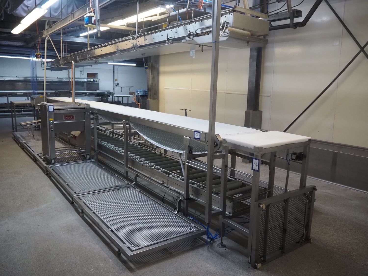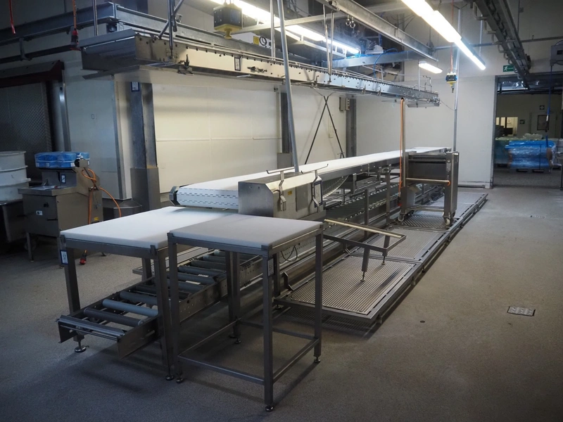 Westa deboning belt, type: W 040, number: 7109, year of construction: 1996, plastic roller infeed conveyor for crates, roller width: 460 mm, plastic deboning belt, belt width: 600 mm, plastic outfeed rollers, roller width: 460 mm, total dimensions: 7800 mm x 2400 mm x 1100 mm.