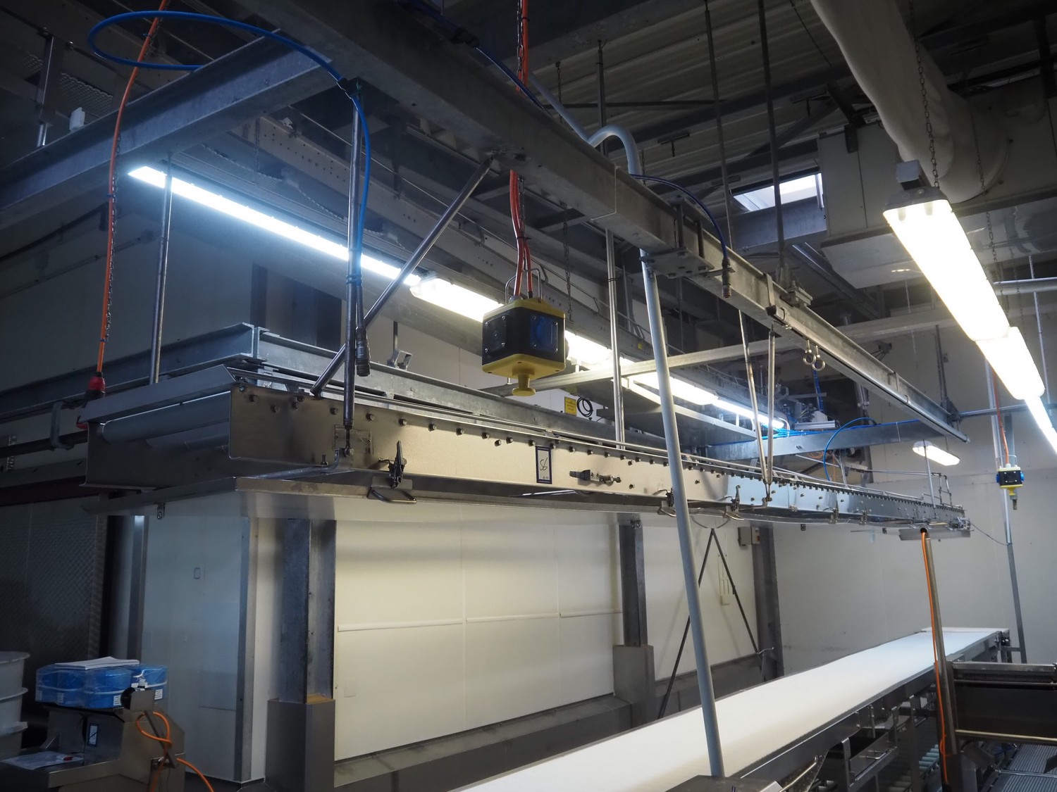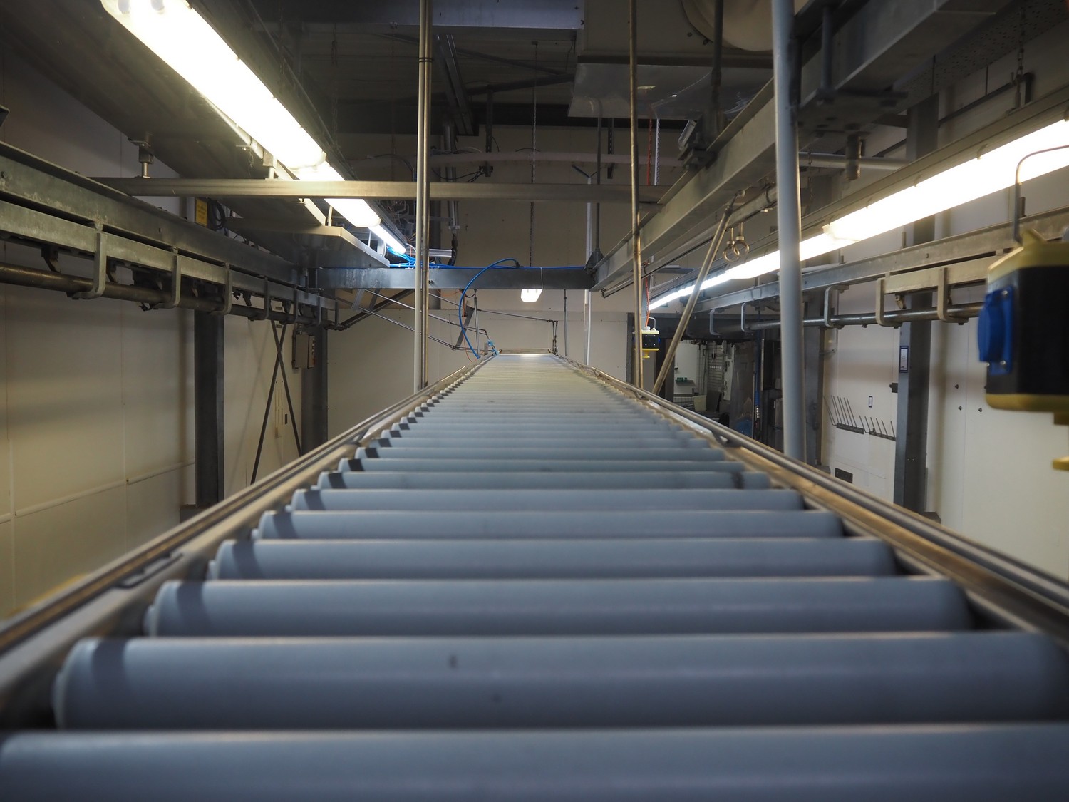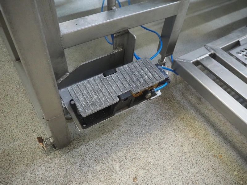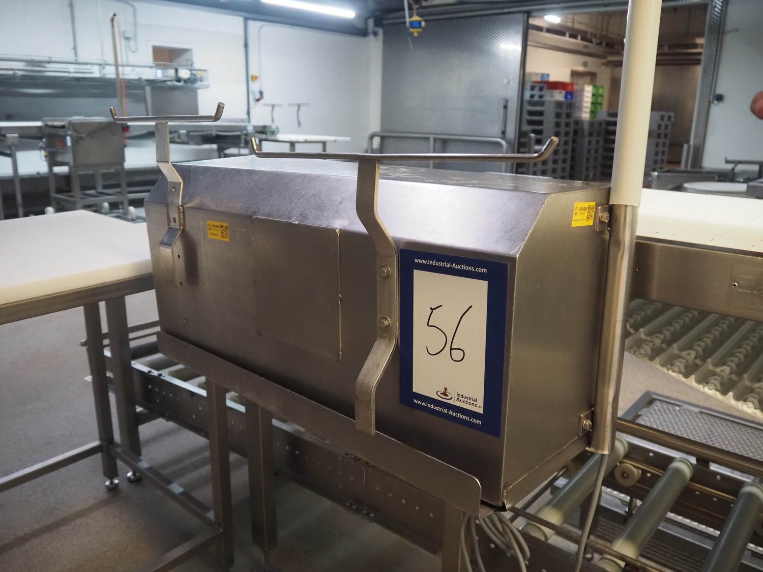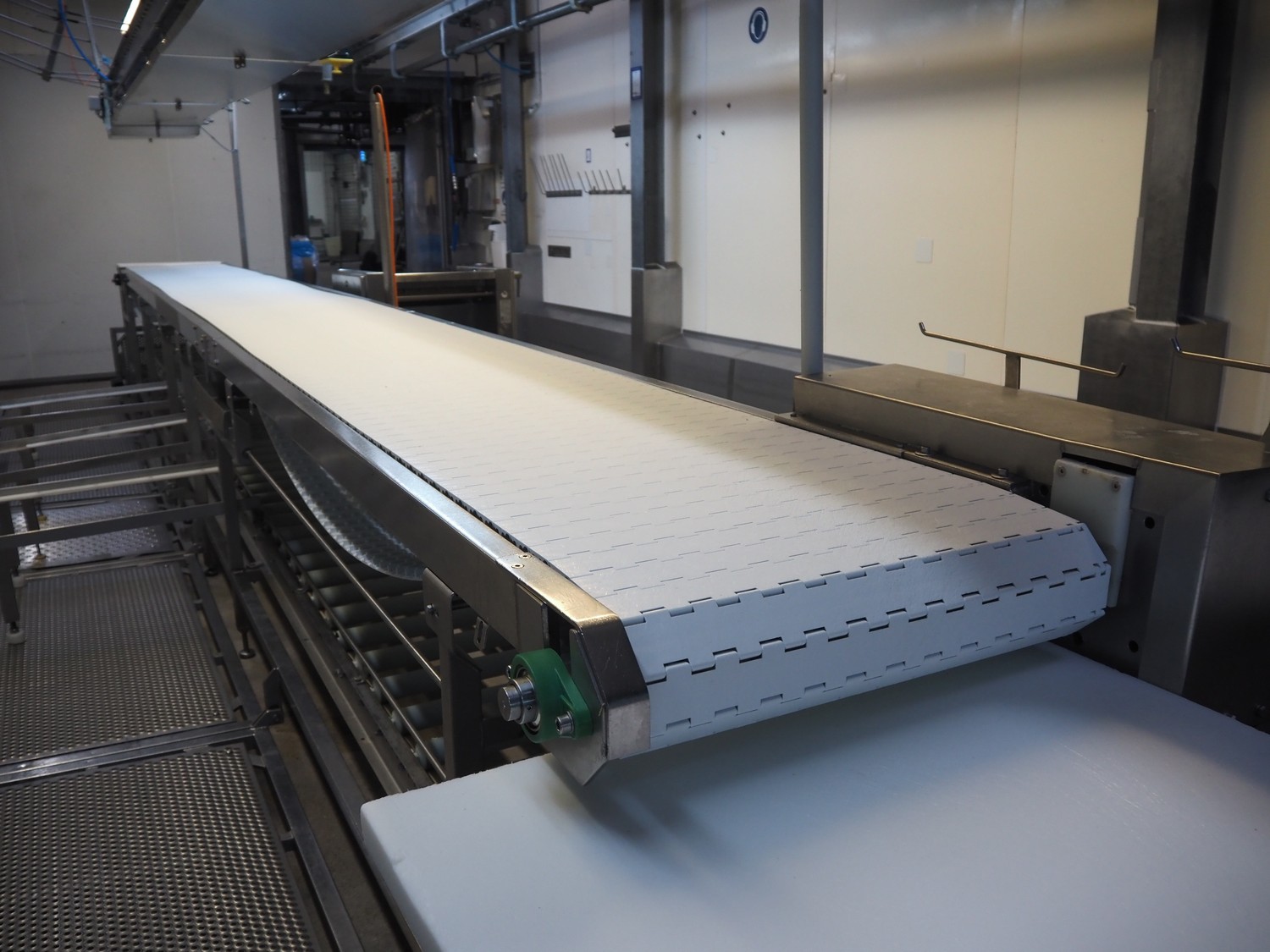 Westa deboning belt, type: W 040, number: 7109, year of construction: 1996, plastic roller infeed conveyor for crates, roller width: 460 mm, plastic deboning belt, belt width: 600 mm, plastic outfeed rollers, roller width: 460 mm, total dimensions: 7800 mm x 2400 mm x 1100 mm.