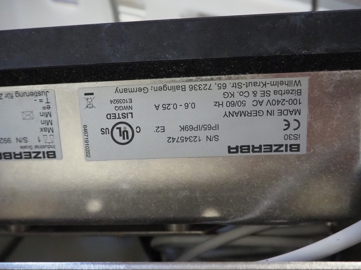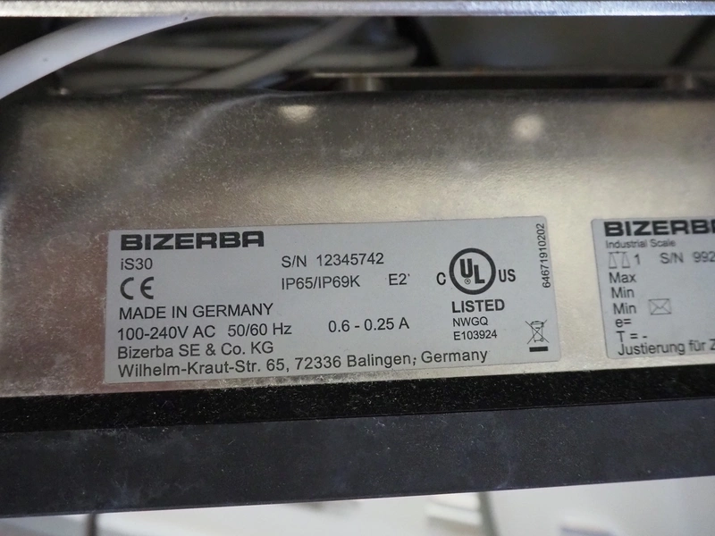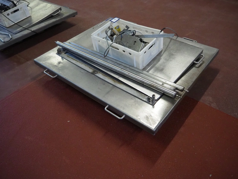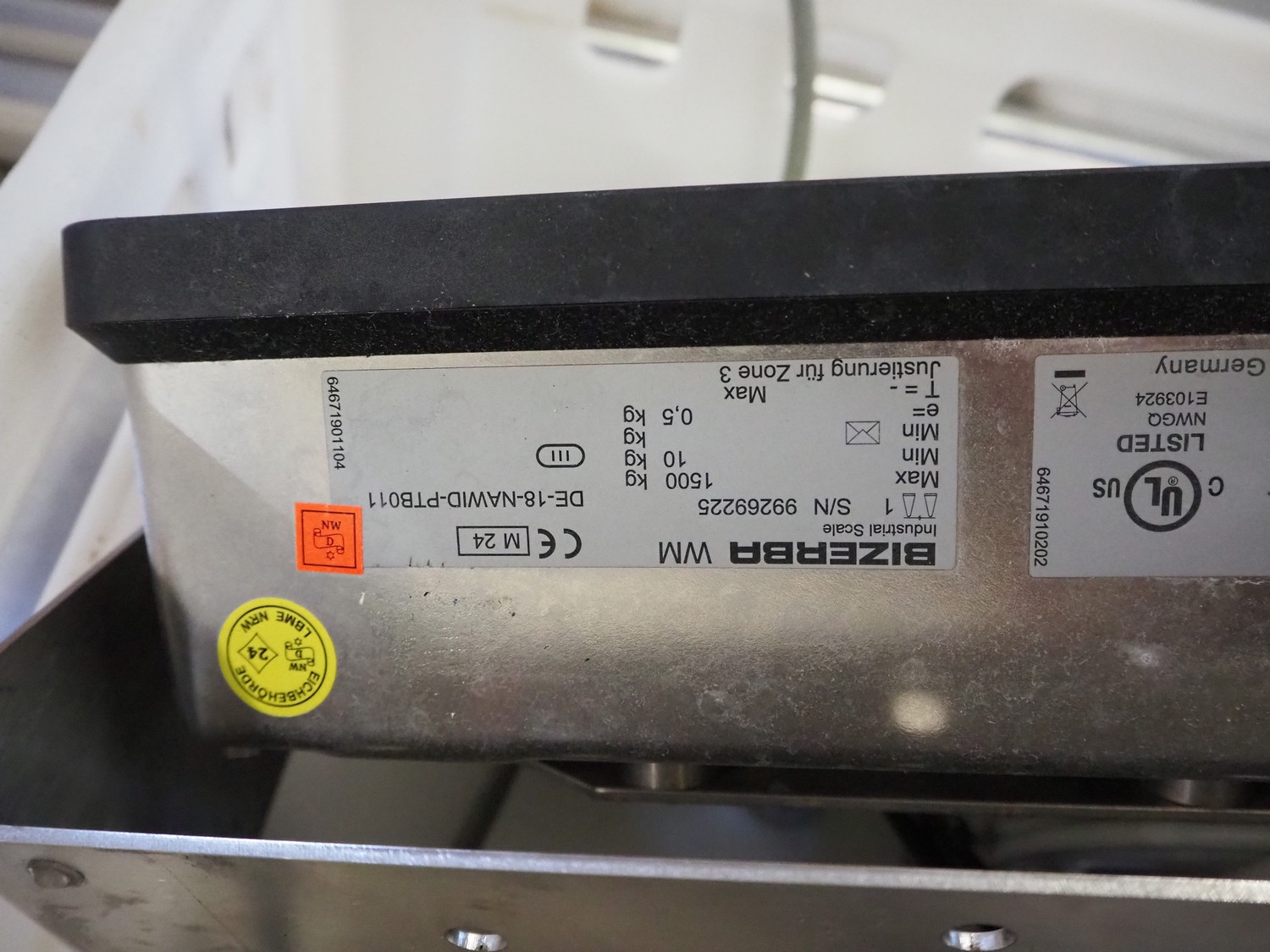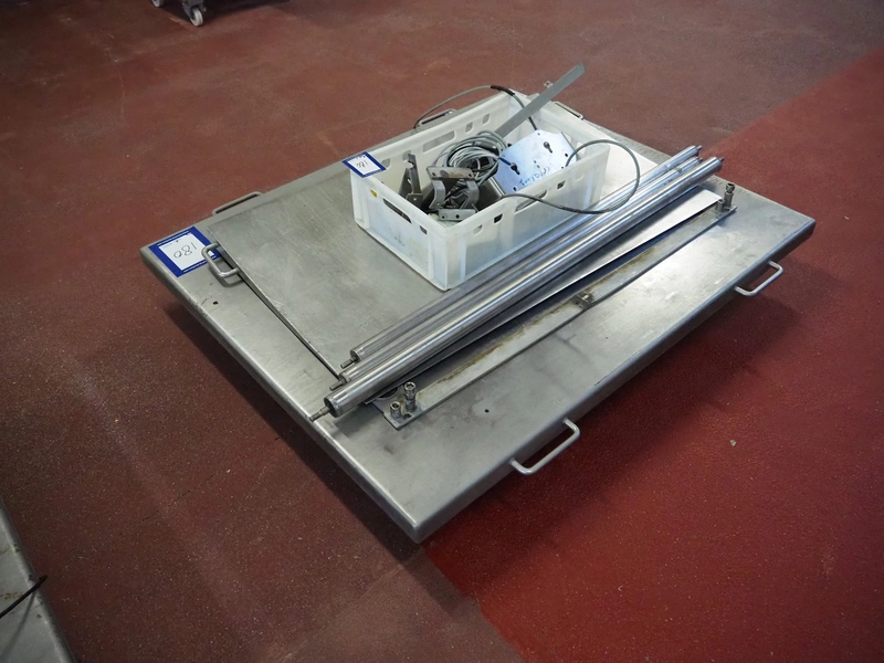 S/s floor weighing scale with Bizerba indicator, serial number: 99269225, 100-240 V, 50/60 Hz, 0.6-0.25 A, maximum weight: 1500 kg, minimum weight: 10 kg, e= 0.5 kg. Dimensions: 1500 mm x 1250 mm x 200 mm.