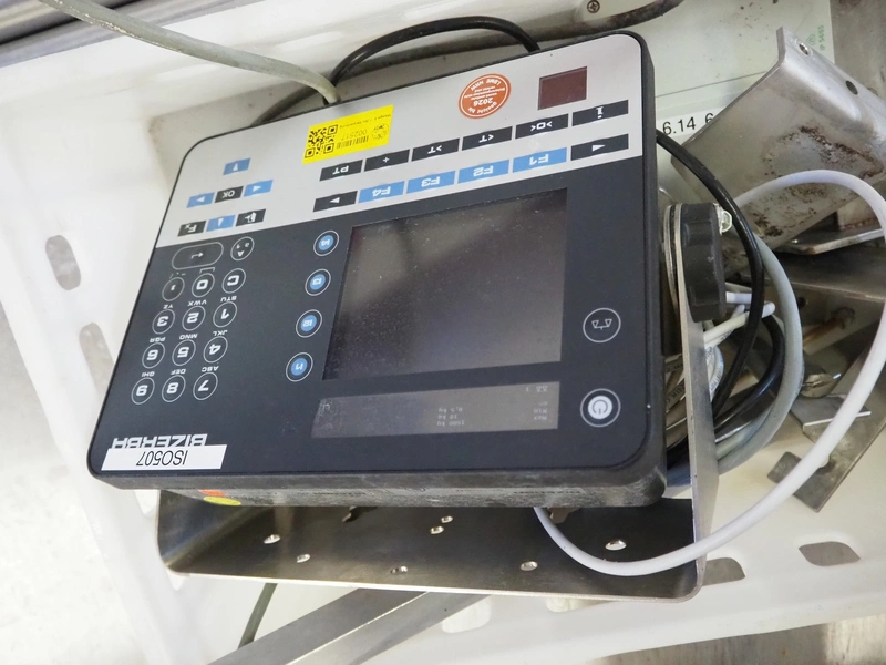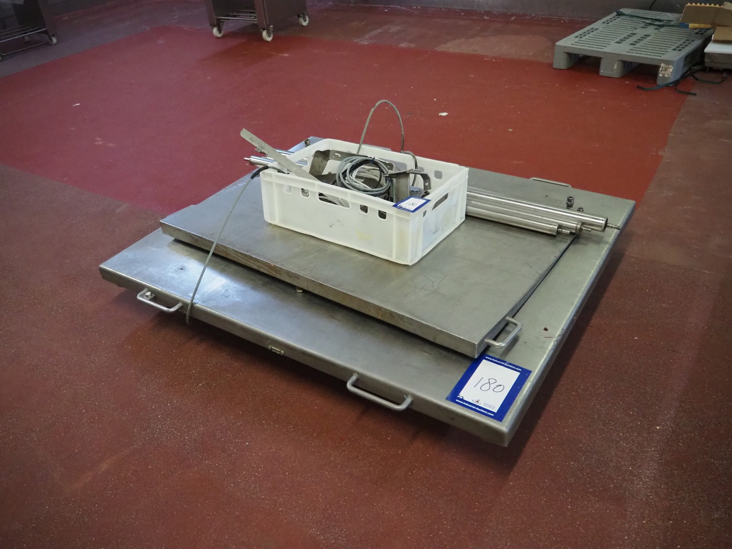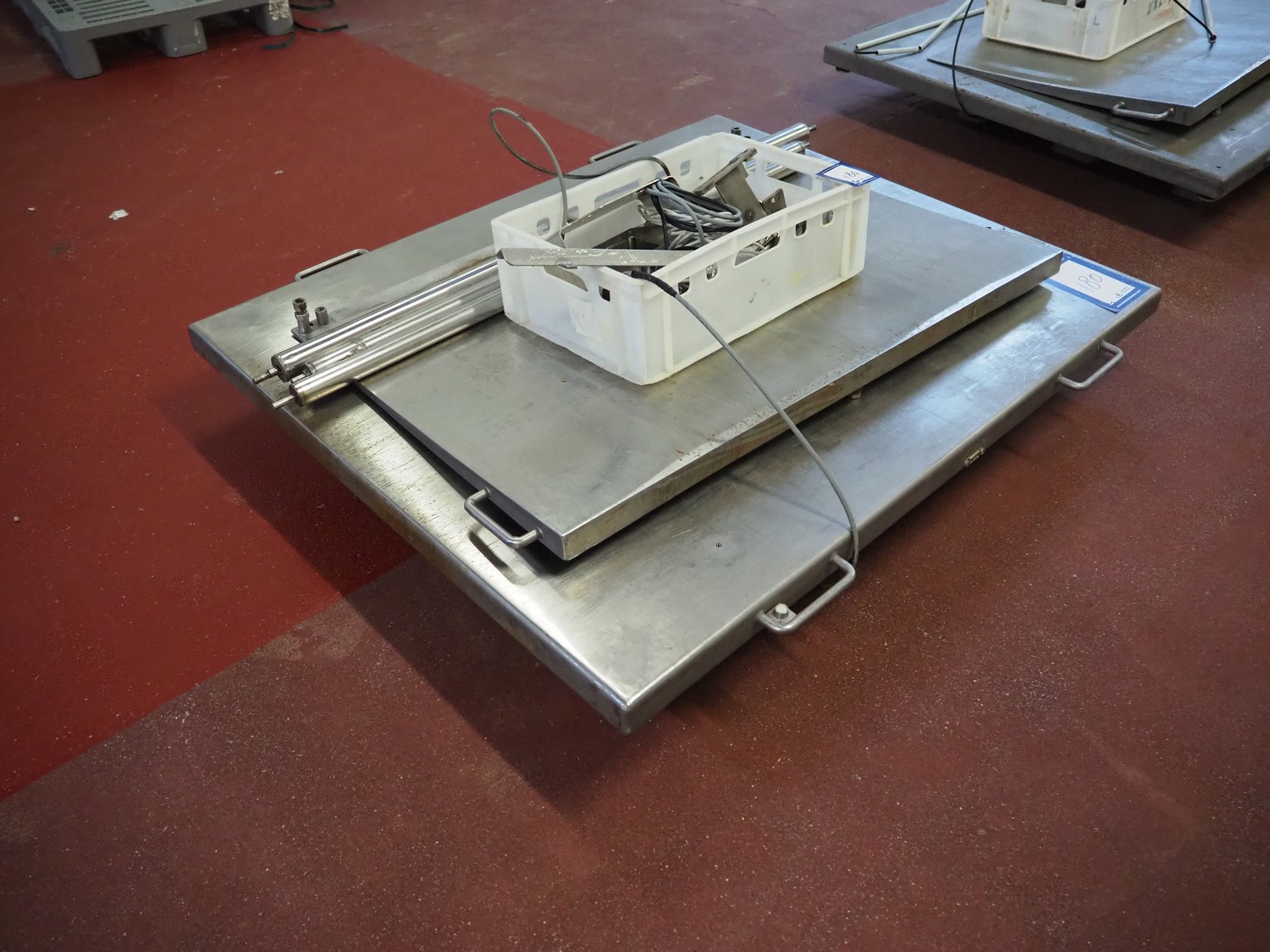 S/s floor weighing scale with Bizerba indicator, serial number: 99269225, 100-240 V, 50/60 Hz, 0.6-0.25 A, maximum weight: 1500 kg, minimum weight: 10 kg, e= 0.5 kg. Dimensions: 1500 mm x 1250 mm x 200 mm.