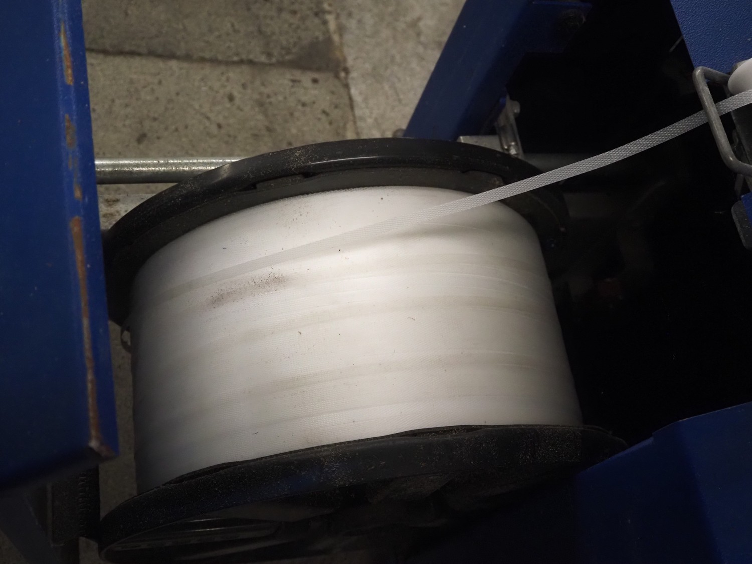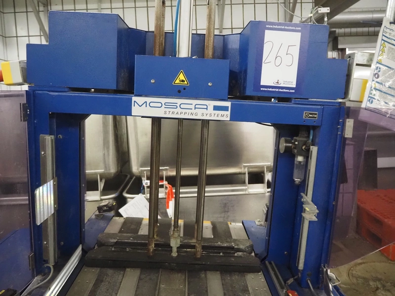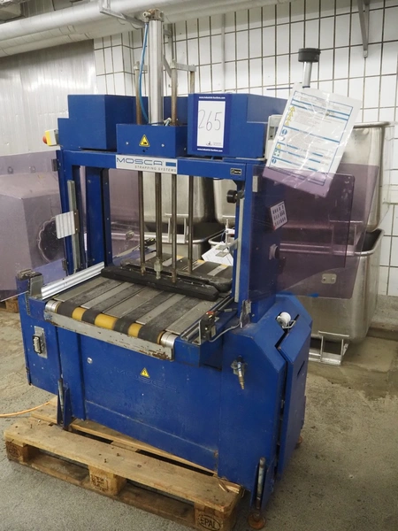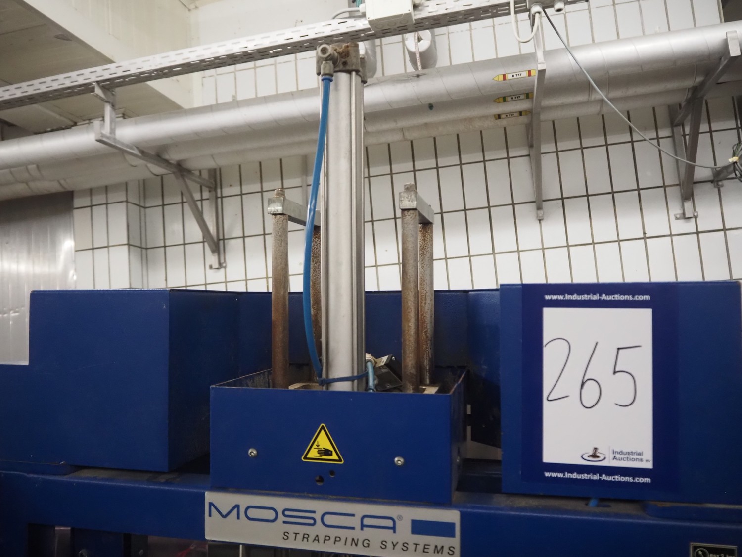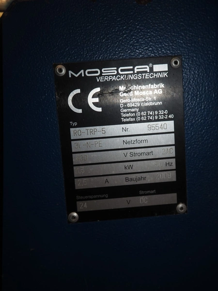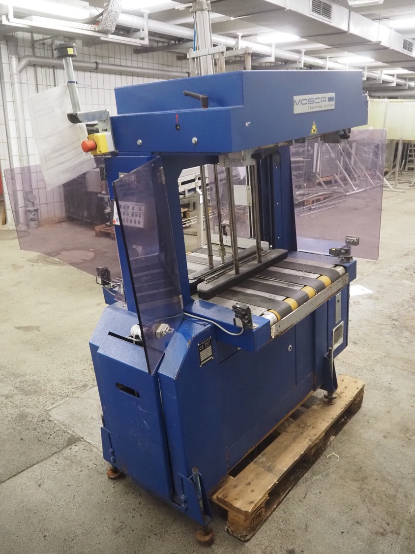 Mosca strapping machine, type: RO-TRP-5, number: 95540, year of construction: 2009, 400 V, 3 Ph, 50 Hz, 2.5 A, 1.5 kW, clearance: 660 mm x 500 mm, total dimensions: 1000 mm x 1000 mm x 1800 mm. Damaged.