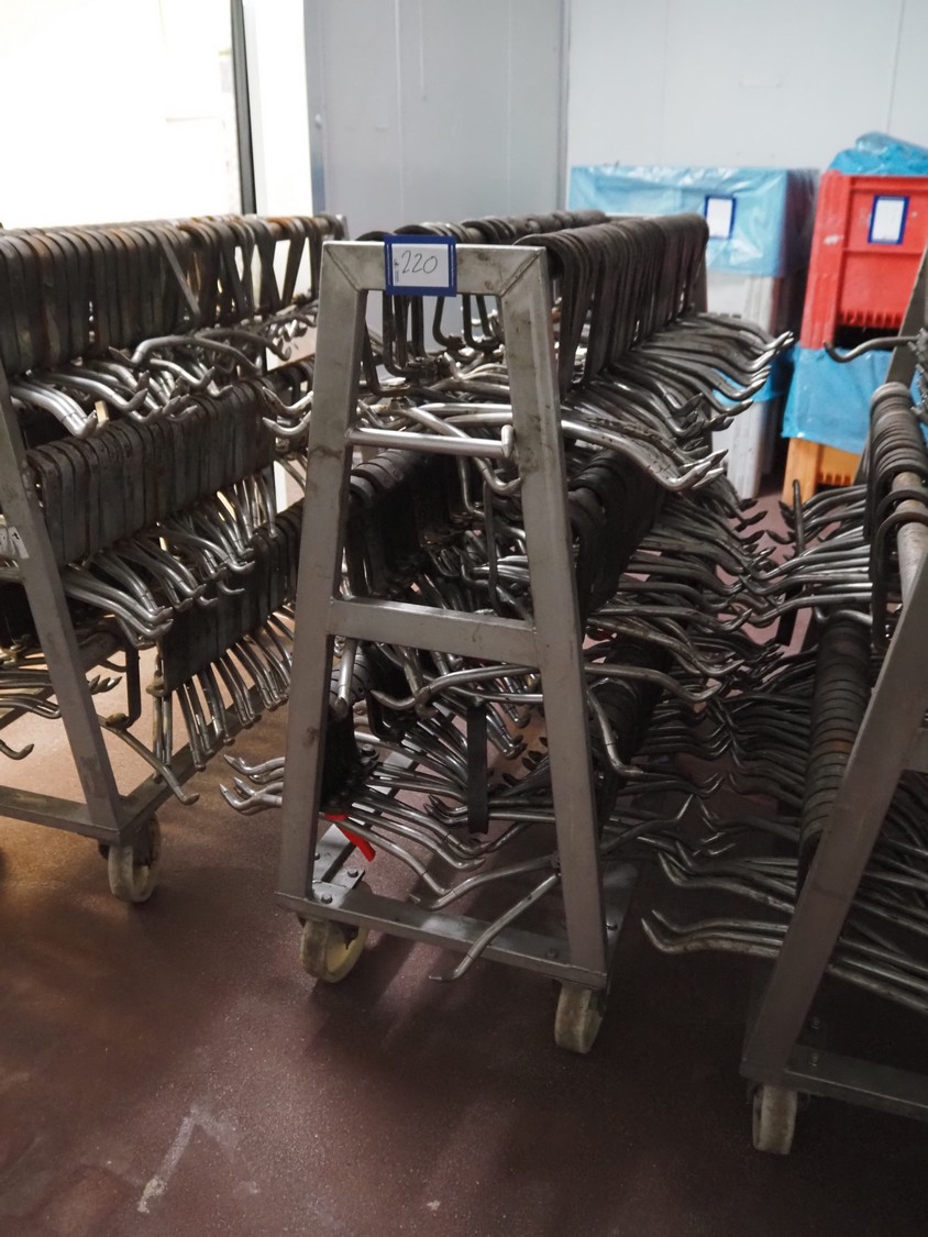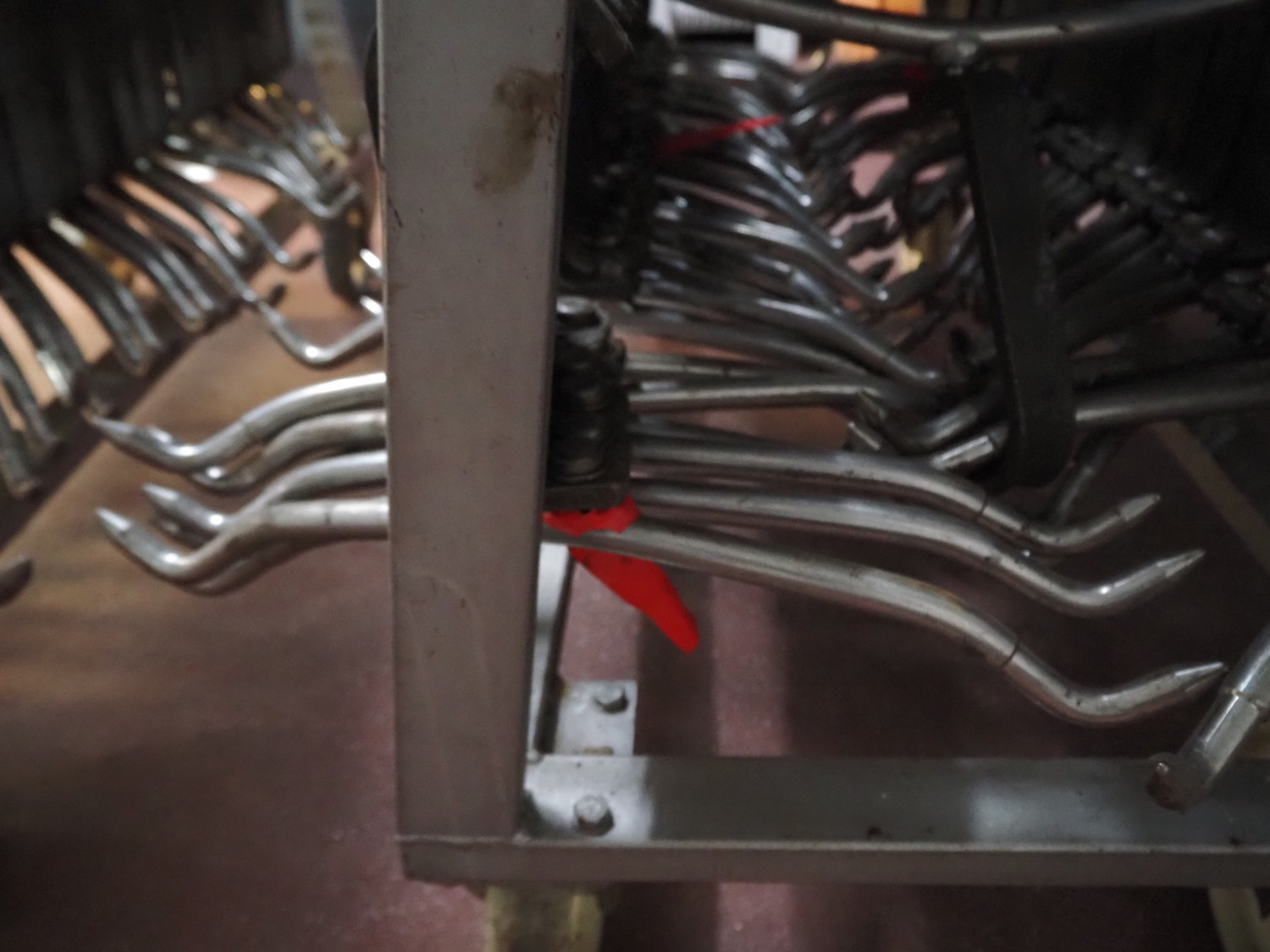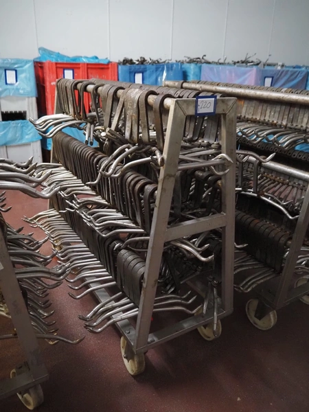 S/s trolley with large amount of spreading hooks, dimensions each hook: 500 mm x 300 mm, total dimensions: 1500 mm x 650 mm x 1350 mm.