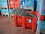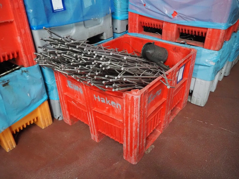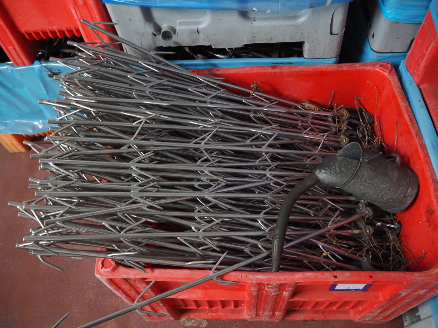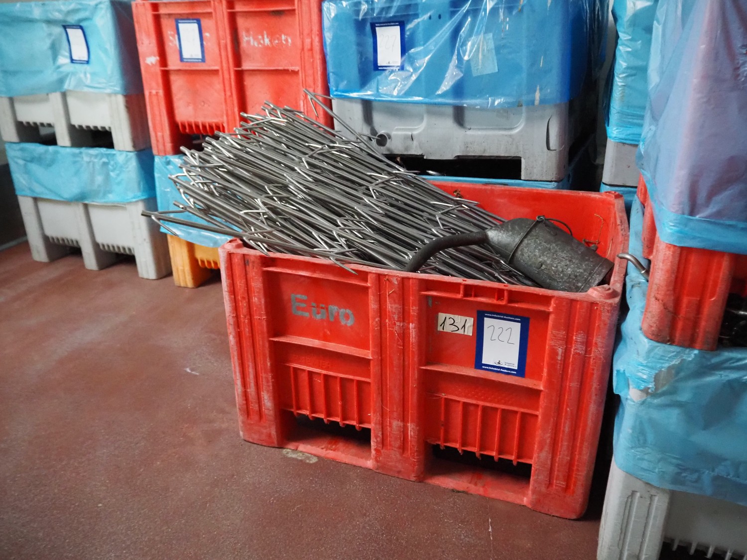 Plastic pallet box with large amount of organ hooks, length each hook: 1250 mm, total dimensions: 1300 mm x 1000 mm x 900 mm.