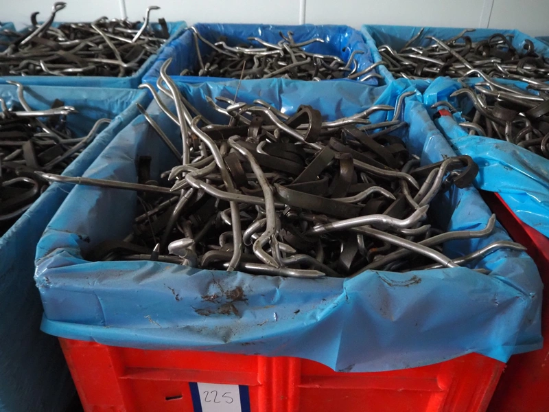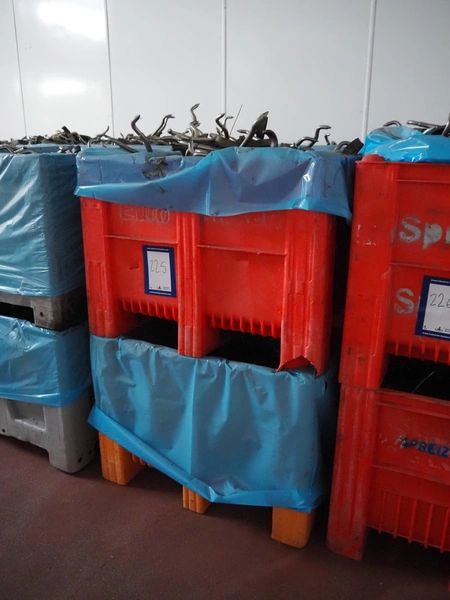 8 plastic pallet boxes with large amount of spreading hooks, dimensions: (8x) 1200 mm x 1000 mm x 700 mm.