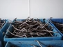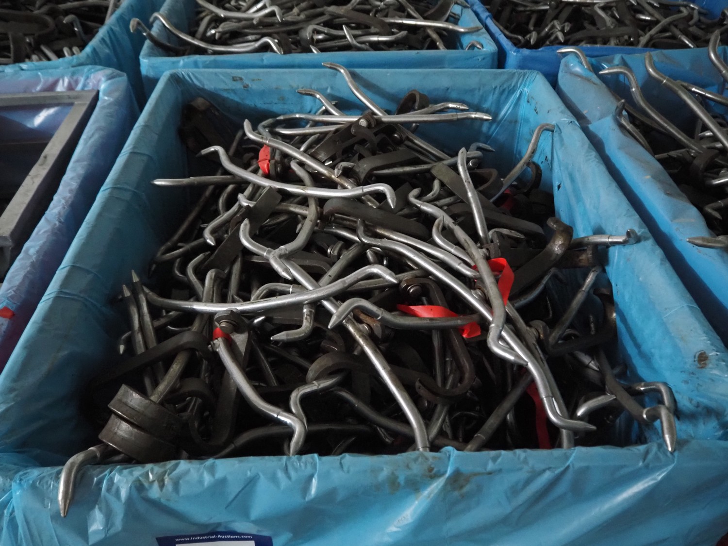 3 plastic pallet boxes with large amount of spreading hooks, dimensions: (3x) 1200 mm x 1000 mm x 700 mm.