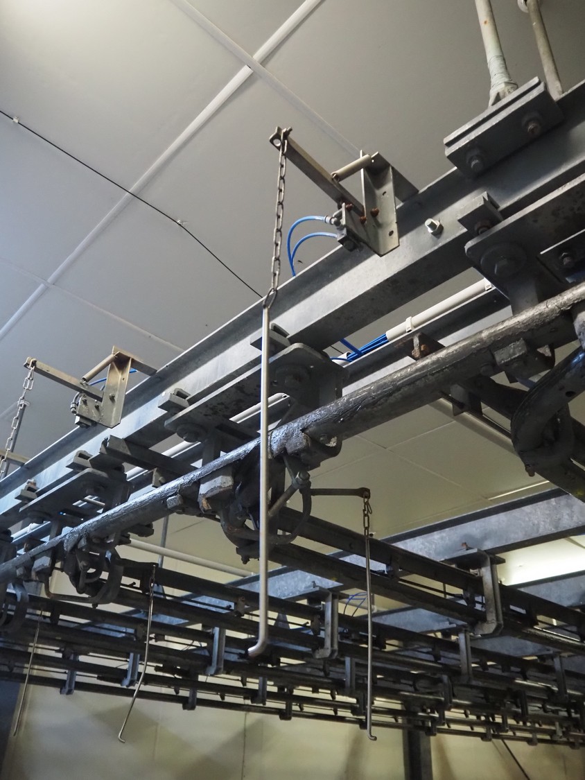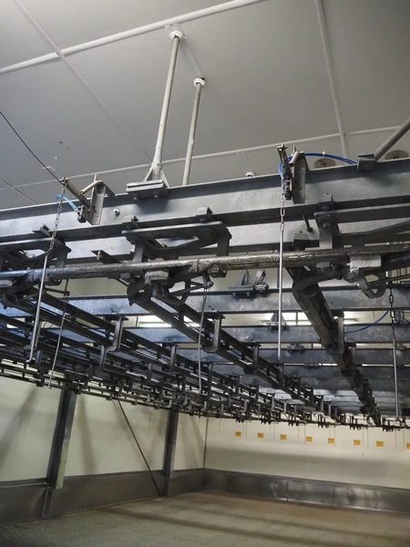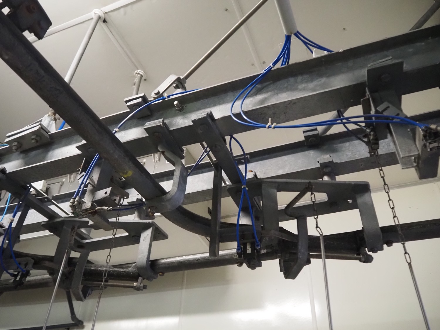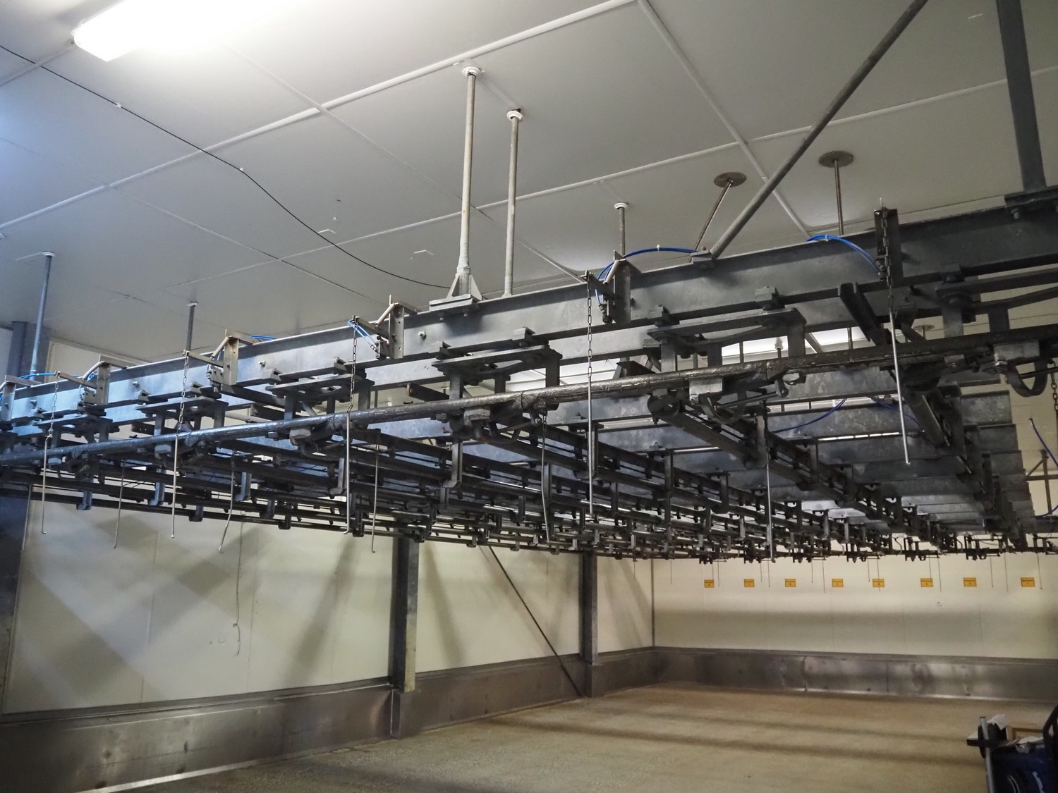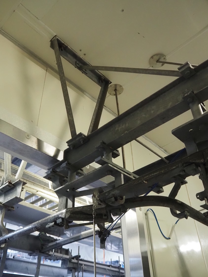Steel tube rail overhead conveyor system for cold store with infeed- and outfeed lane, 16 pneumatic switches, diameter tube: 60 mm, 8 lanes, length each lane: 14000 mm.