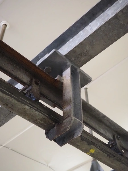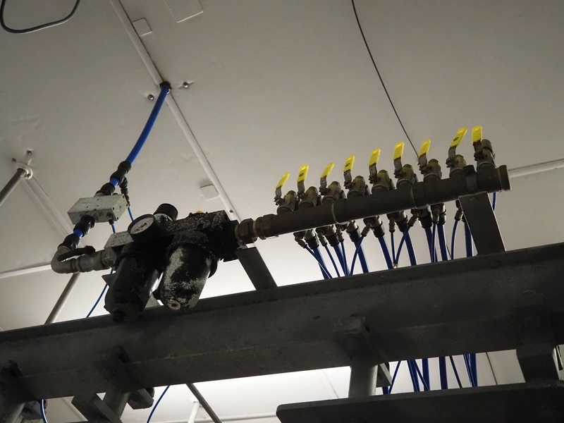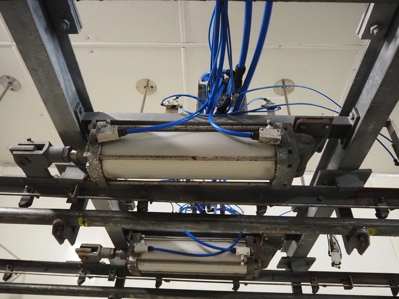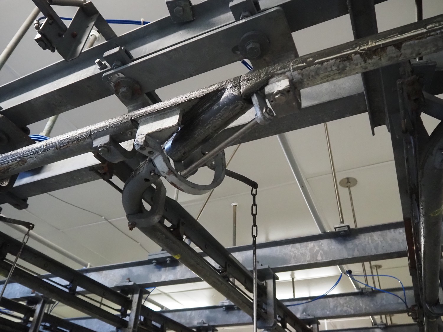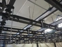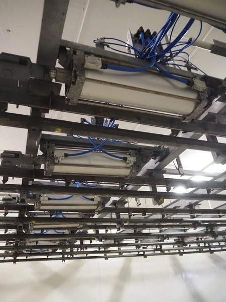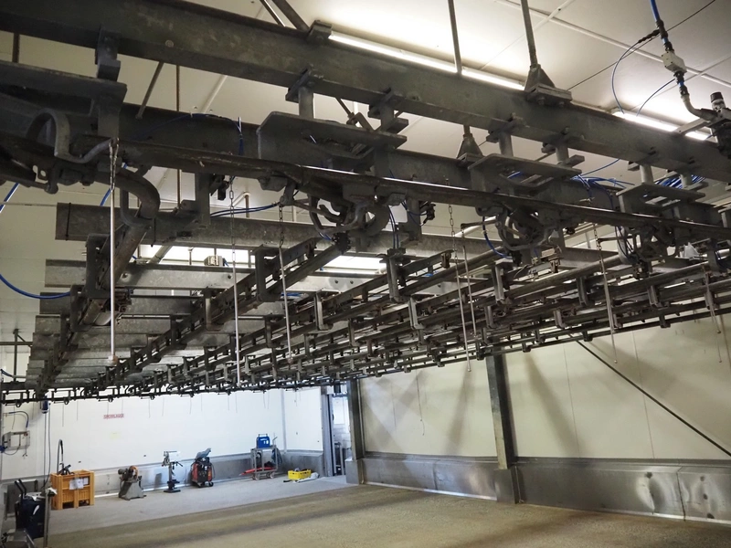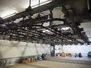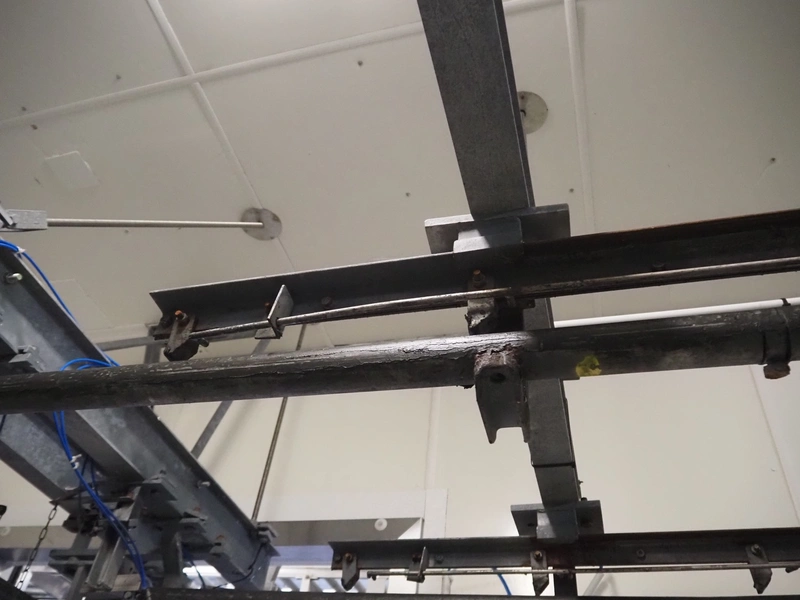 Steel tube rail overhead conveyor system for cold store with infeed- and outfeed lane, 16 pneumatic switches, diameter tube: 60 mm, 8 lanes, length each lane: 14000 mm.