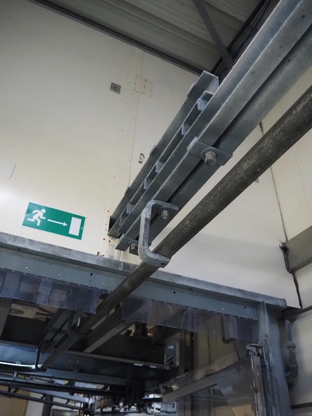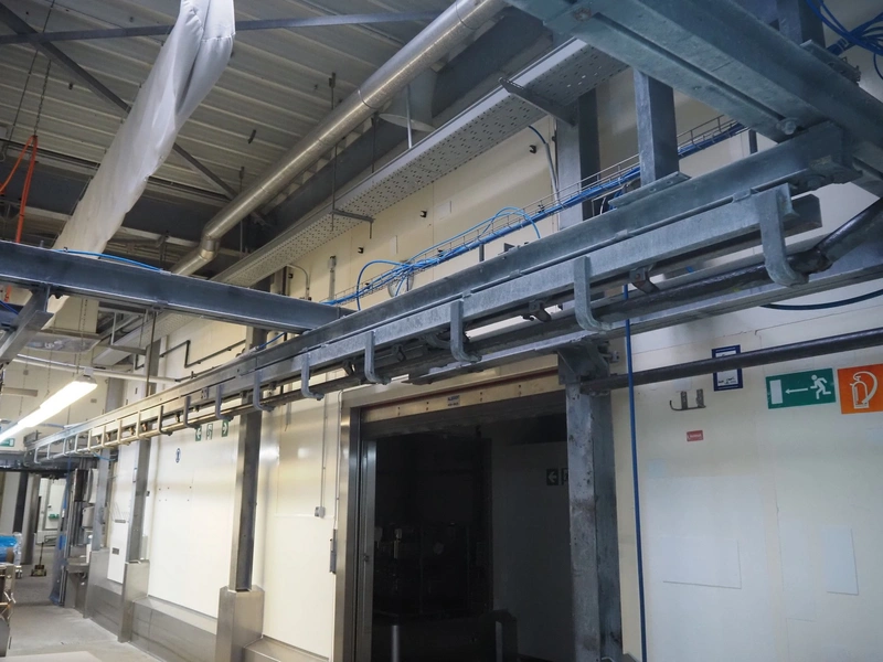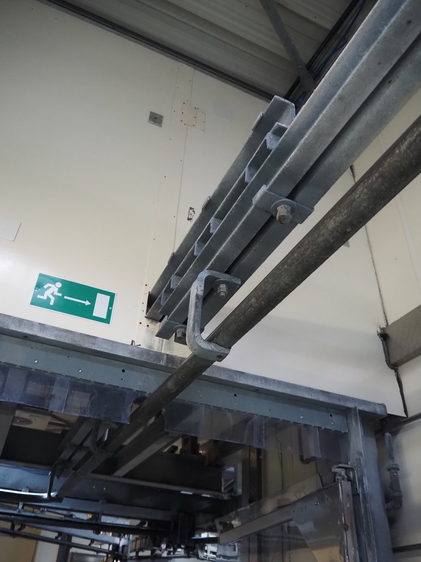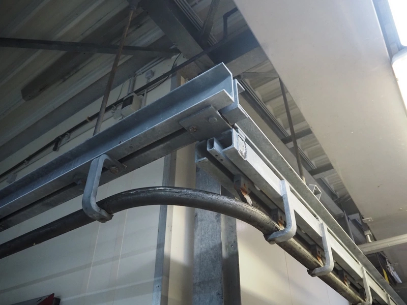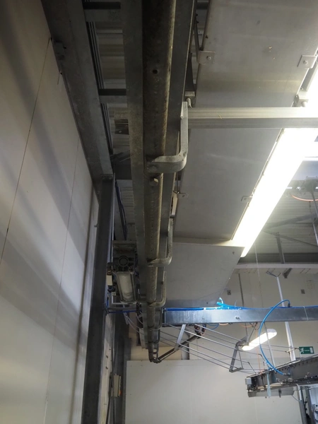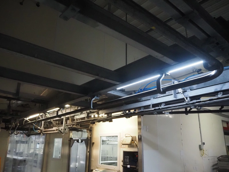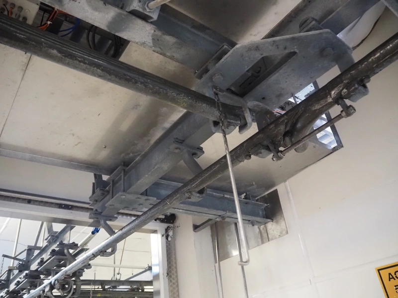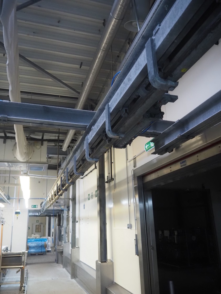 Steel tube rail overhead conveyor to the deboning area, diameter pipe: 60 mm, total length: approximately 40 meters.
