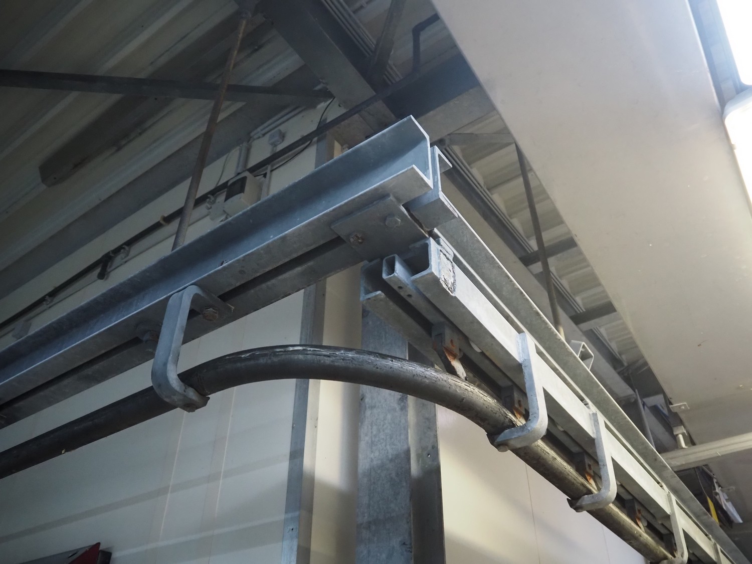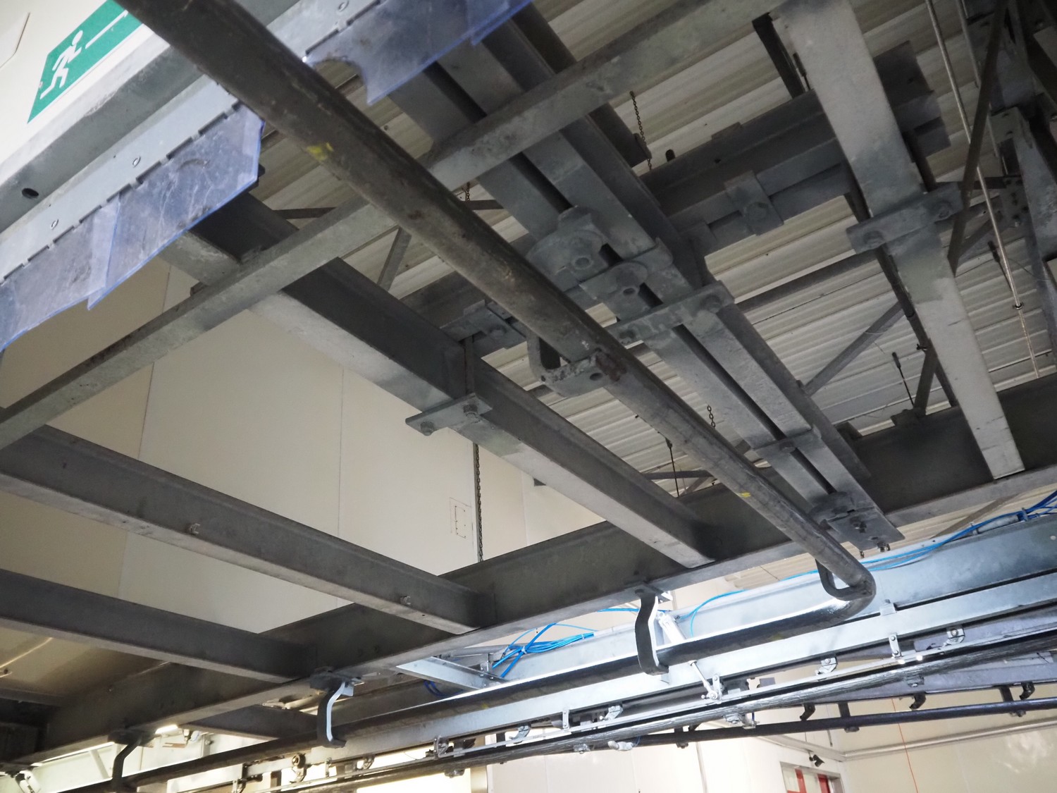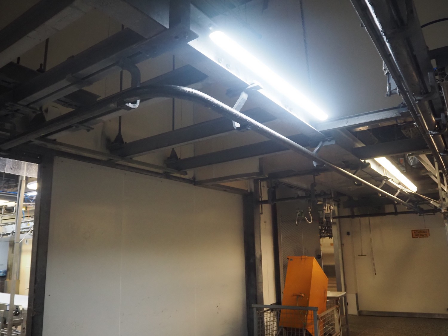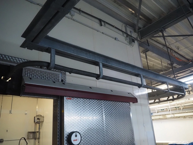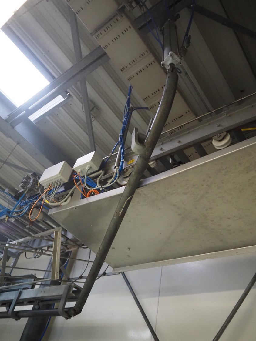 Steel tube rail overhead conveyor to the deboning area, diameter pipe: 60 mm, total length: approximately 40 meters.