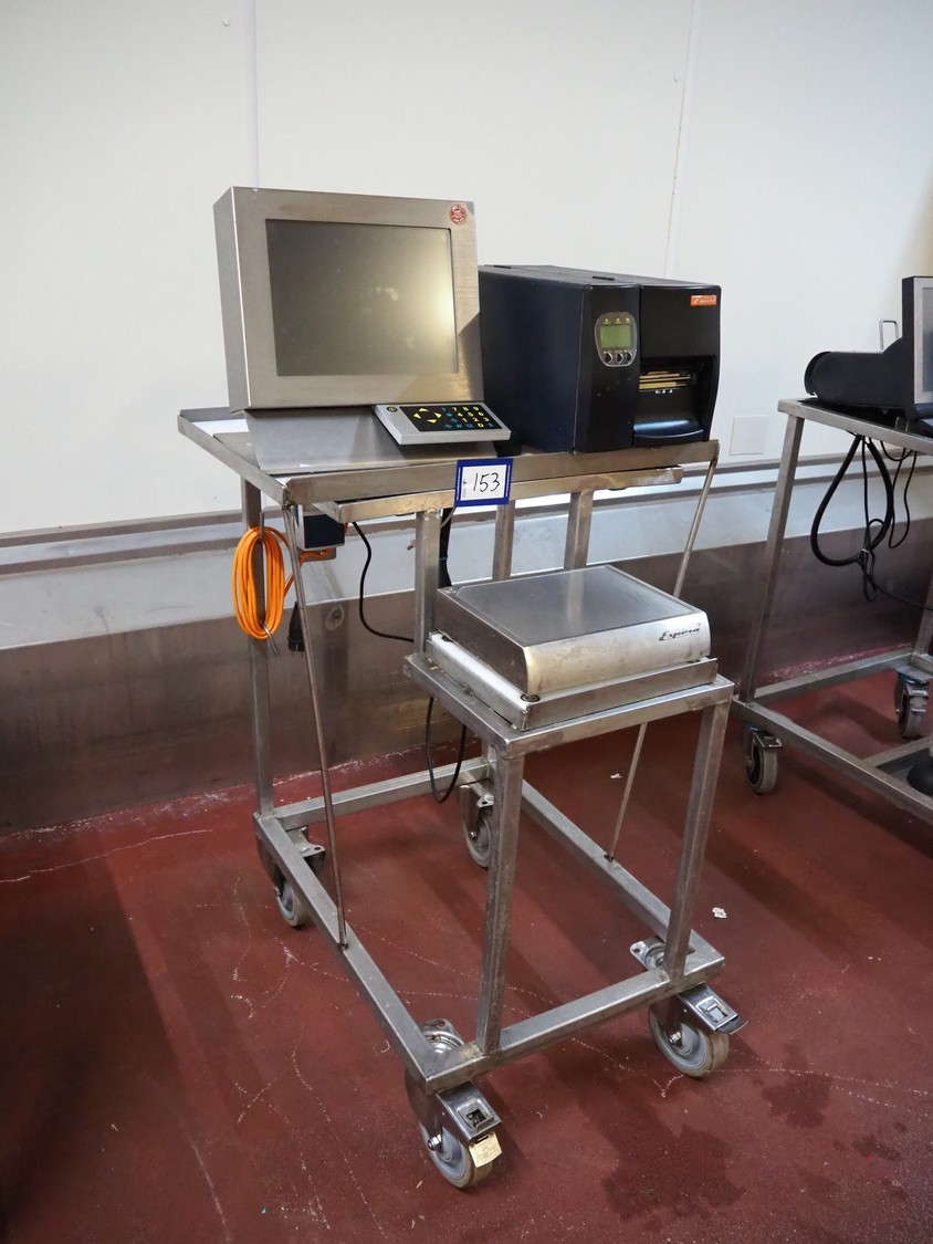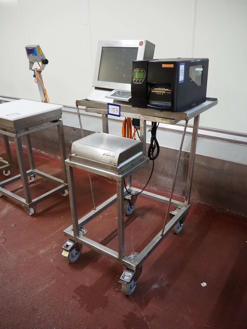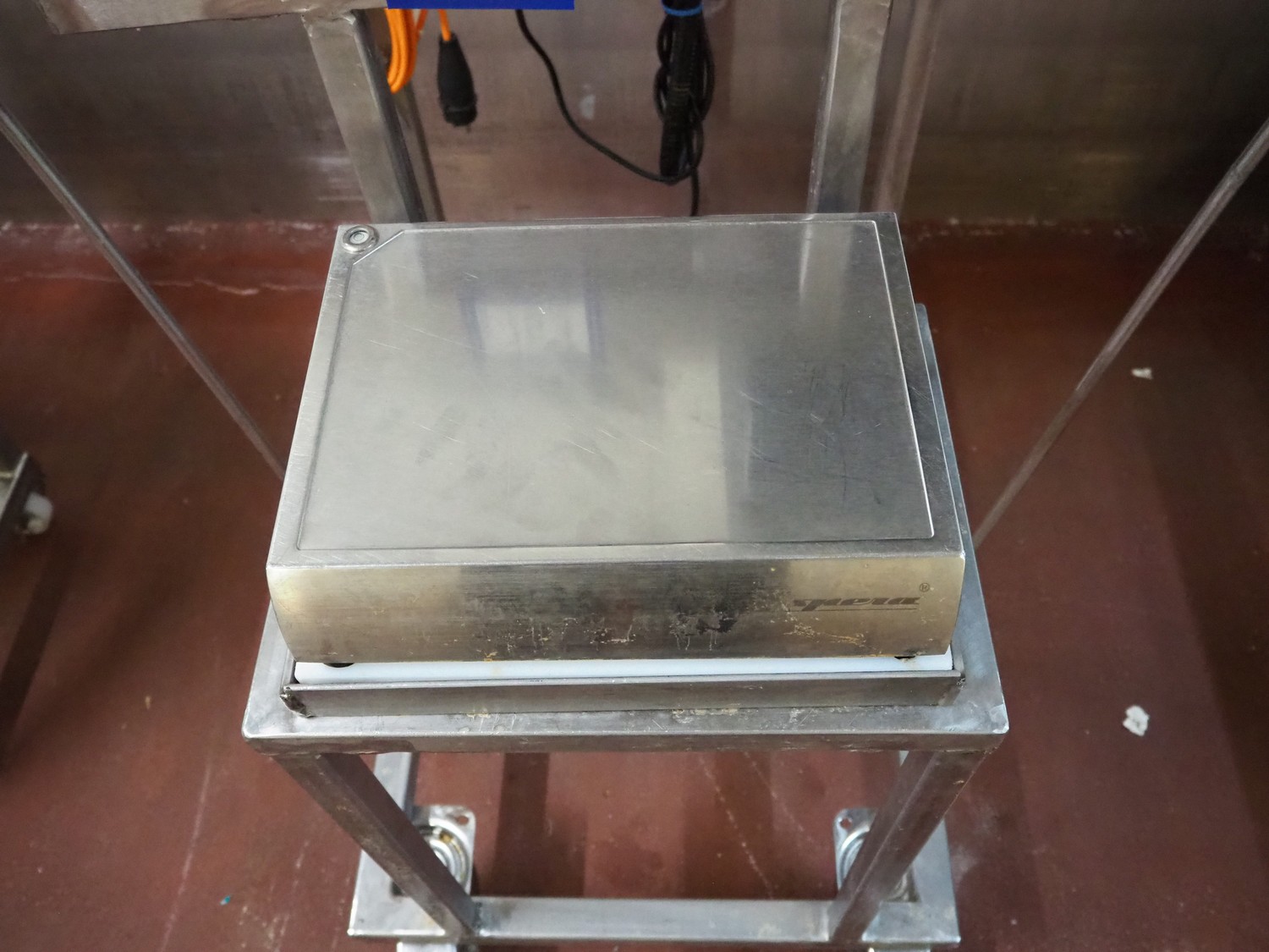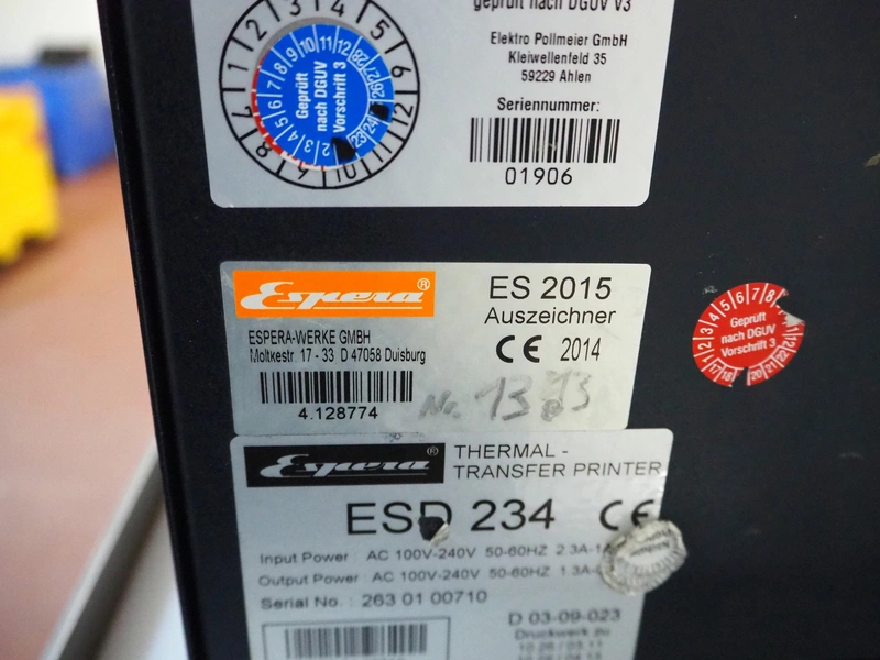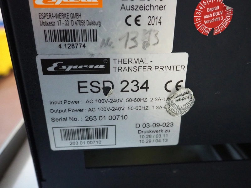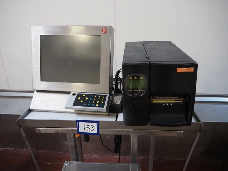Espera weighing scale with indicator and label printer, type weighing scale: ESW 2114, serial number: 2390100319, maximum weight: 3/6/15 kg, minimum weight: 20 g, e=1/2/5 g, T=- 3000 g, dimensions: 800 mm x 800 mm x 1470 mm.