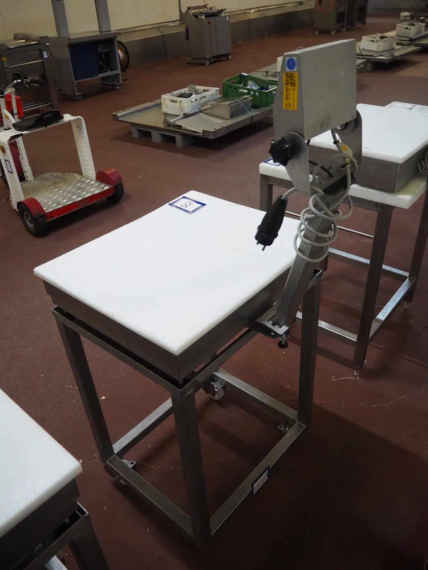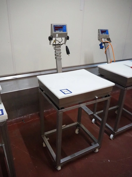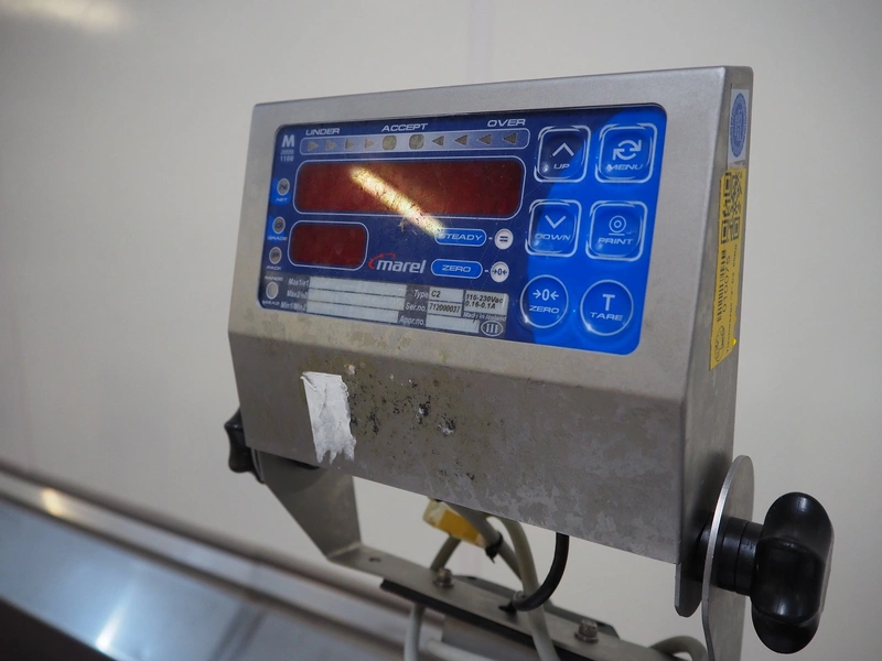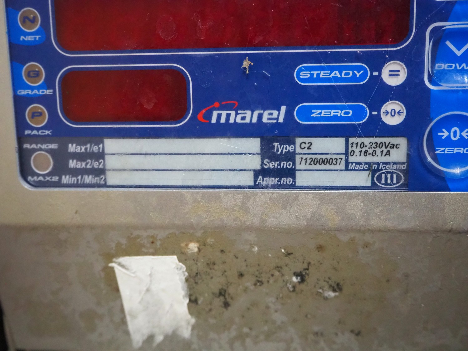 Marel weighing scale, type: C2, serial number: 712000037, 110-230 V, 0.16-0.1 A, dimensions: 630 mm x 600 mm x 1450 mm.
