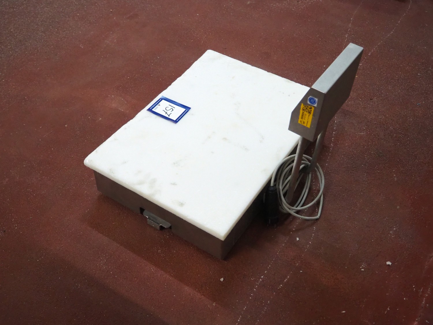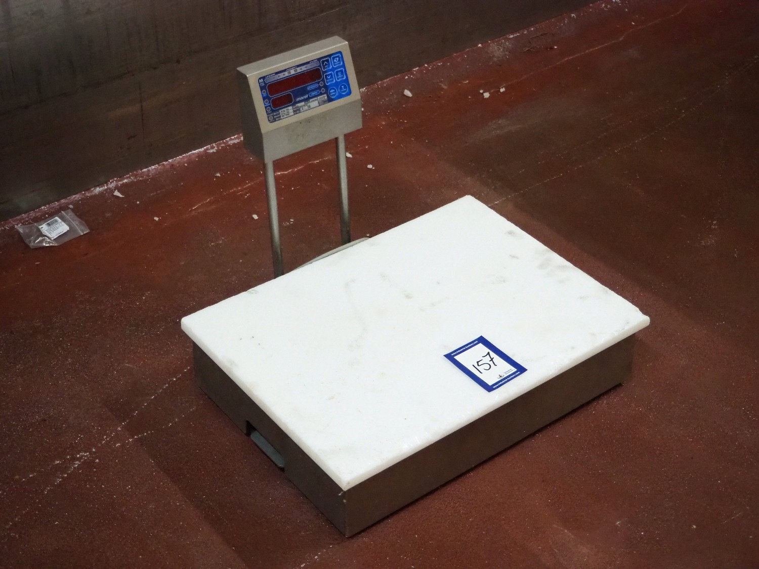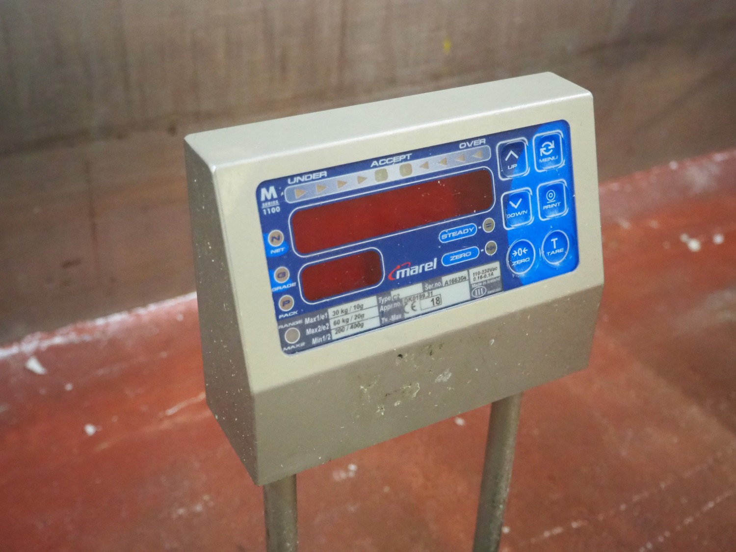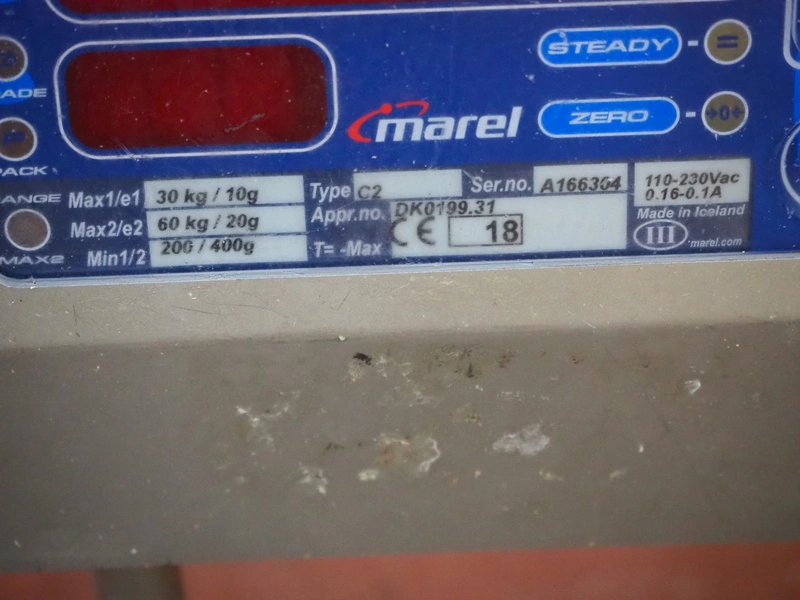 Marel weighing scale, type: C2, serial number: A166354, 110-230 V, 0.16-0.1 A, maximum weight: 30/60 kg, minimum weight: 200/400 g, e=10/20 g, dimensions: 560 mm x 480 mm x 470 mm.