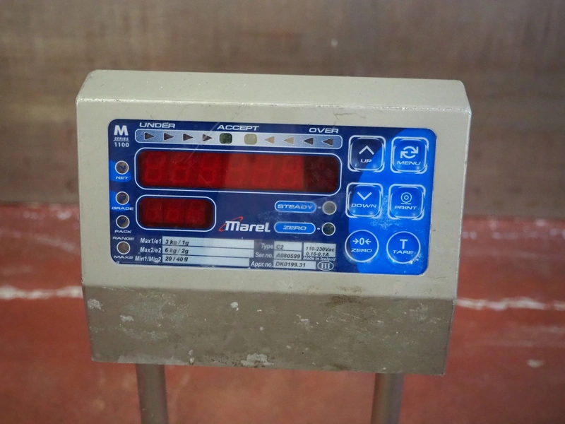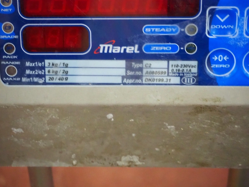 Marel weighing scale, type: C2, serial number: A080599, 110-230 V, 0.16-0.1 A, maximum weight: 3/6 kg, minimum weight: 20/40 g, e=1/2 g, dimensions: 340 mm x 300 mm x 480 mm.