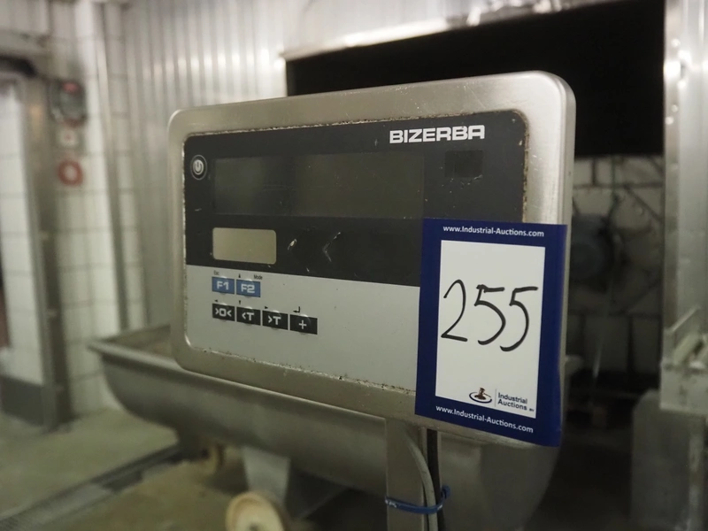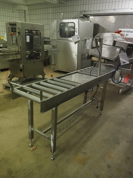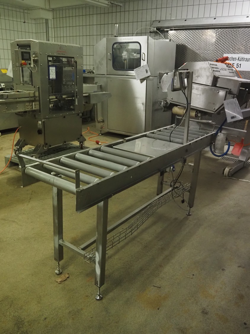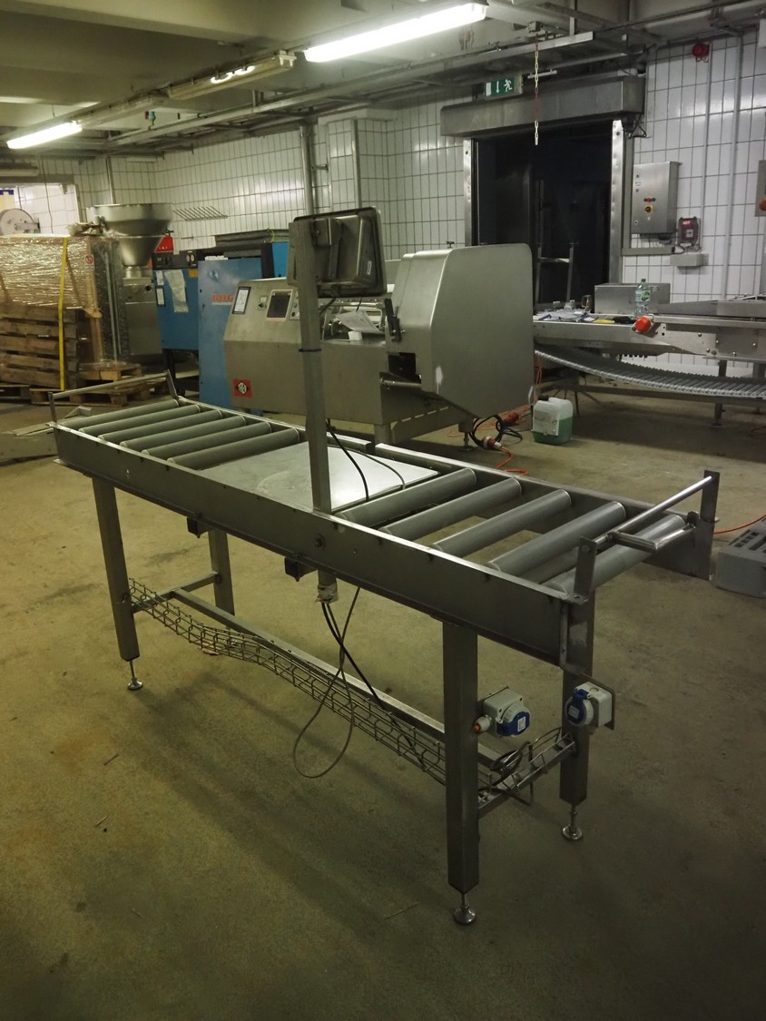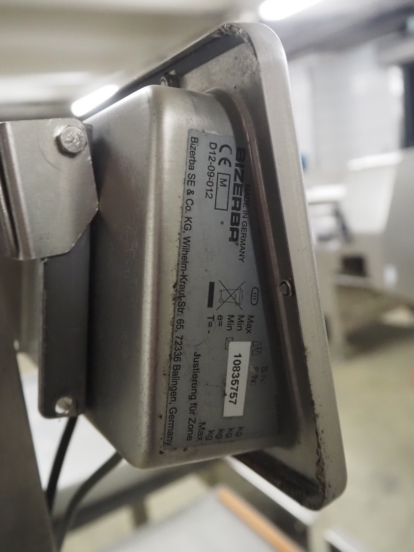Bizerba weighing scale with indicator and roller conveyor, serial number: 10835757, scale dimensions: 500 mm x 400 mm, roller width: 430 mm, total dimensions: 2150 mm x 500 mm x 1540 mm.