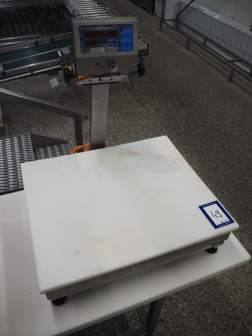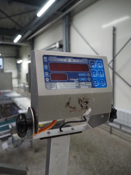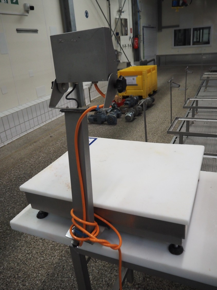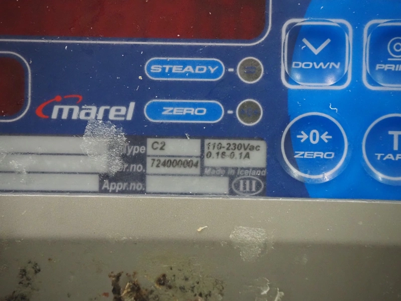 Marel weighing scale, type: C2, serial number: 724000004, 110-230 V, 0.16-0.1 A, dimensions: 620 mm x 520 mm x 580 mm.