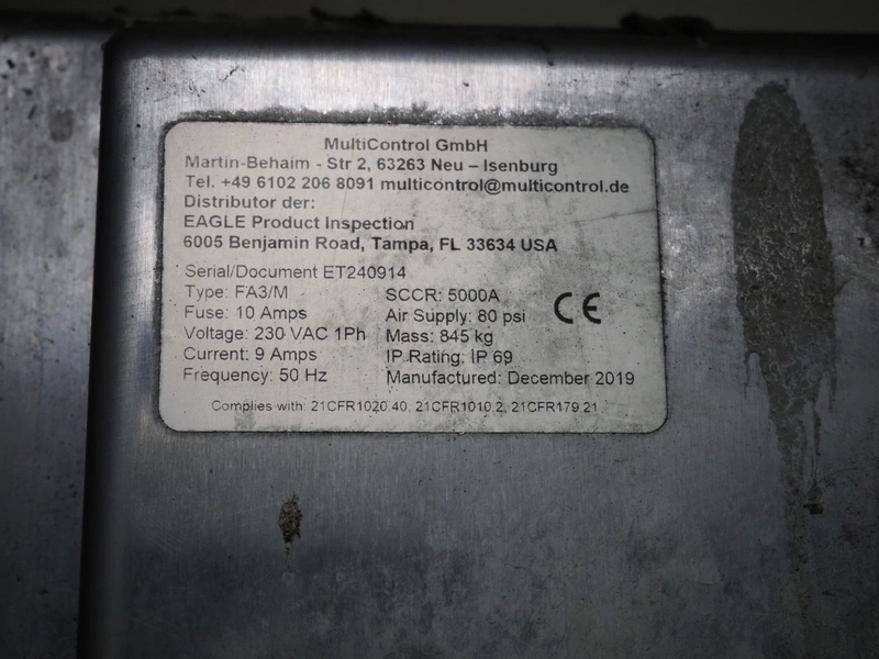 MultiControl GmbH x-ray scanner with infeed belt, type: FA3/M, serial number: ET240914, year of construction: December 2019, 230 V, 1 Ph, 50 Hz, 9 A, clearance: 580 mm x 300 mm, dimensions a-ray scanner: 2300 mm x 1000 mm x 2100 mm, dimensions infeed belt: 2300 mm x 800 mm x 1500 mm.