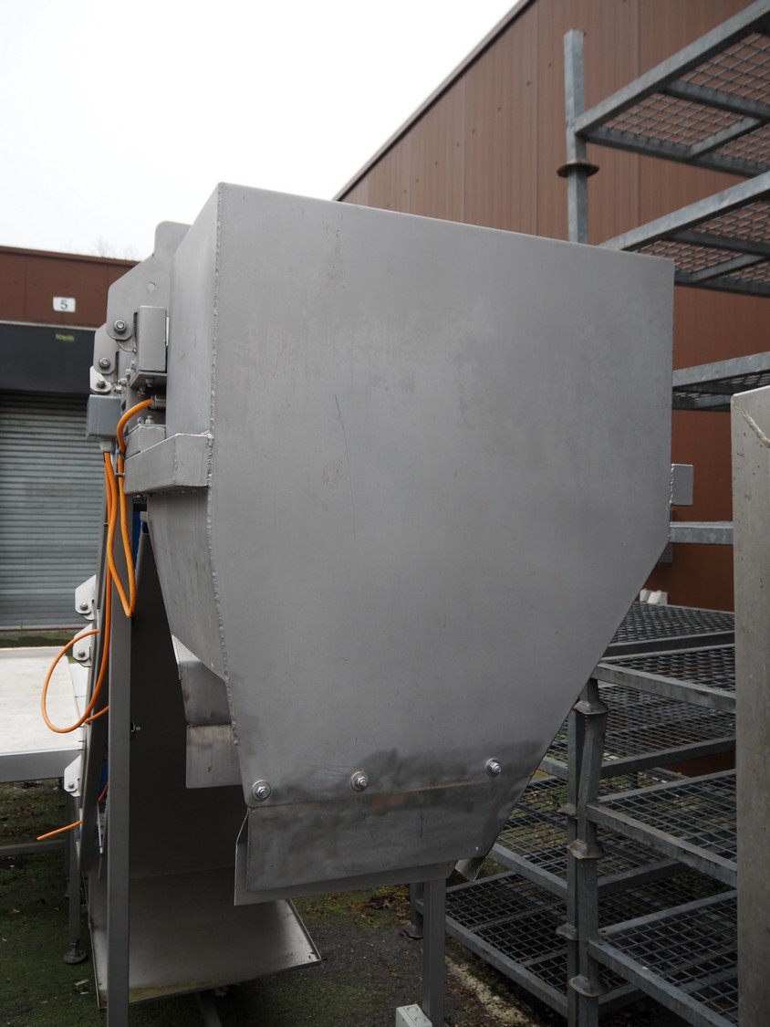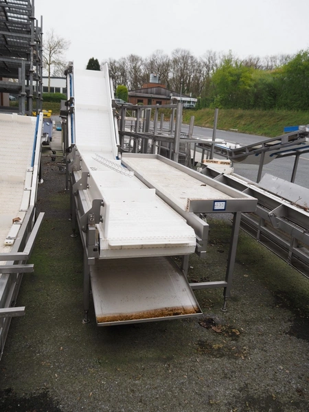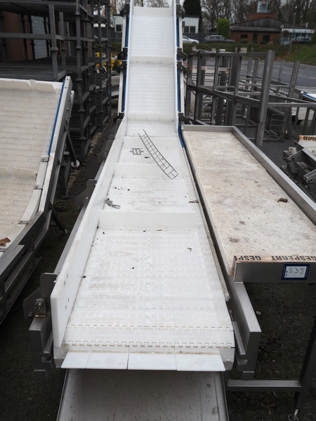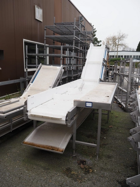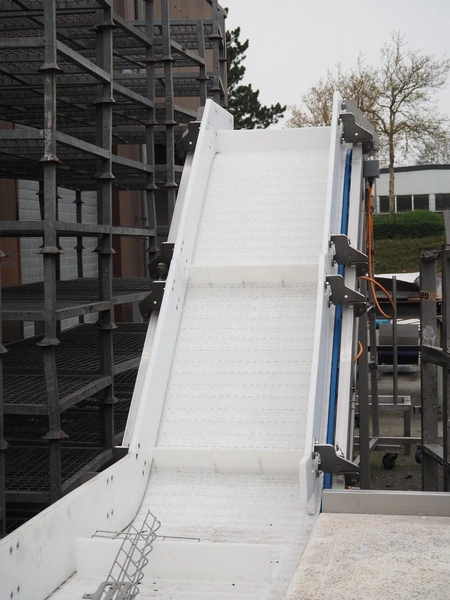 Elevating belt, s/s frame, plastic belt with dividers, belt width: 570 mm, divider height: 100 mm, distance between dividers: 820 mm, elevating height: 2000 mm, total dimensions: 5000 mm x 1300 mm x 2200 mm.
