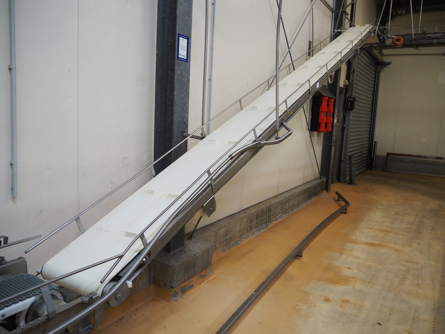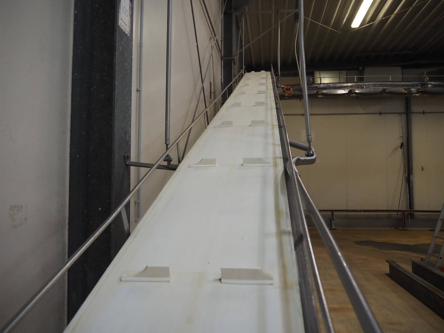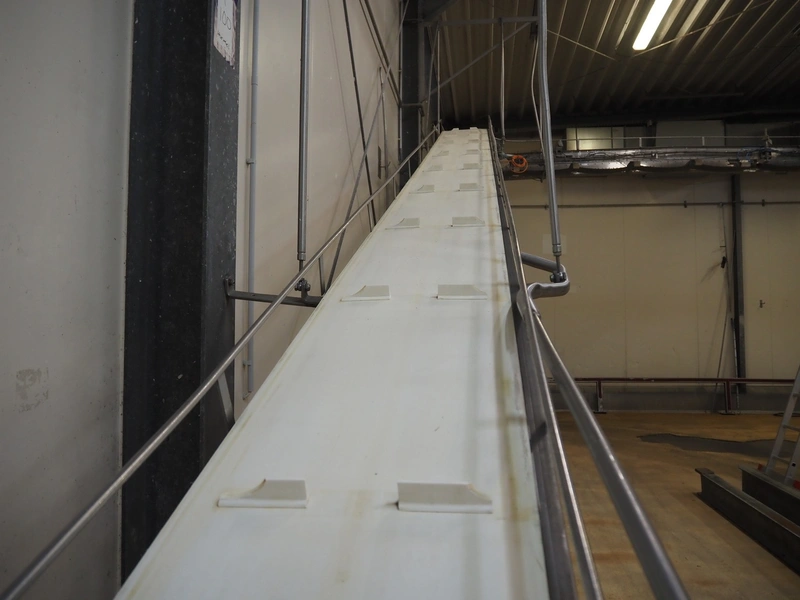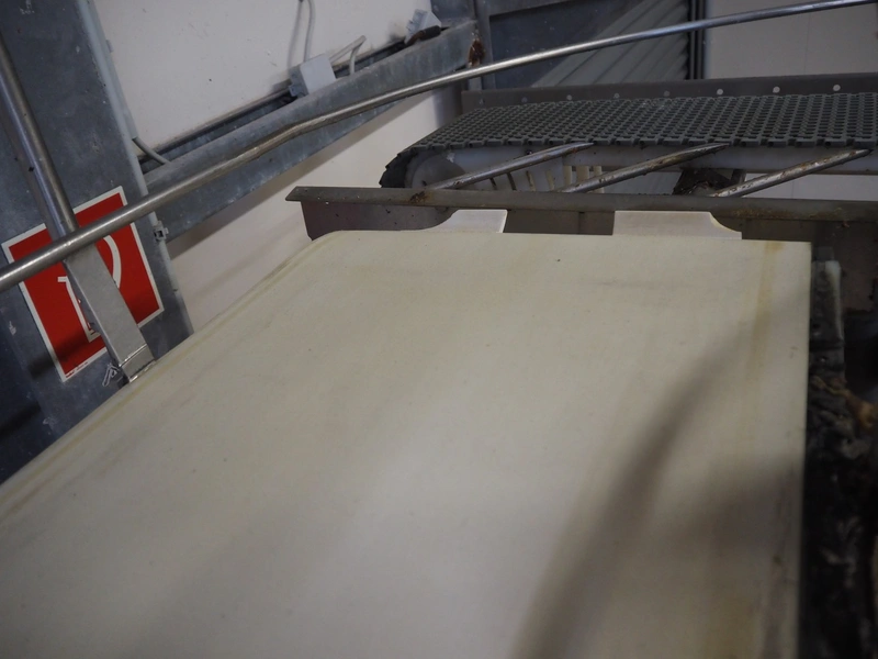 Itec / Attec elevating belt, plastic belt with dividers, belt width: 400 mm, divider height: 40 mm, distance between dividers: 700 mm, elevating height: 2900 mm, total dimensions: 7000 mm x 600 mm x 3000 mm. Including extra belt.