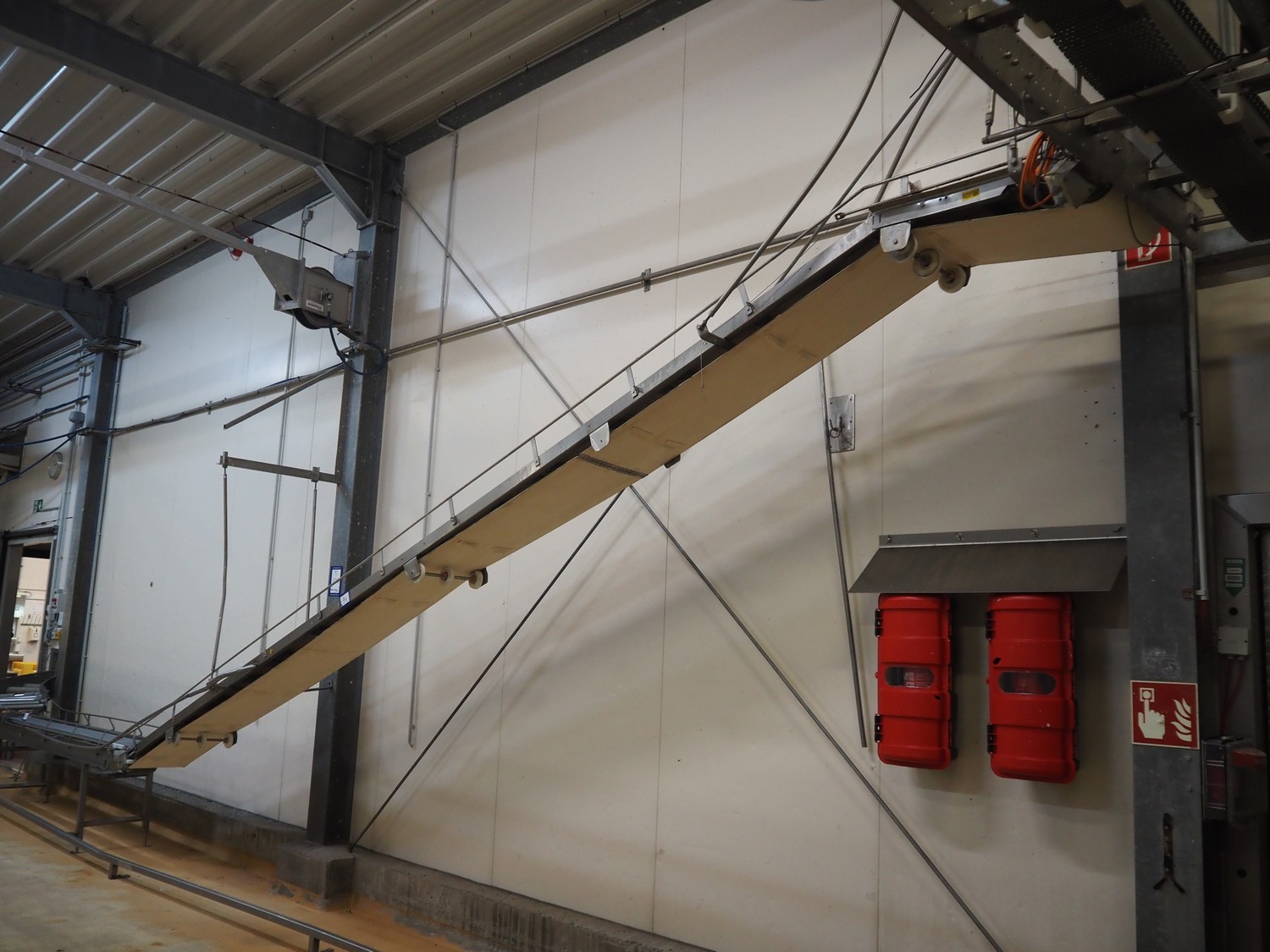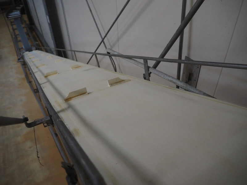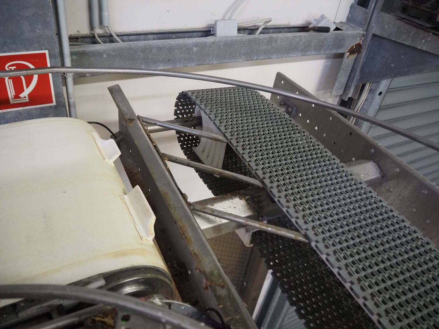 Itec / Attec elevating belt, plastic belt with dividers, belt width: 400 mm, divider height: 40 mm, distance between dividers: 700 mm, elevating height: 2900 mm, total dimensions: 7000 mm x 600 mm x 3000 mm. Including extra belt.