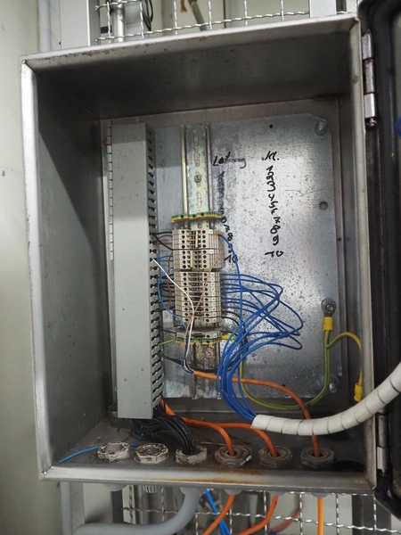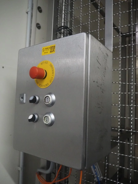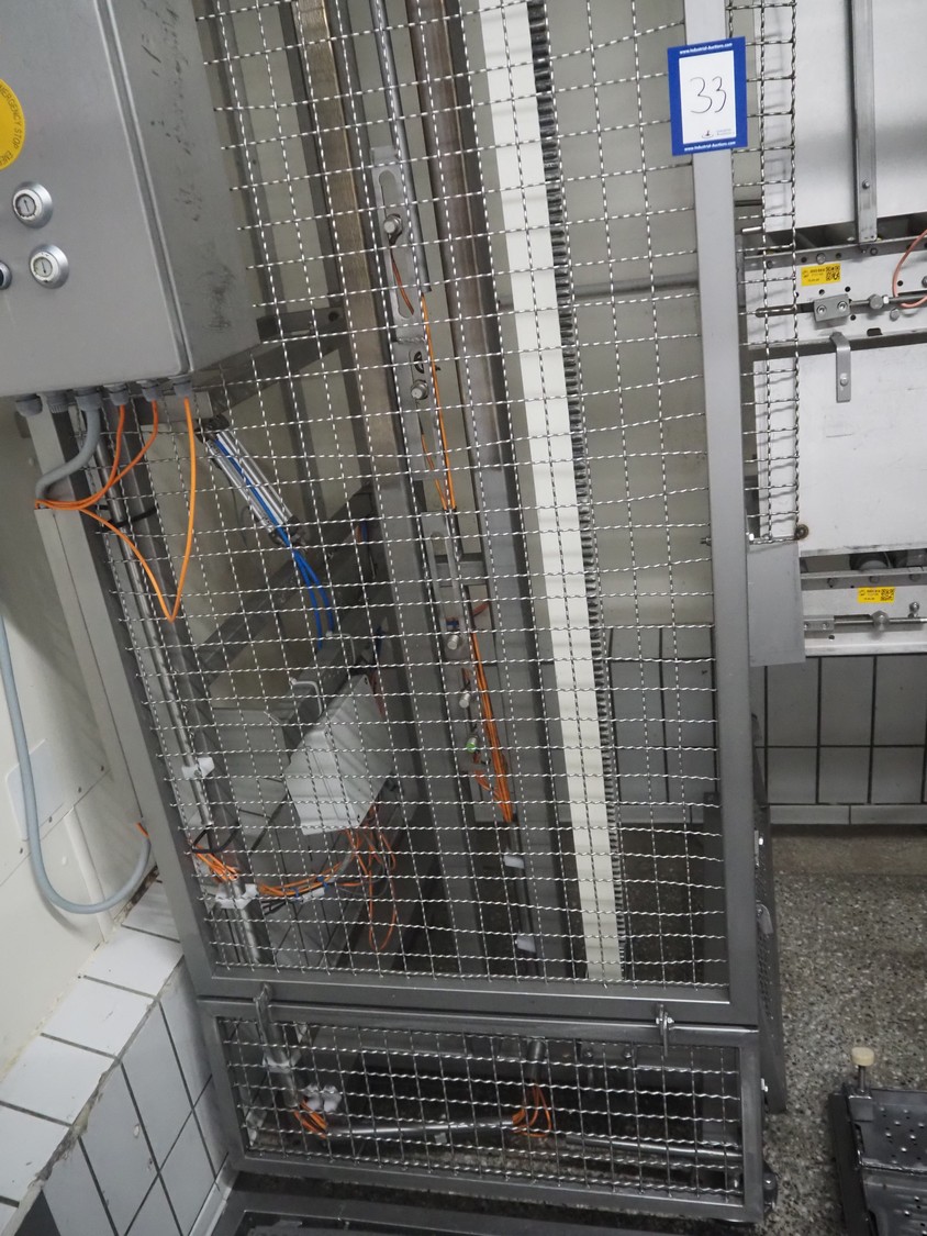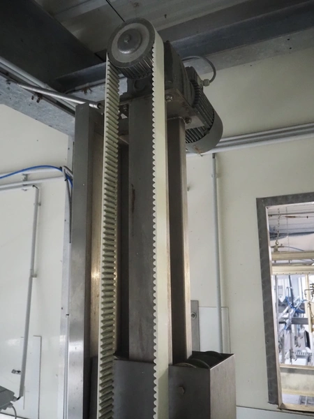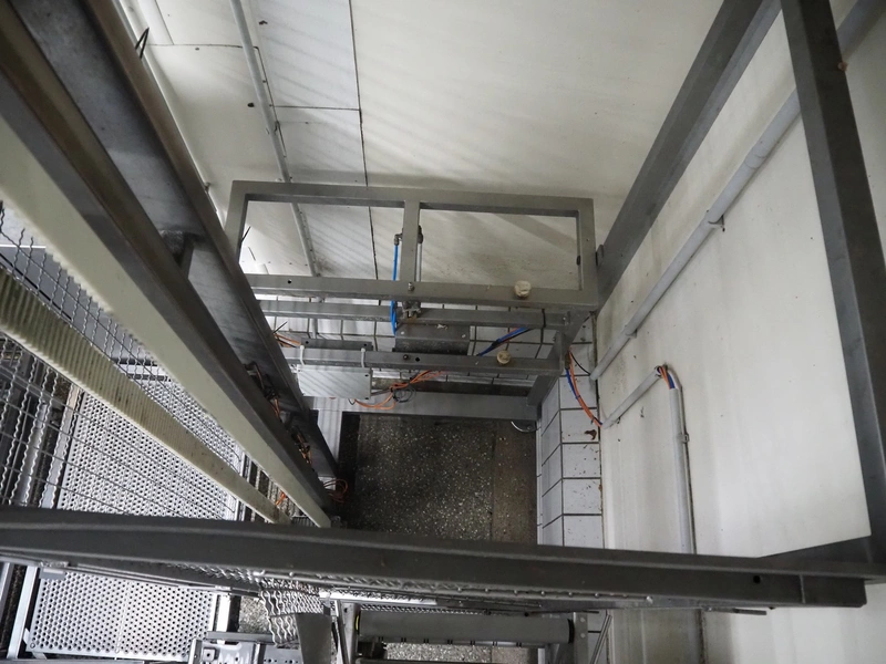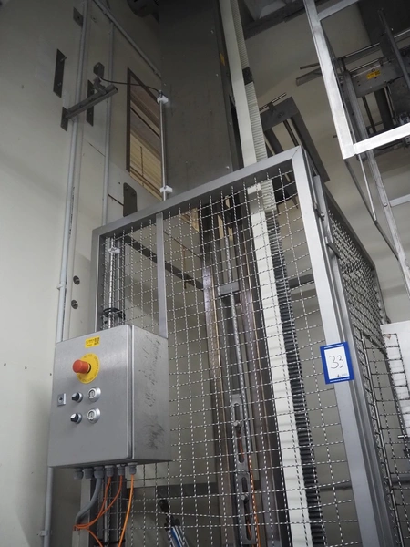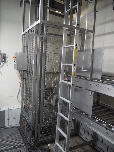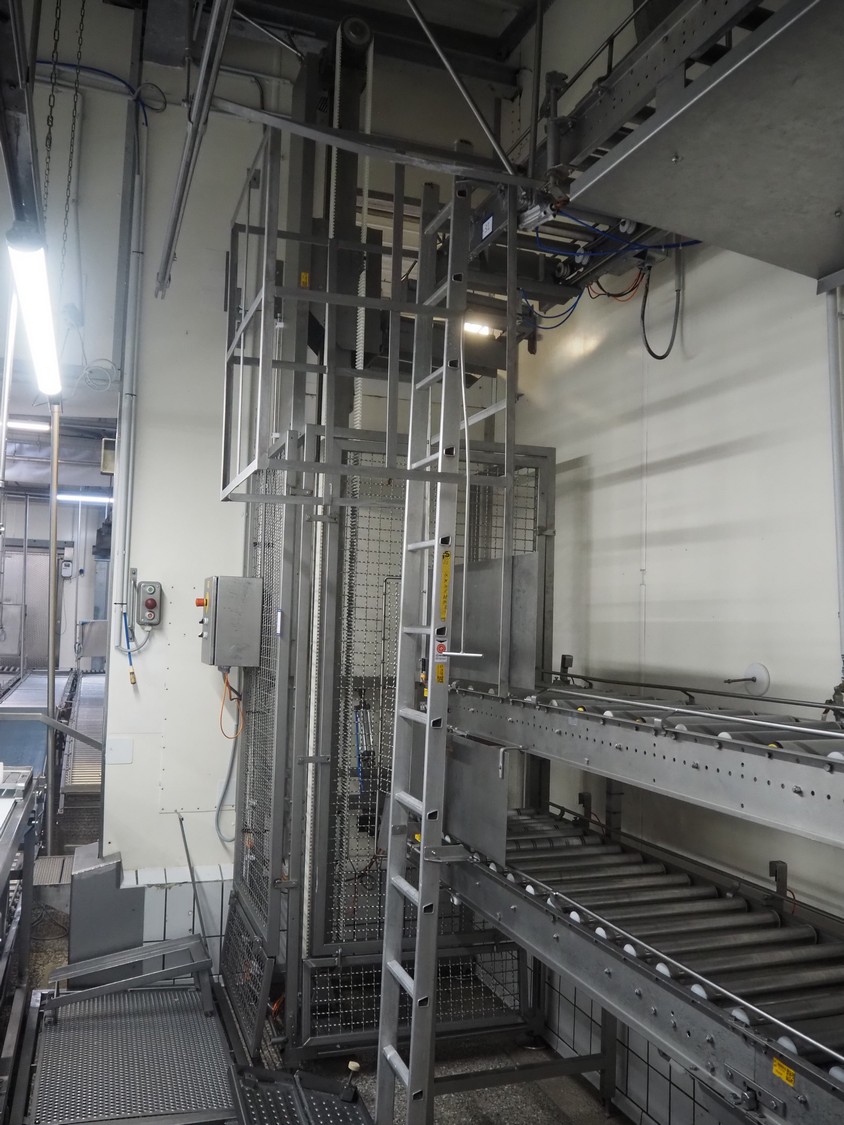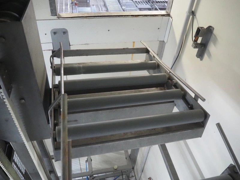 Itec / Attec lifter for crates, plastic rollers, roller width: 430 mm, lifting height: 4200 mm, total dimensions: 1100 mm x 1100 mm x 4350 mm.