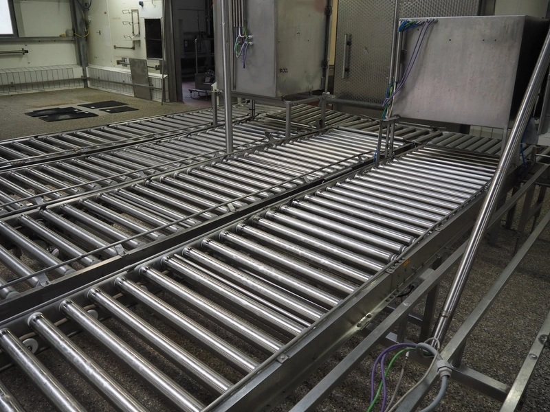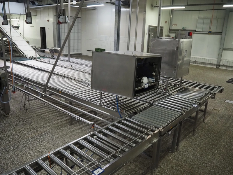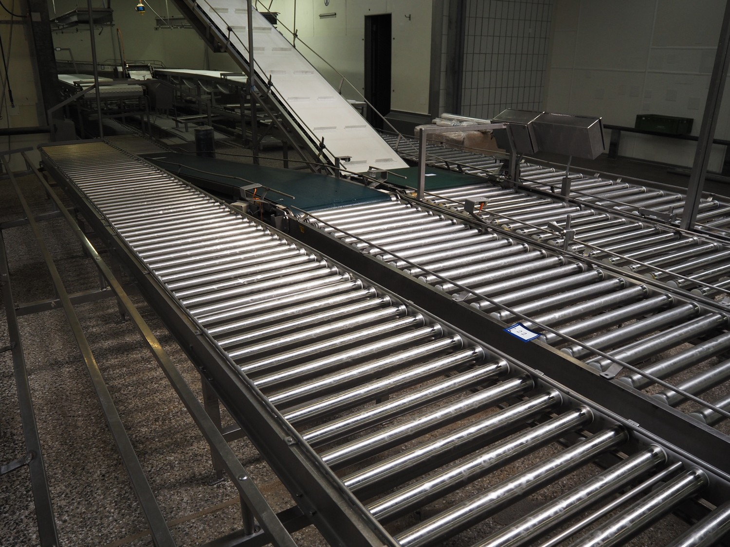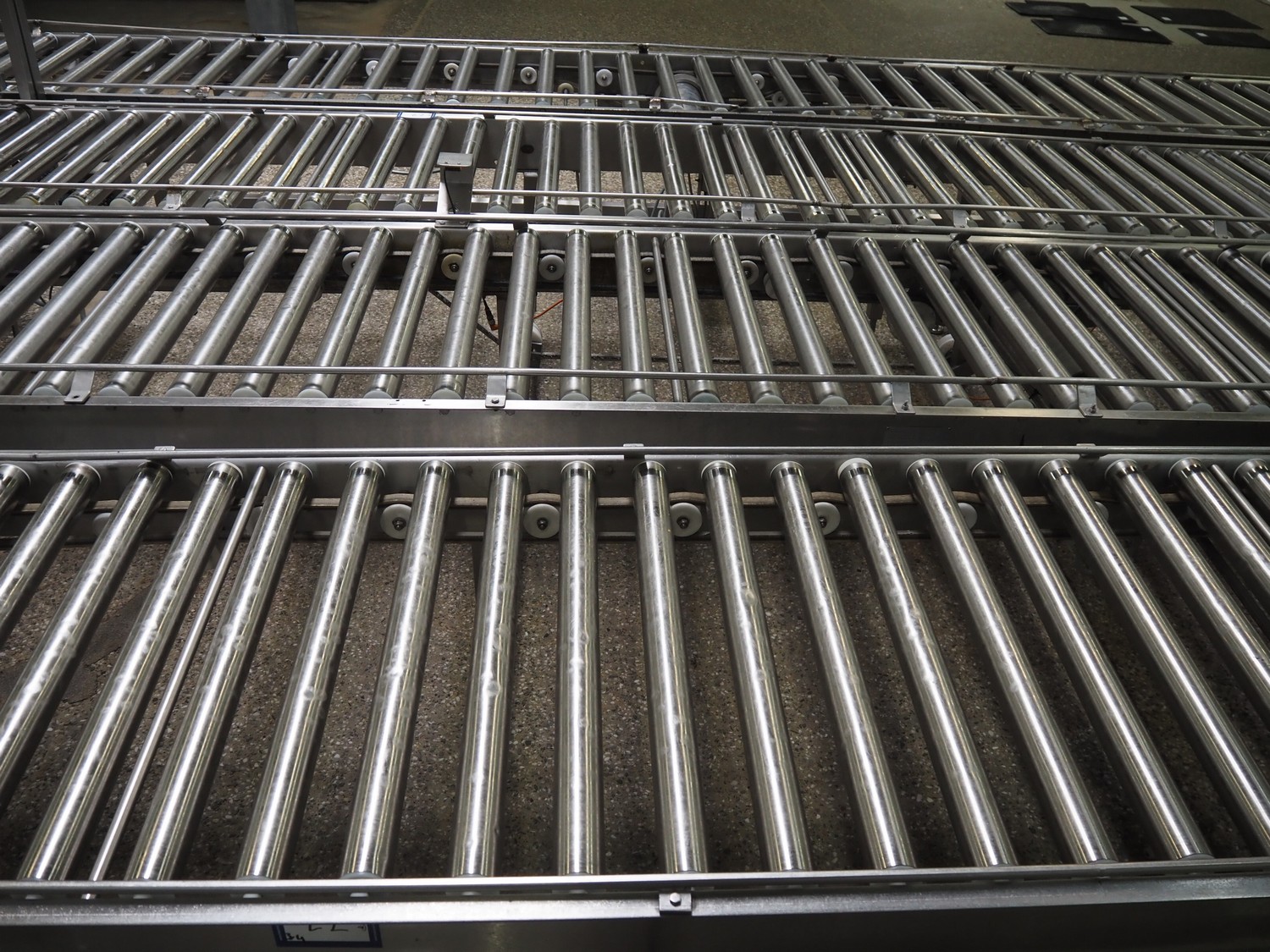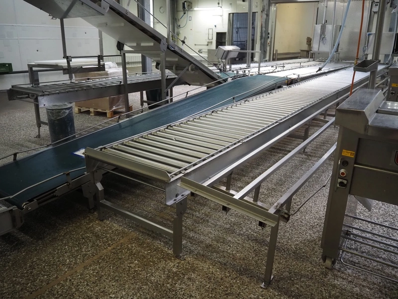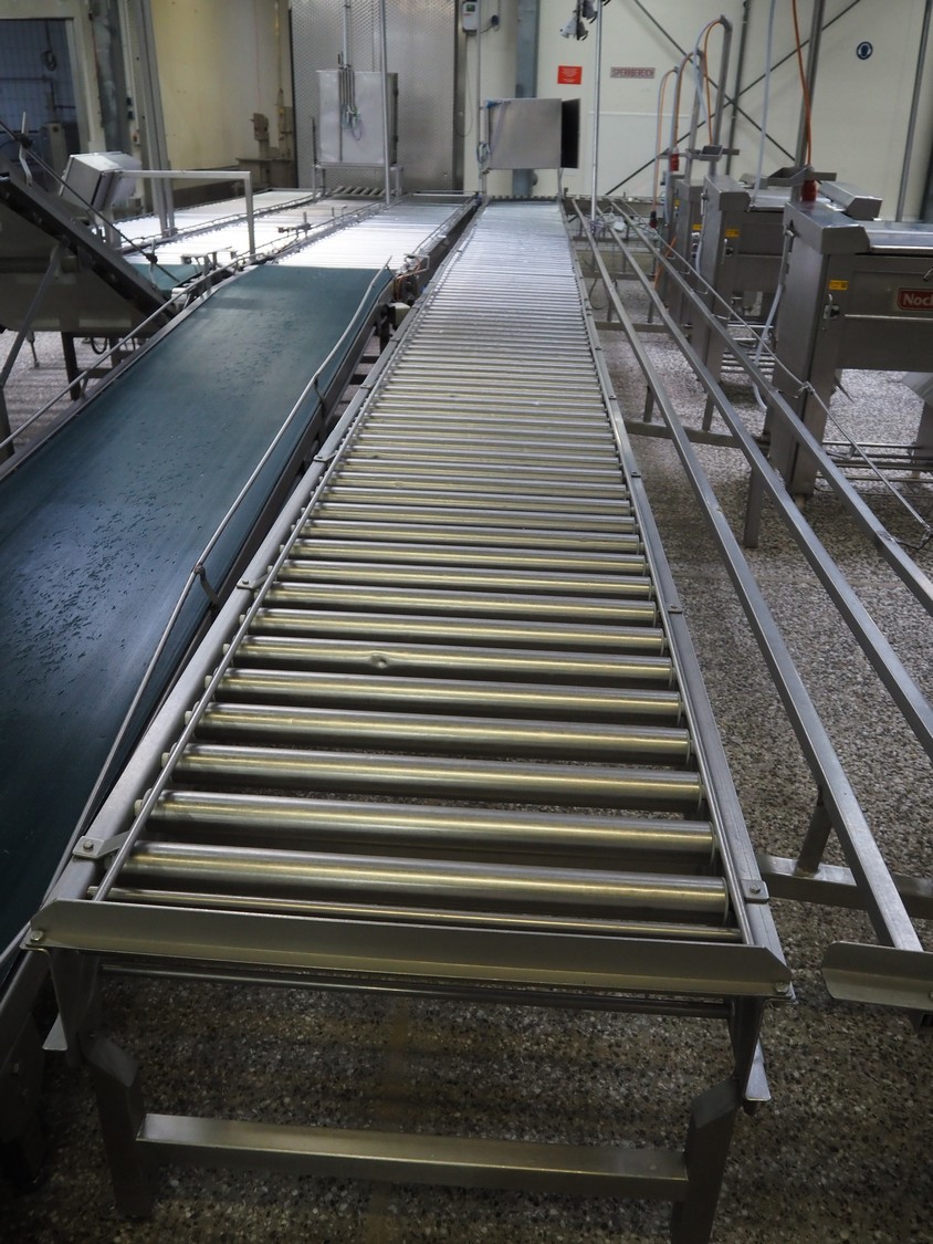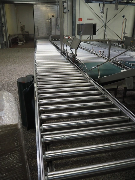 Itec / Attec four-lane roller conveyor, s/s rollers, roller width: (4x) 620 mm, total dimensions: (1x) 12000 mm x 1360 mm x 710 mm, (1x) 12000 mm x 720 mm x 710 mm, (2x) 7000 mm x 720 mm x 710 mm.