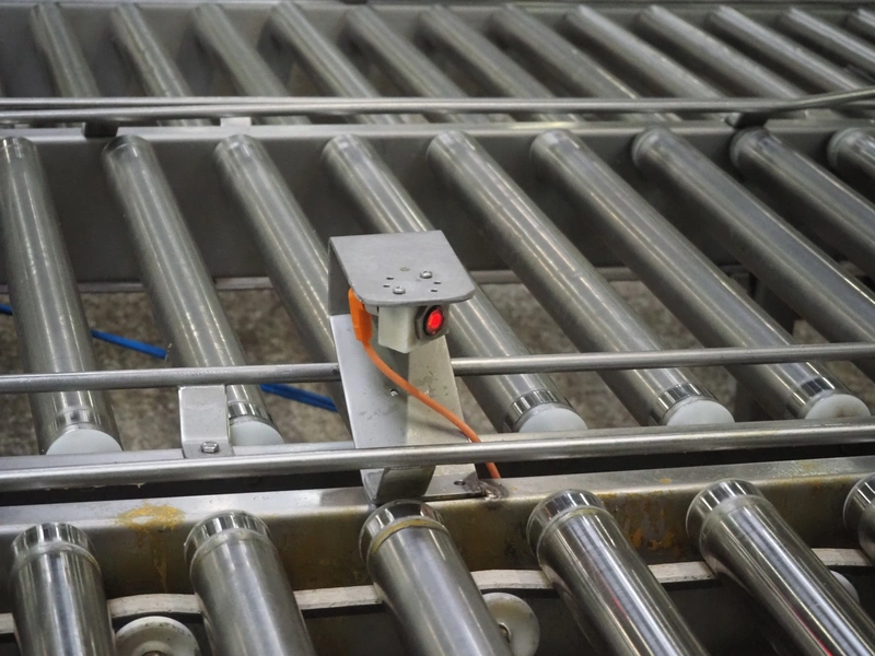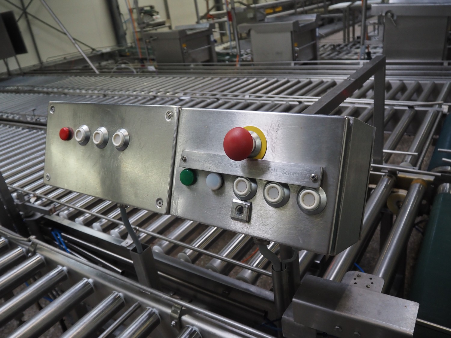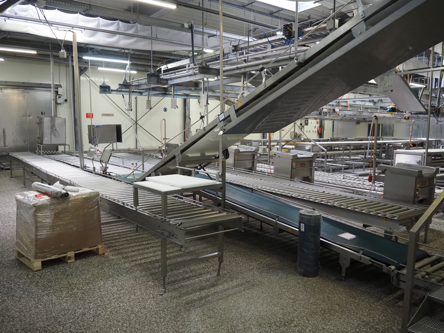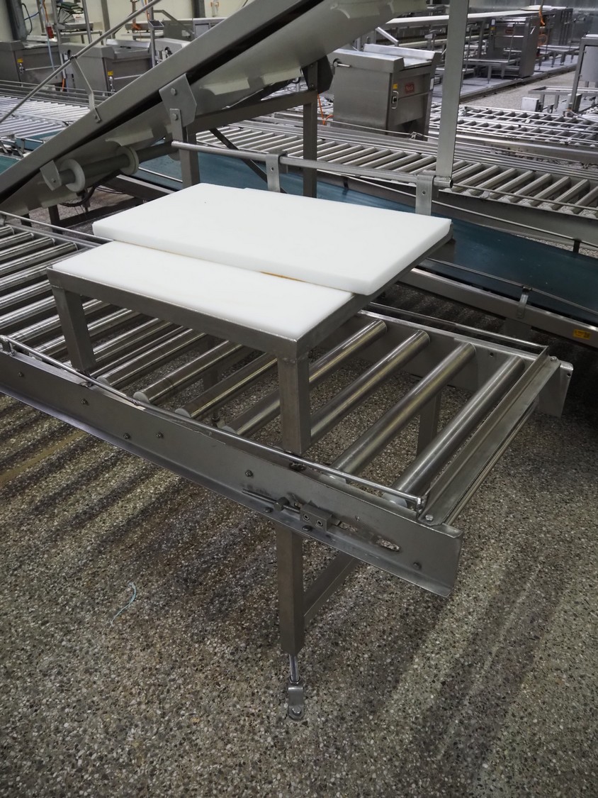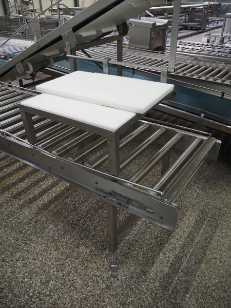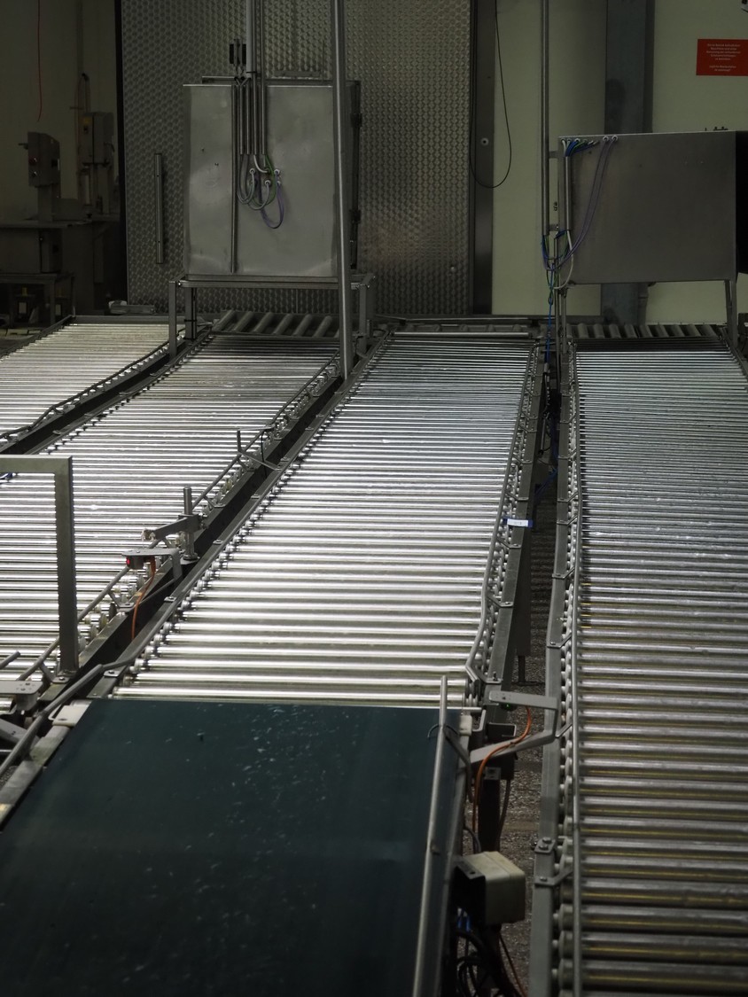 Itec / Attec four-lane roller conveyor, s/s rollers, roller width: (4x) 620 mm, total dimensions: (1x) 12000 mm x 1360 mm x 710 mm, (1x) 12000 mm x 720 mm x 710 mm, (2x) 7000 mm x 720 mm x 710 mm.