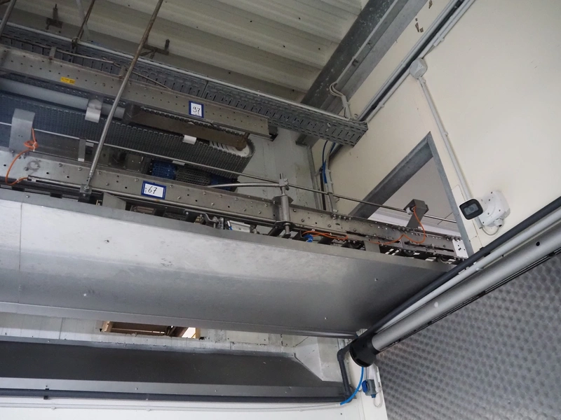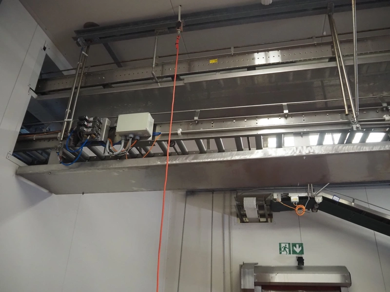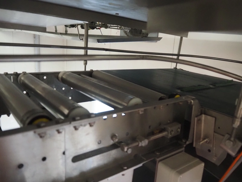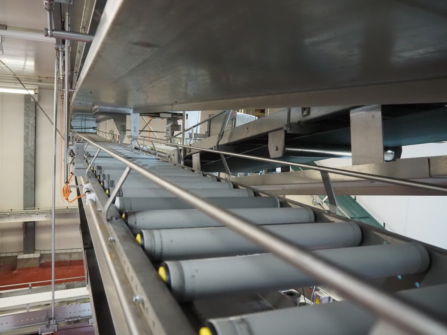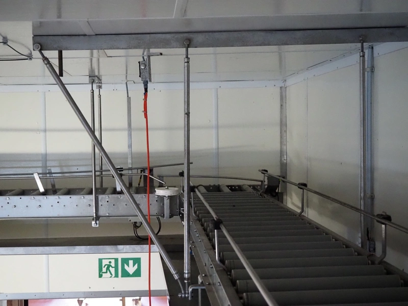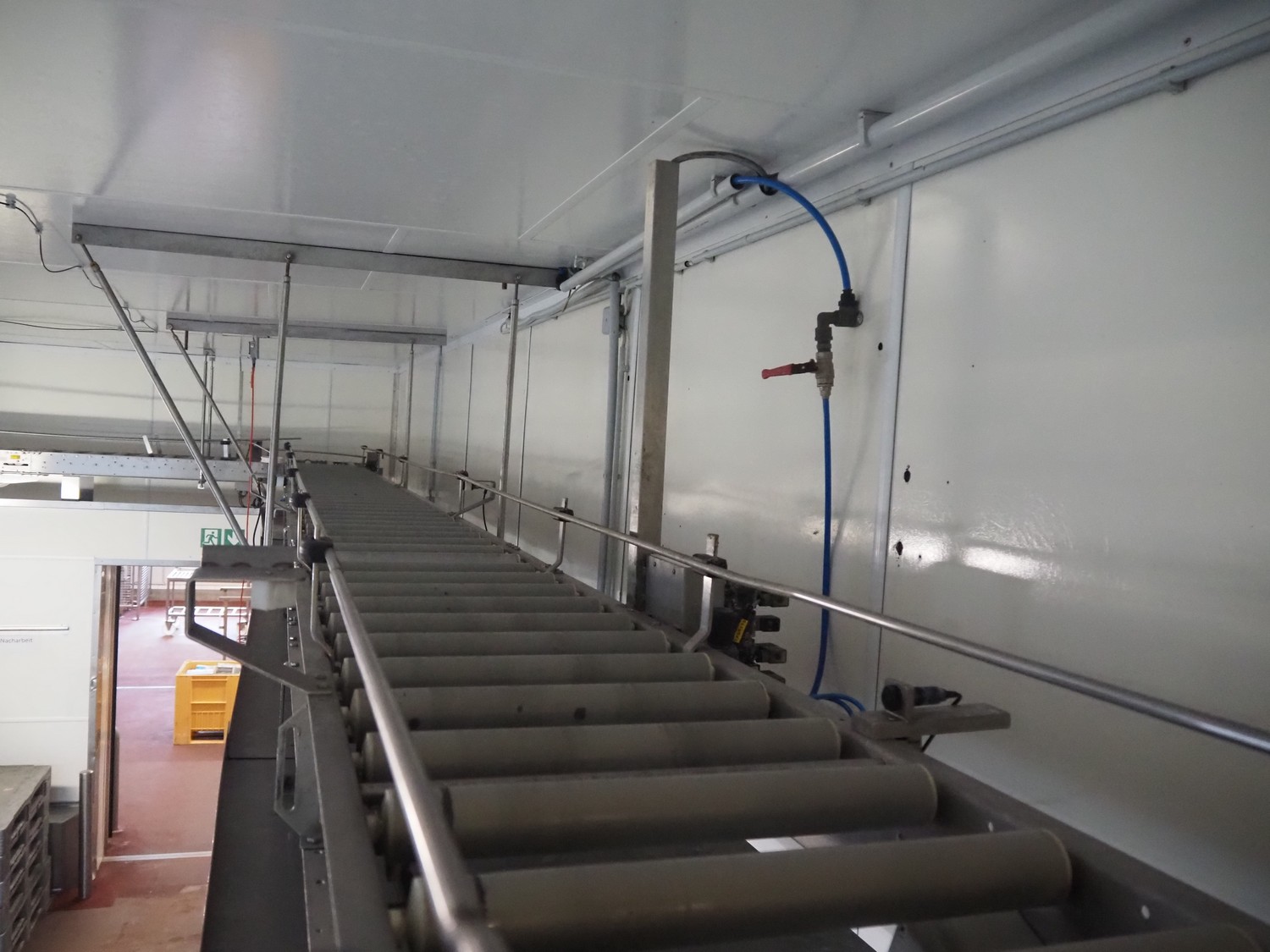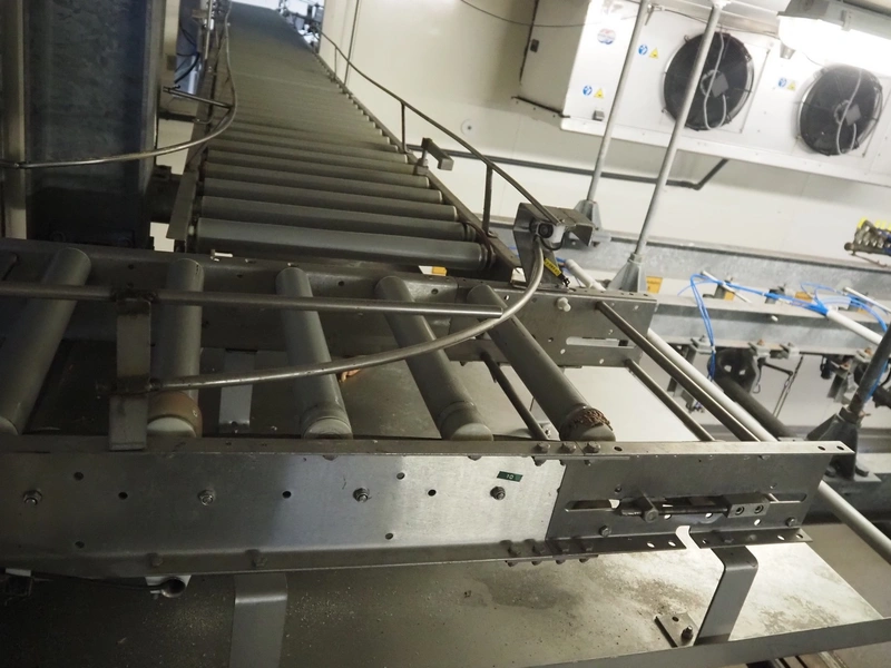 Itec / Attec roller conveyor, type: MDRI, serial number: 1402, year of construction: 1996, plastic rollers, roller width: 420 mm, total length: approximately 45 meters.
