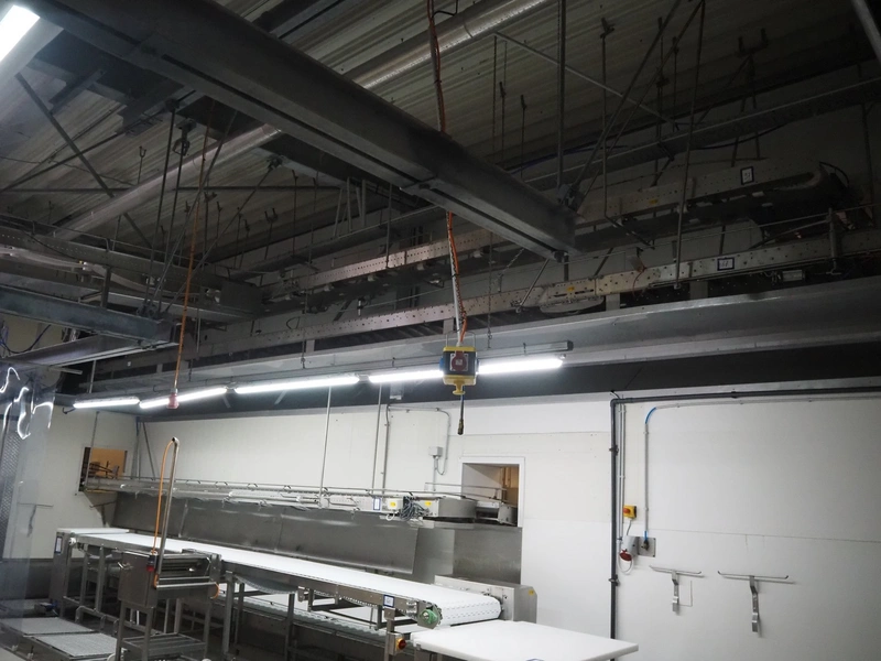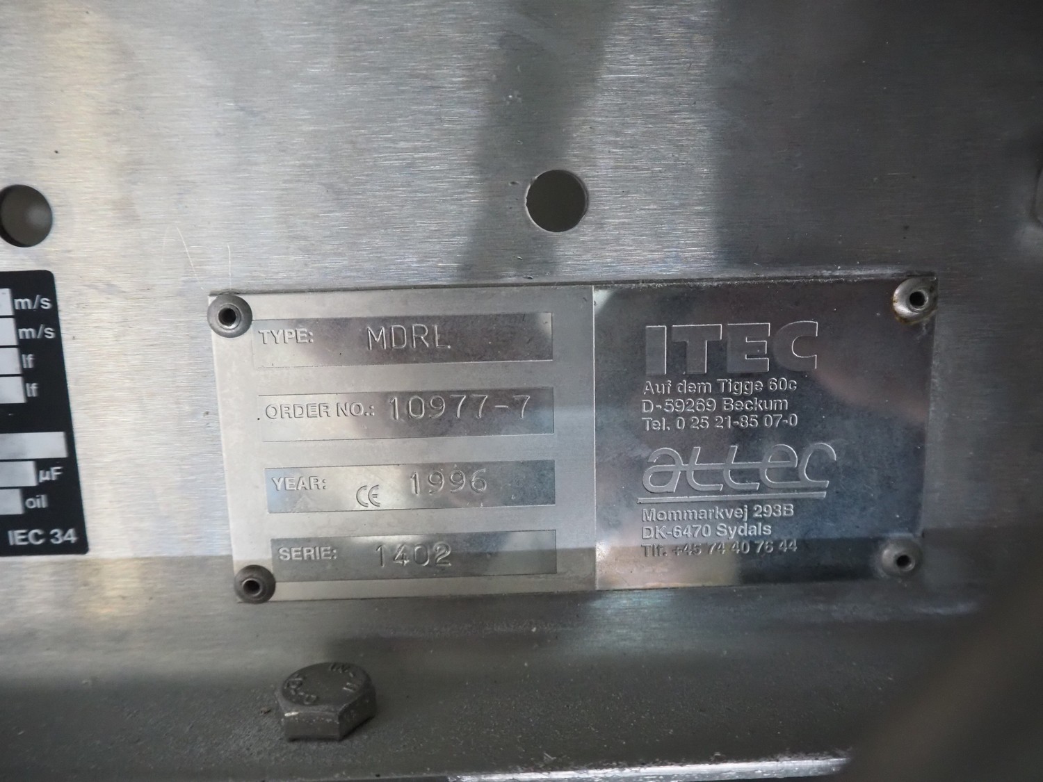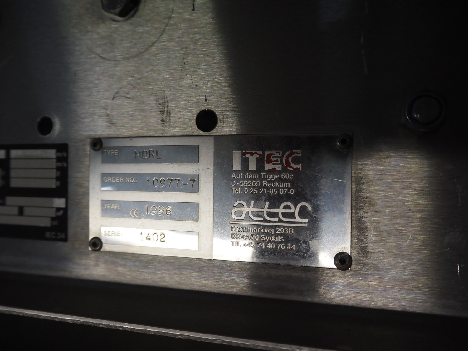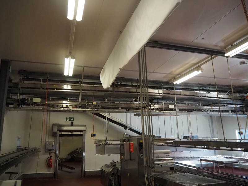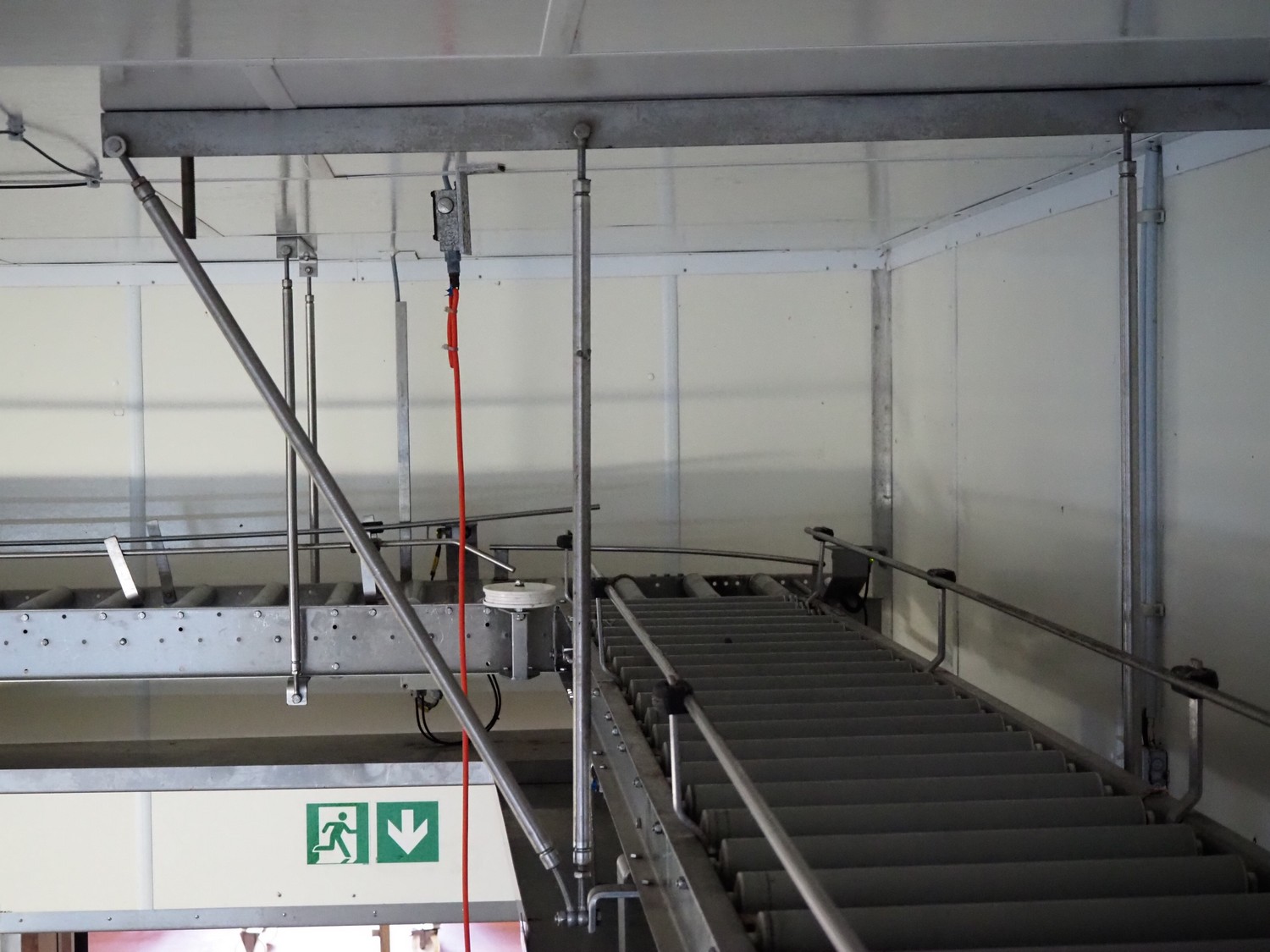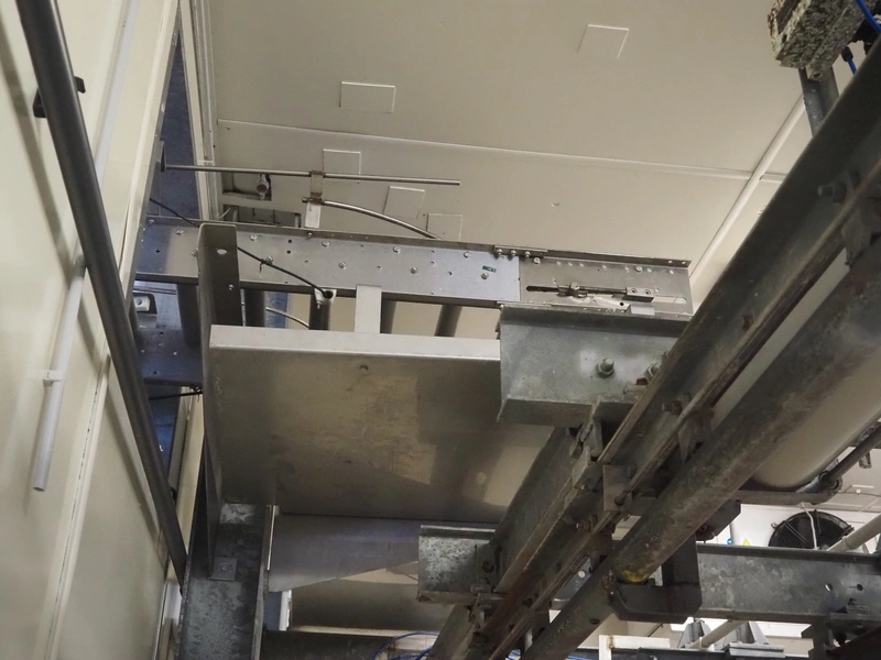 Itec / Attec roller conveyor, type: MDRI, serial number: 1402, year of construction: 1996, plastic rollers, roller width: 420 mm, total length: approximately 45 meters.