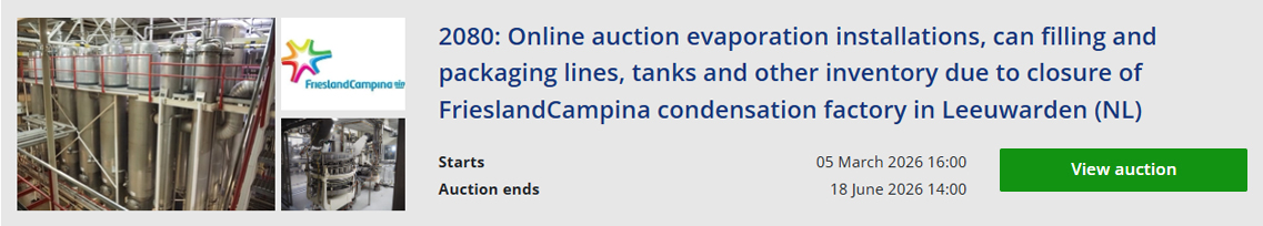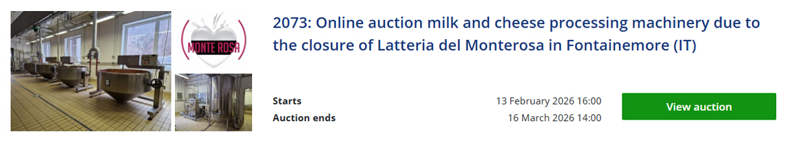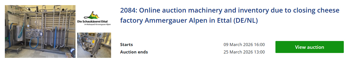 View our online auctions of dairy processing and packaging machinery below. The offer varies and new auctions are added regularly. Some auctions are fully focused on the dairy industry, while others feature various machines for multiple sectors, including dairy. Find machines and inventory for milk, cheese, yoghurt, butter and cream production.