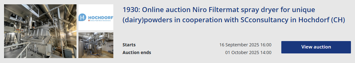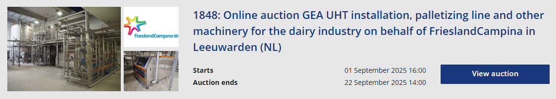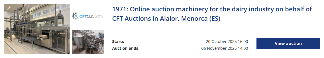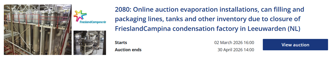 View our online auctions of dairy processing and packaging machinery below. The offer varies and new auctions are added regularly. Some auctions are fully focused on the dairy industry, while others feature various machines for multiple sectors, including dairy. Find machines and inventory for milk, cheese, yoghurt, butter and cream production.