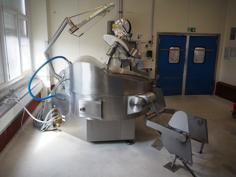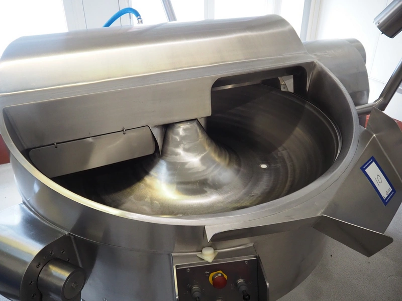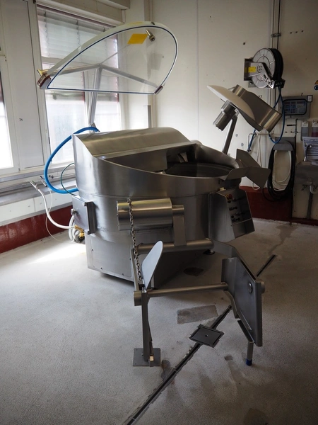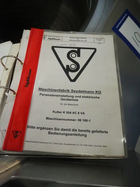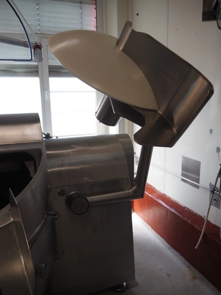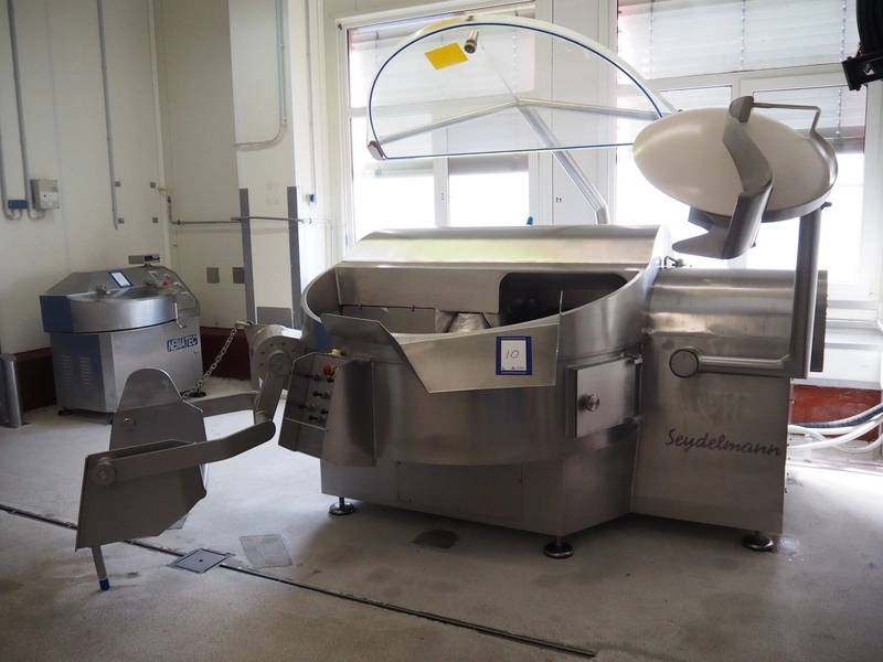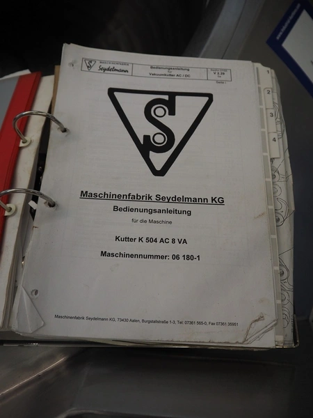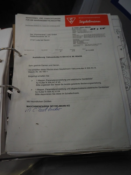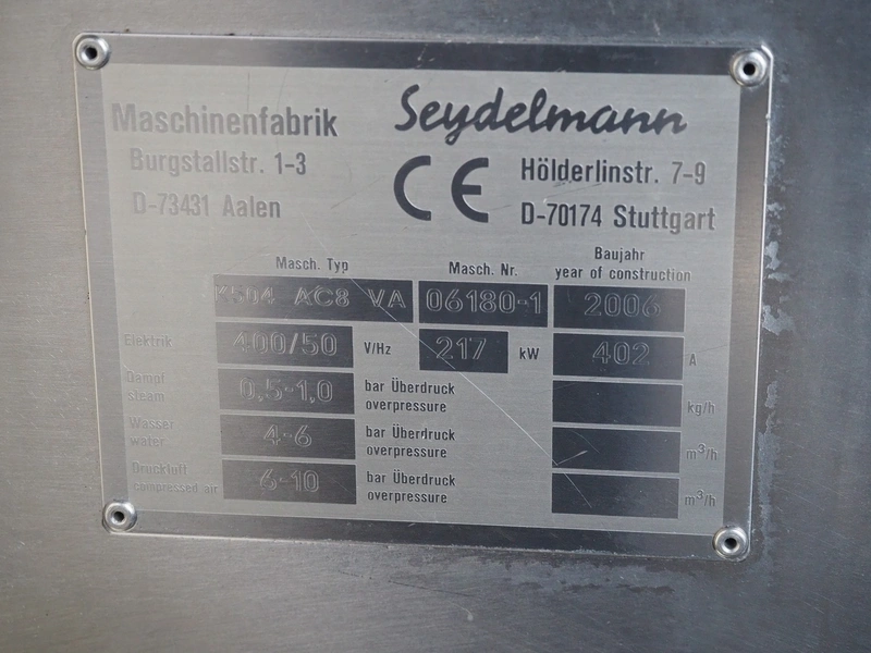 Seydelmann vacuum cutter with lifter for 200 liter meat bins and ejector, type: K504 AC8 VA, machine number: 06180-1, year of construction: 2006, 400 V, 50 Hz, 402 A, 217 kW, s/s bowl, volume: 500 liter, dimensions: 3500 mm x 3100 mm x 2200 mm, dimensions control panel: 470 mm x 90 mm x 320 mm, dimensions switch cabinet: 1600 mm x 550 mm x 2800 mm. Including pallet with extra cutter knives, dimensions: 1200 mm x 800 mm x 700 mm.