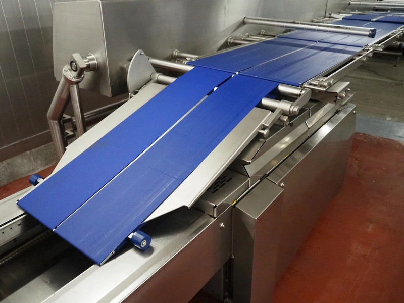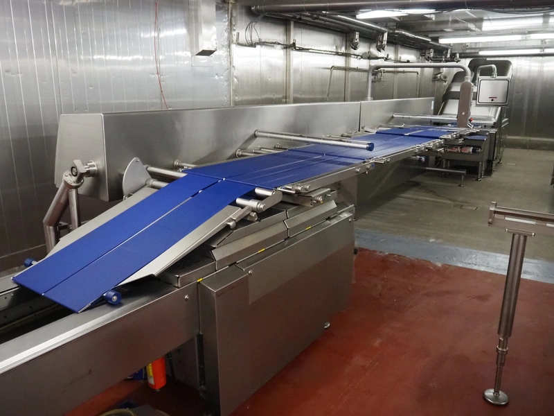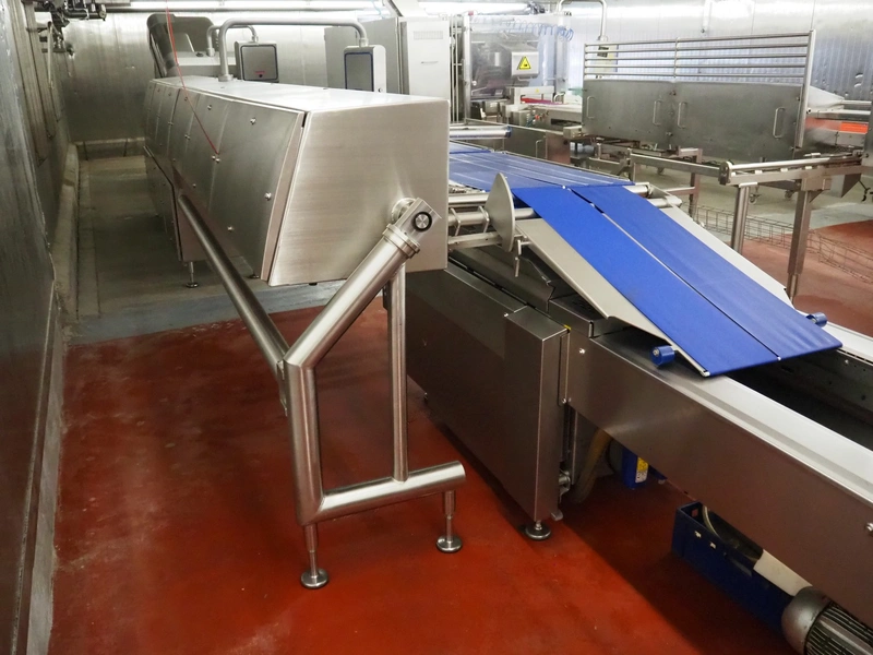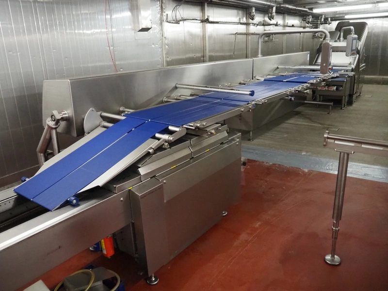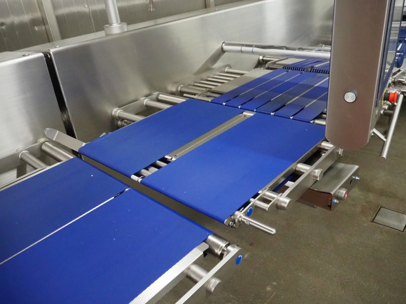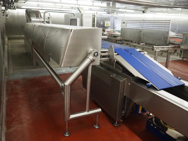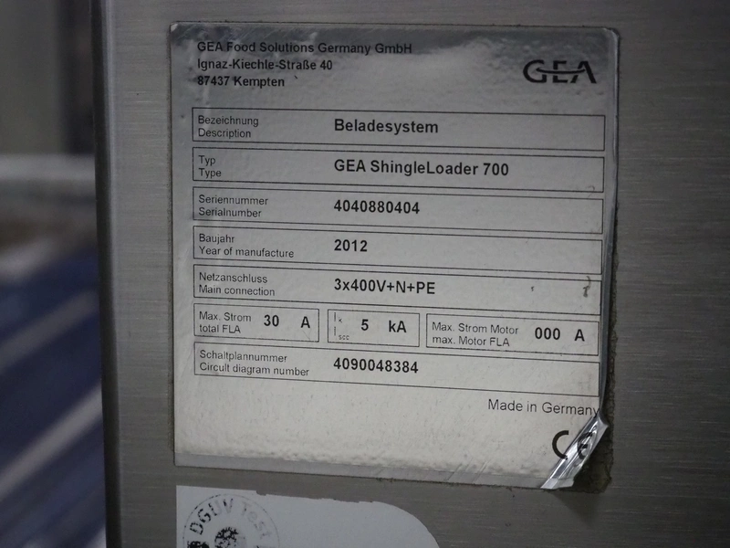 - GEA outfeed belt, type: GEA ShingleLoader 700, serial number: 4040880404, year of construction: 2012, 400 V, 3 Ph, 30 A, plastic belt, belt width: (11x) 350 mm, (6x) 80 mm, plastic wire belt, belt width: (1x) 480 mm, (2x) 260 mm, total dimensions: 8370 mm x 1800 mm x 2100 mm.