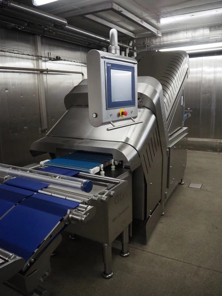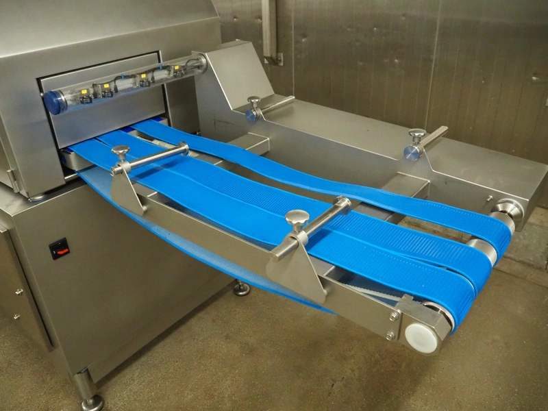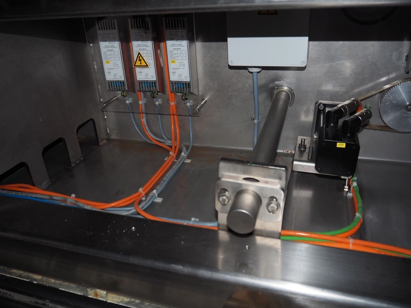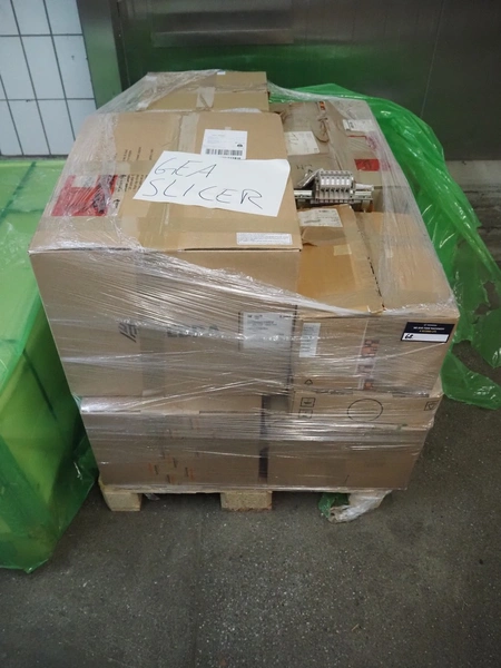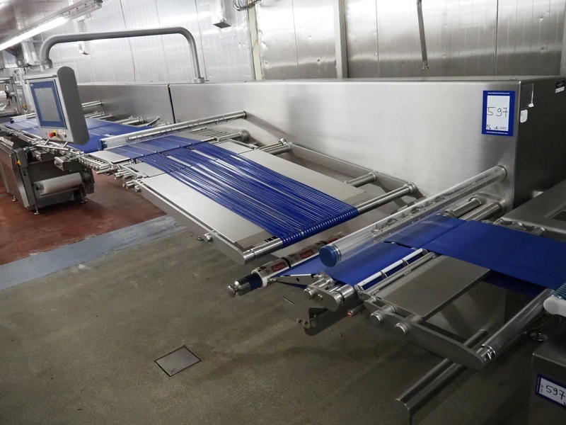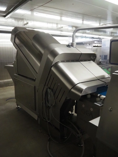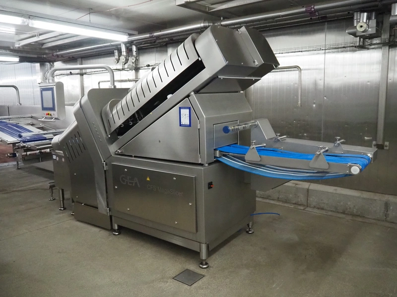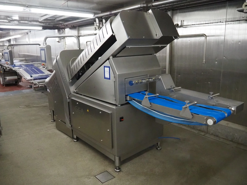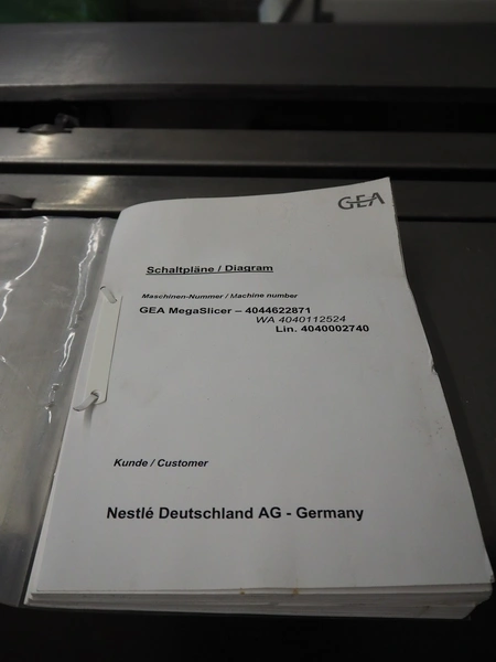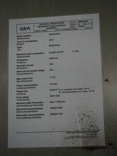 - Gea slicer, type: MegaSlicer, serial number: 4044622871, year of construction: 2012, 400 V, 3 Ph, 50/60 Hz, 23 A, 15.5 kW, plastic infeed belt, belt width: (3x) 100 mm, clearance: 530 mm x 230 mm, wire belt width: 500 mm, total dimensions: 4050 mm x 1200 mm x 2450 mm.