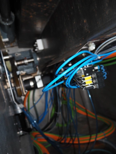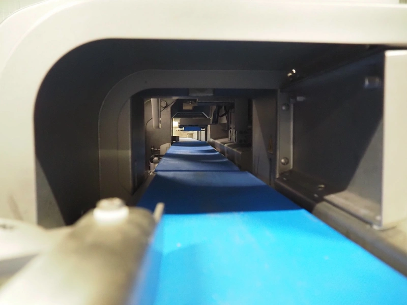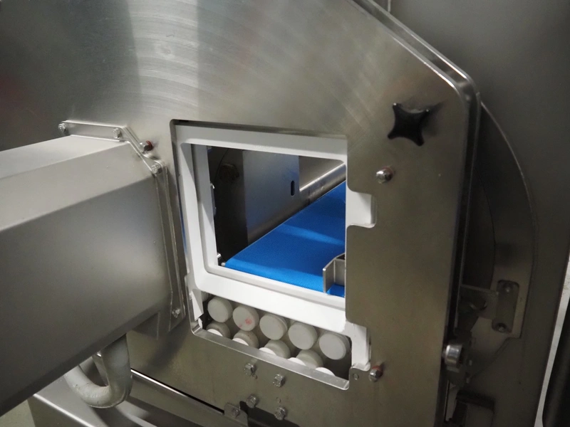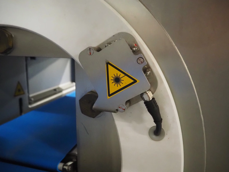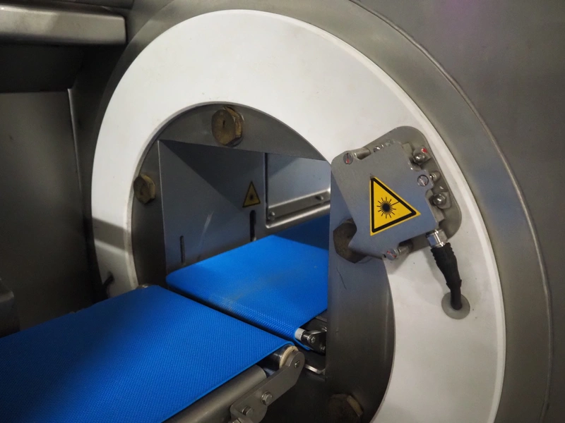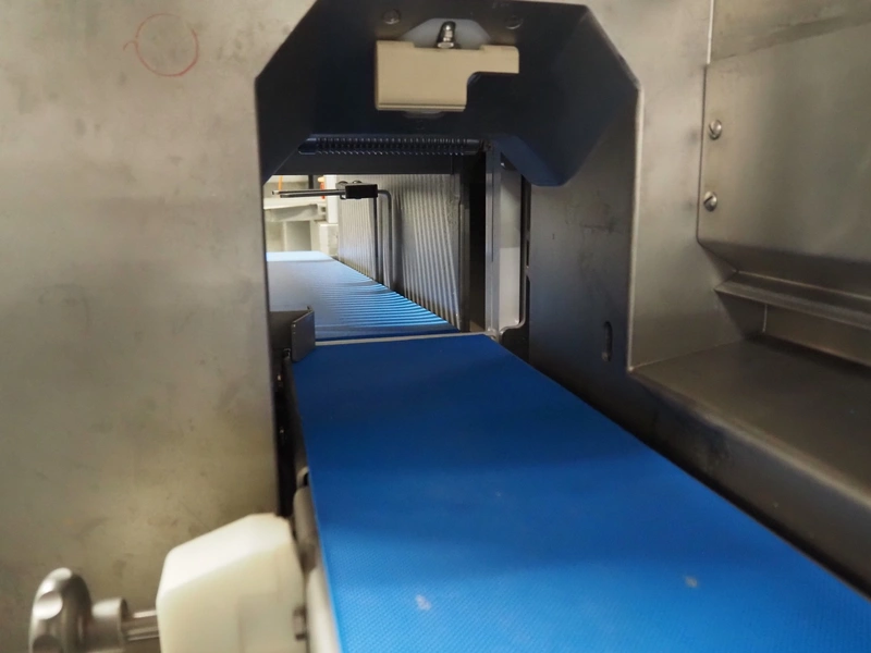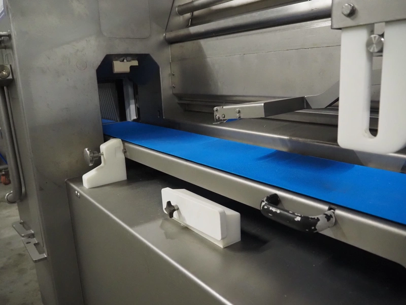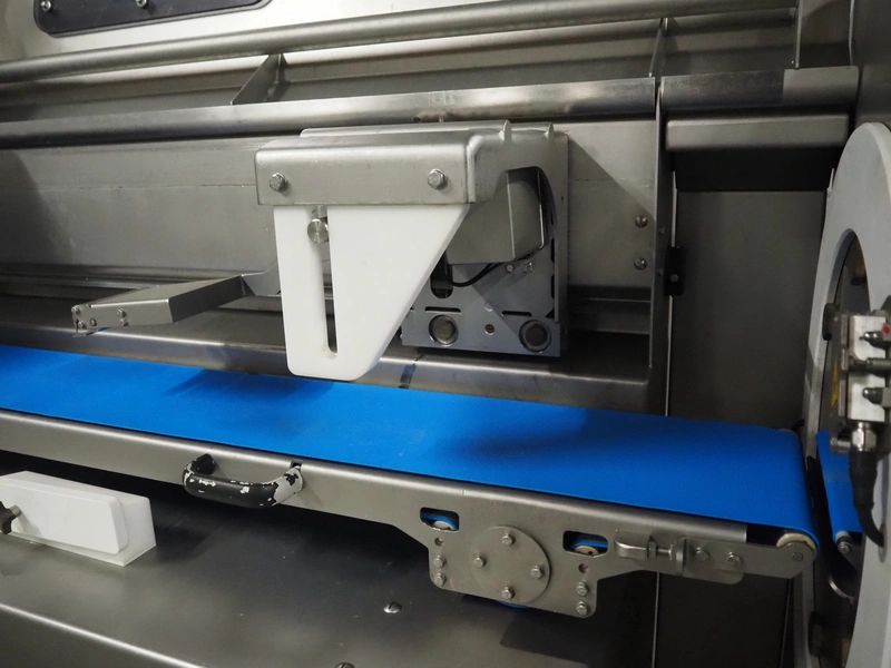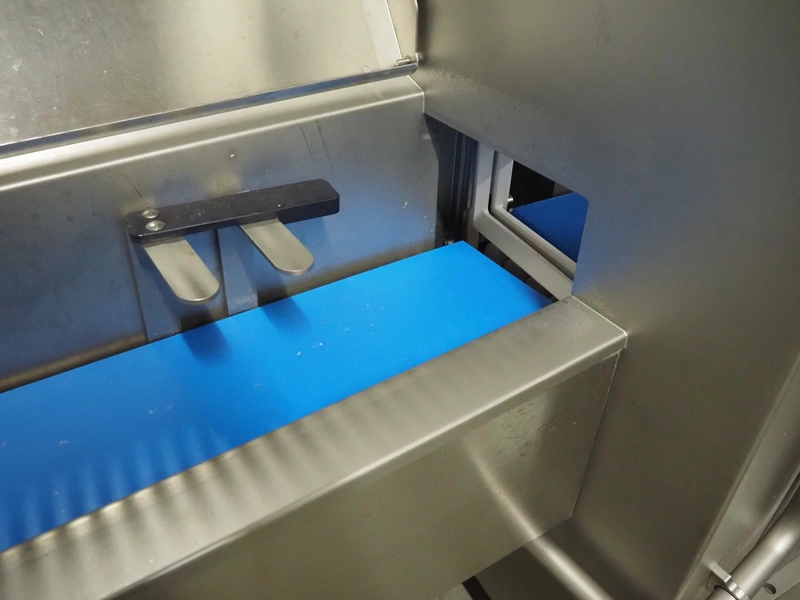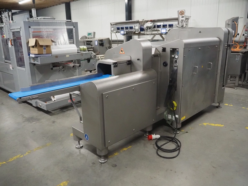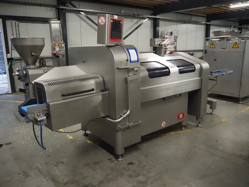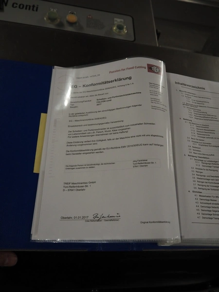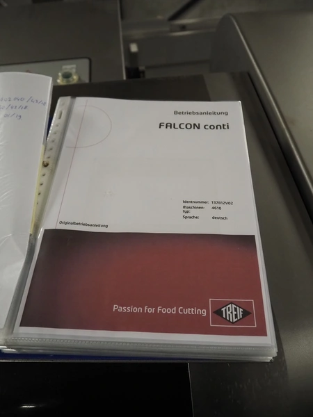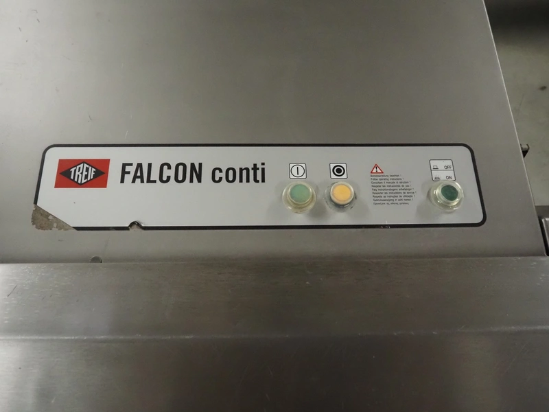 Treif Maschinenbau GmbH slicer and portion cutter, model: FALCON conti, machine number: 461005.154538.110208, year of construction: 2011, 380-480 V, 3 Ph, 50/60 Hz, 32 A, 8.6 kW, weight: 750 kg, plastic belt, belt width: 220 mm, clearance: 290 mm x 180 mm, total dimensions: 4630 mm x 1300 mm x 1900 mm.
