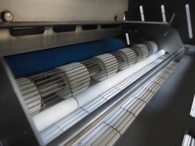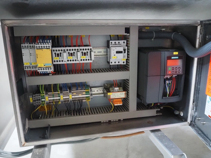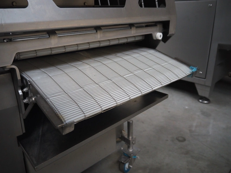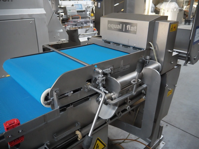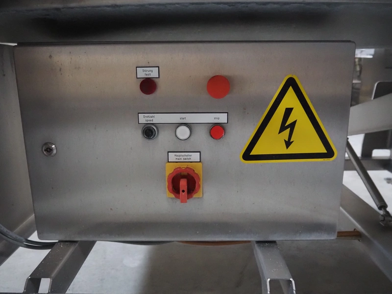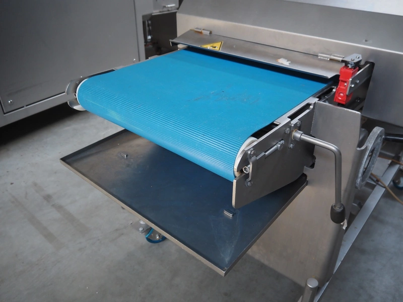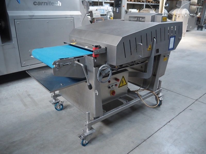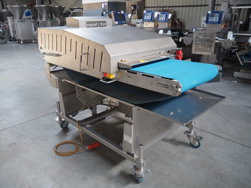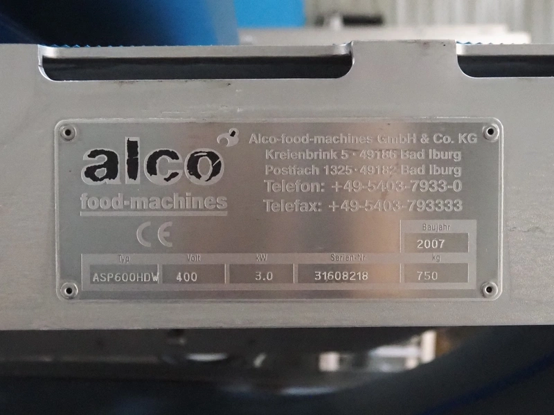 Alco food-machines GmbH & Co. KG mobile flattener, type: ASP600HDW, serial number: 31608218, year of construction: 2007, 400 V, 3.0 kW, machine weight: 750 kg, plastic belt, belt width: (2x) 600 mm, s/s mesh belt, belt width: 600 mm, clearance: 600 mm x 45 mm, total dimensions: 2000 mm x 1050 mm x 1410 mm.