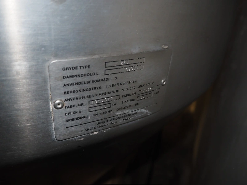 Jøni Foodline A/S cooking vessel, type: H250, number: 9336027, year of construction: 1997, 380/220 V, 3 Ph, 50 Hz, 80 A, 45 kW, volume: 250 liter, dimensions: 1800 mm x 1100 mm x 1400 mm.