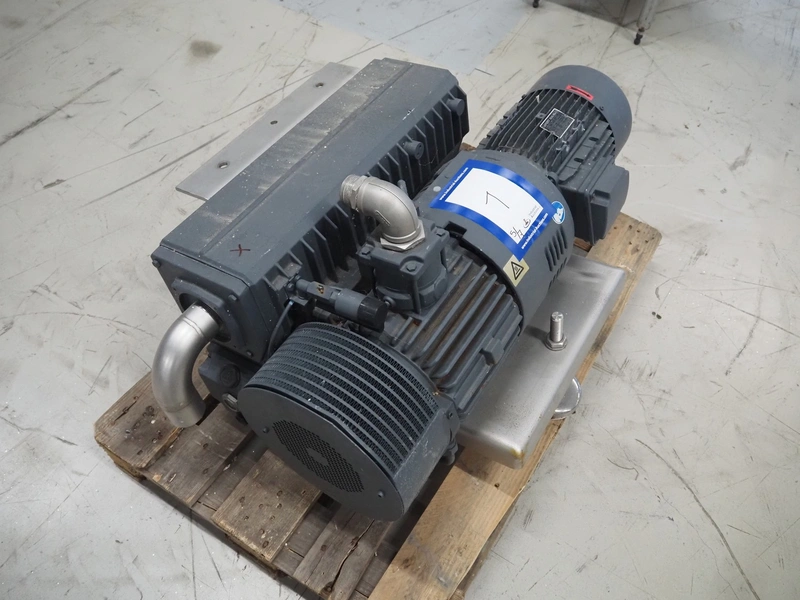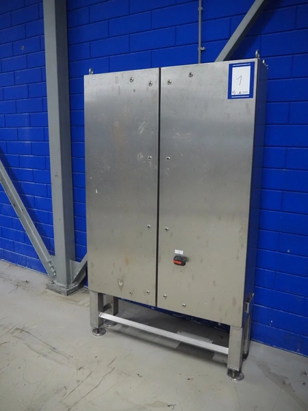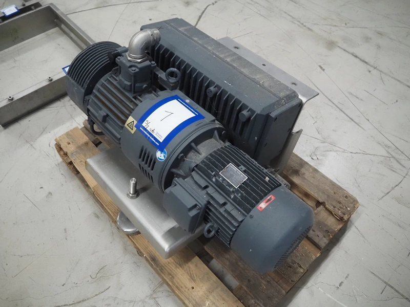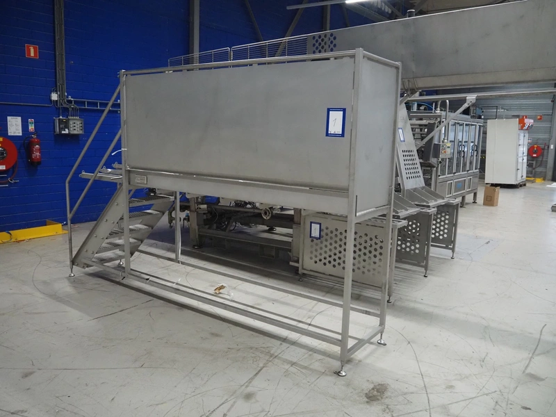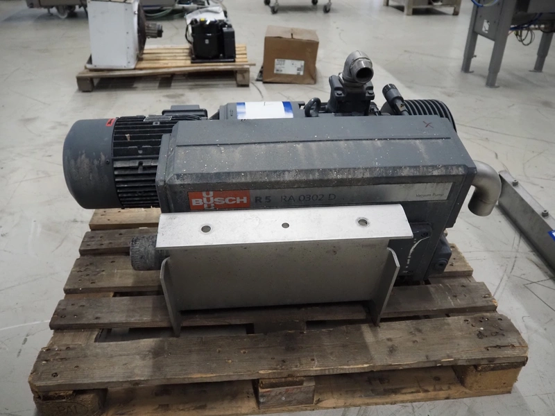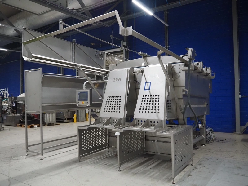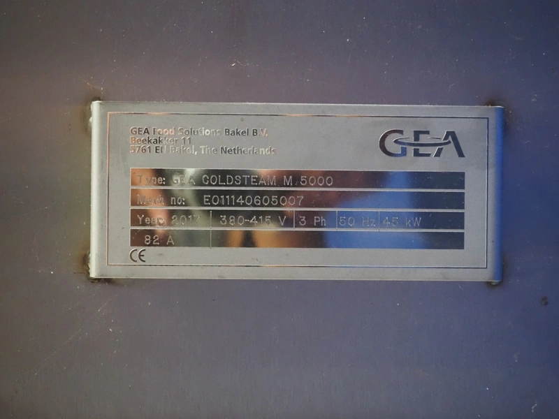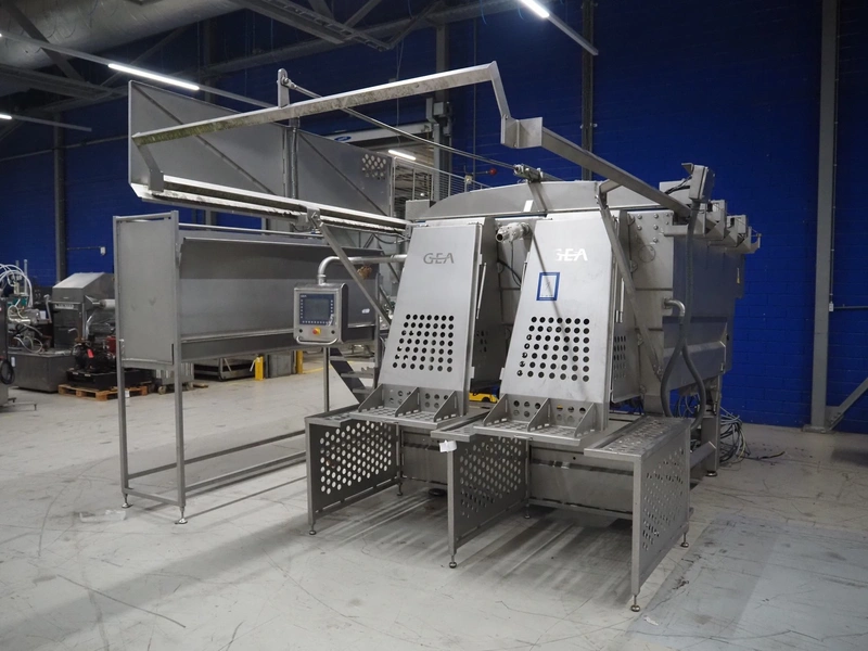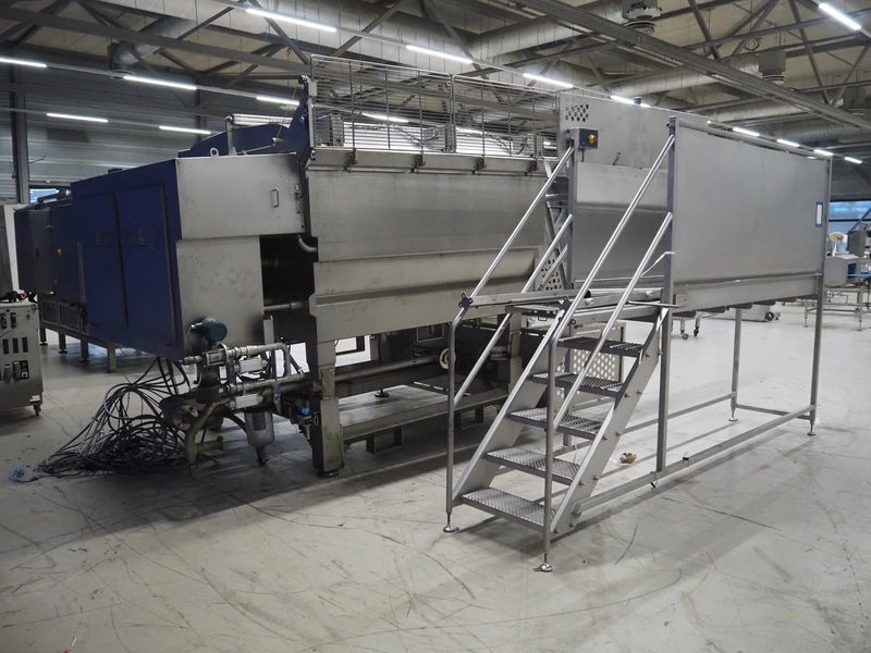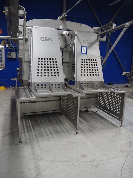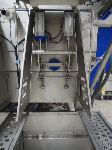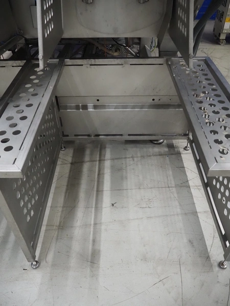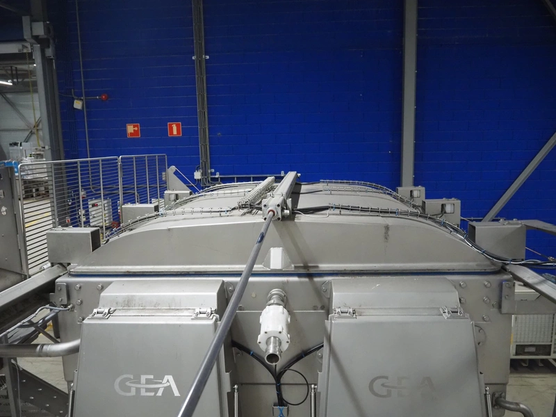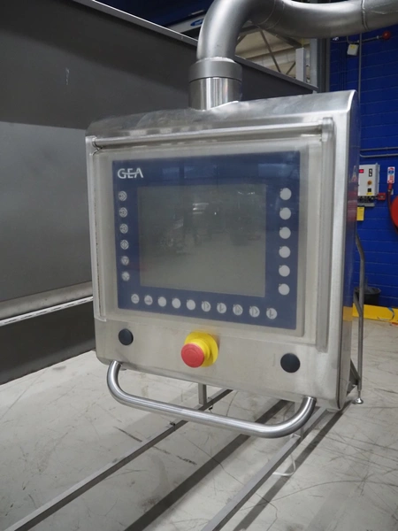 GEA Food Solutions vacuum mixer on weighing cells for tempering frozen meat, type: GEA Coldsteam M 5000, machine number: E011140605007, year of construction: 2017, 380-415 V, 3 Ph, 50 Hz, 82 A, 45 kW, volume: 5000 liter, dimensions: 5700 mm x 2600 mm x 2800 mm. With s/s platform, dimensions platform: 3600 mm x 700 mm x 2300 mm, s/s switch cabinet, dimensions: 1200 mm x 480 mm x 2100 mm, and Busch vacuum pump, type: RA 0302, capacity: 300 m³ per hour, dimensions: 1200 mm x 800 mm x 700 mm.