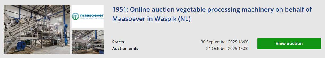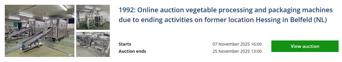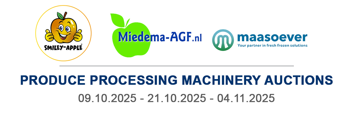 View our online auctions of fresh produce processing and packaging machinery below. The selection varies and new auctions are added regularly. Some auctions are fully focused on the fruit and vegetable industry, while others feature various machines for multiple sectors, including fresh produce. Find machines and inventory for fruits and vegetable production.